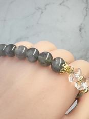 個性的な柄のケセラストーンに、ピンクやパープルの入った品質が良い、優しいラブラドライトを合わせ、ポイントに水晶を組むことにより、二つの石の良さをパワーアップさせるように作りました。