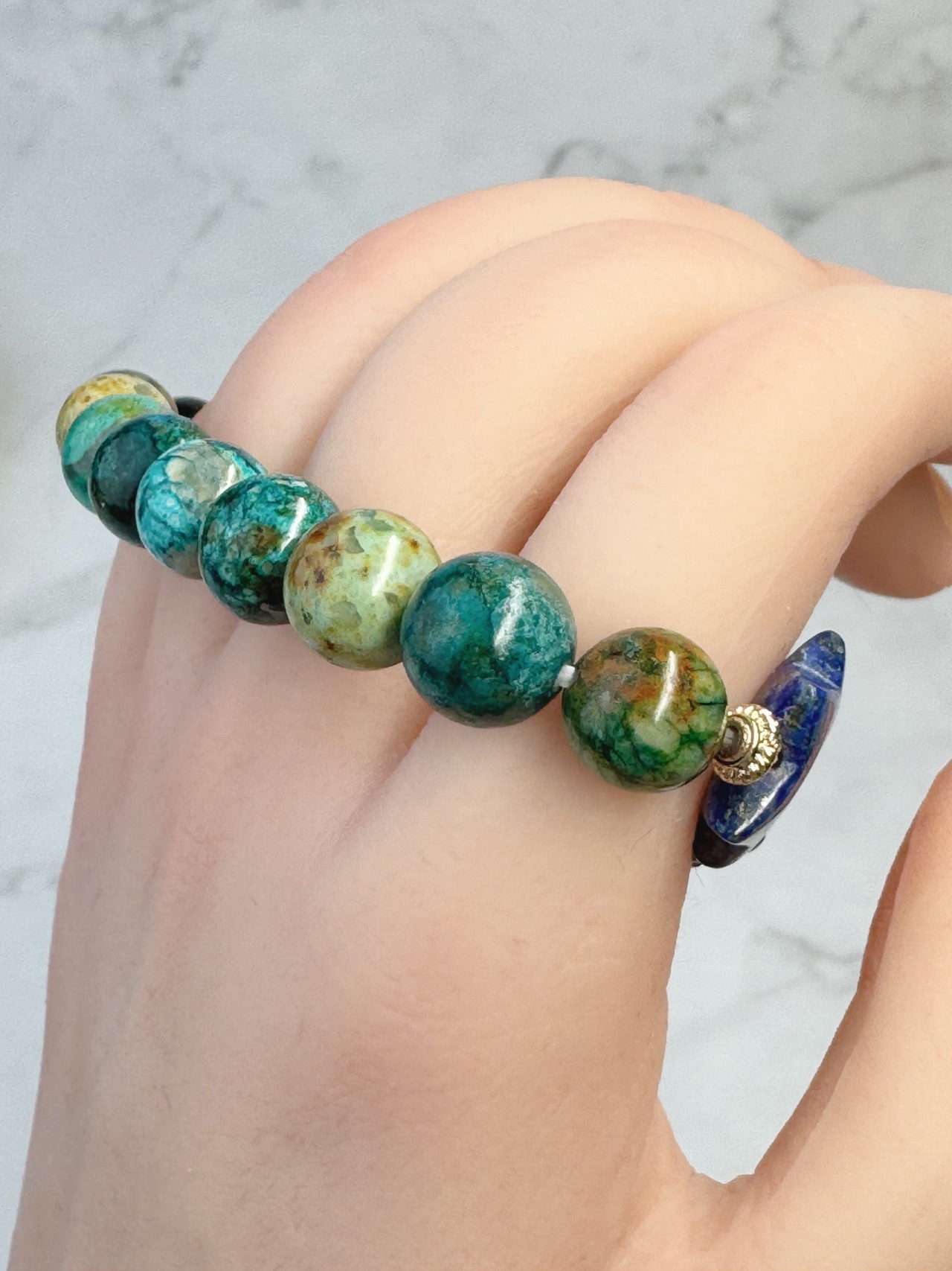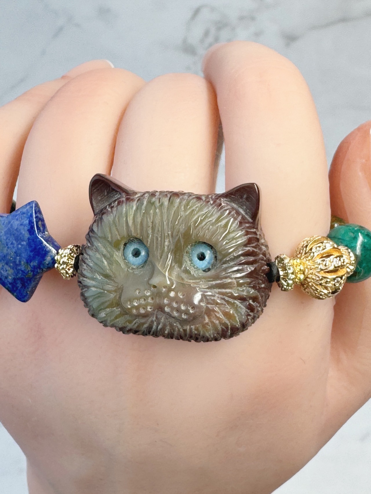 アラシャンアゲートの猫、ラピスラズリの星、クリソコラのブレスレットになります。