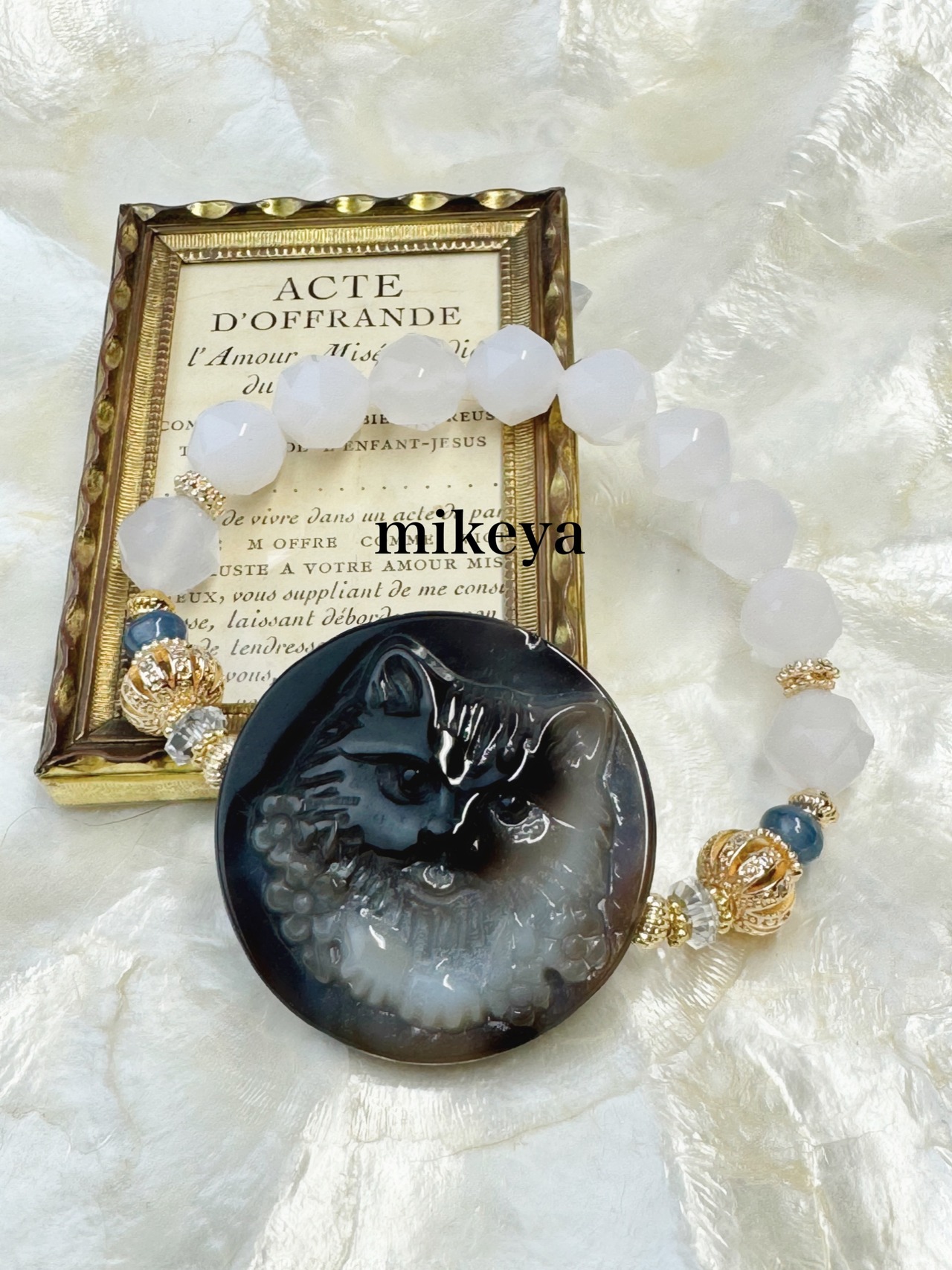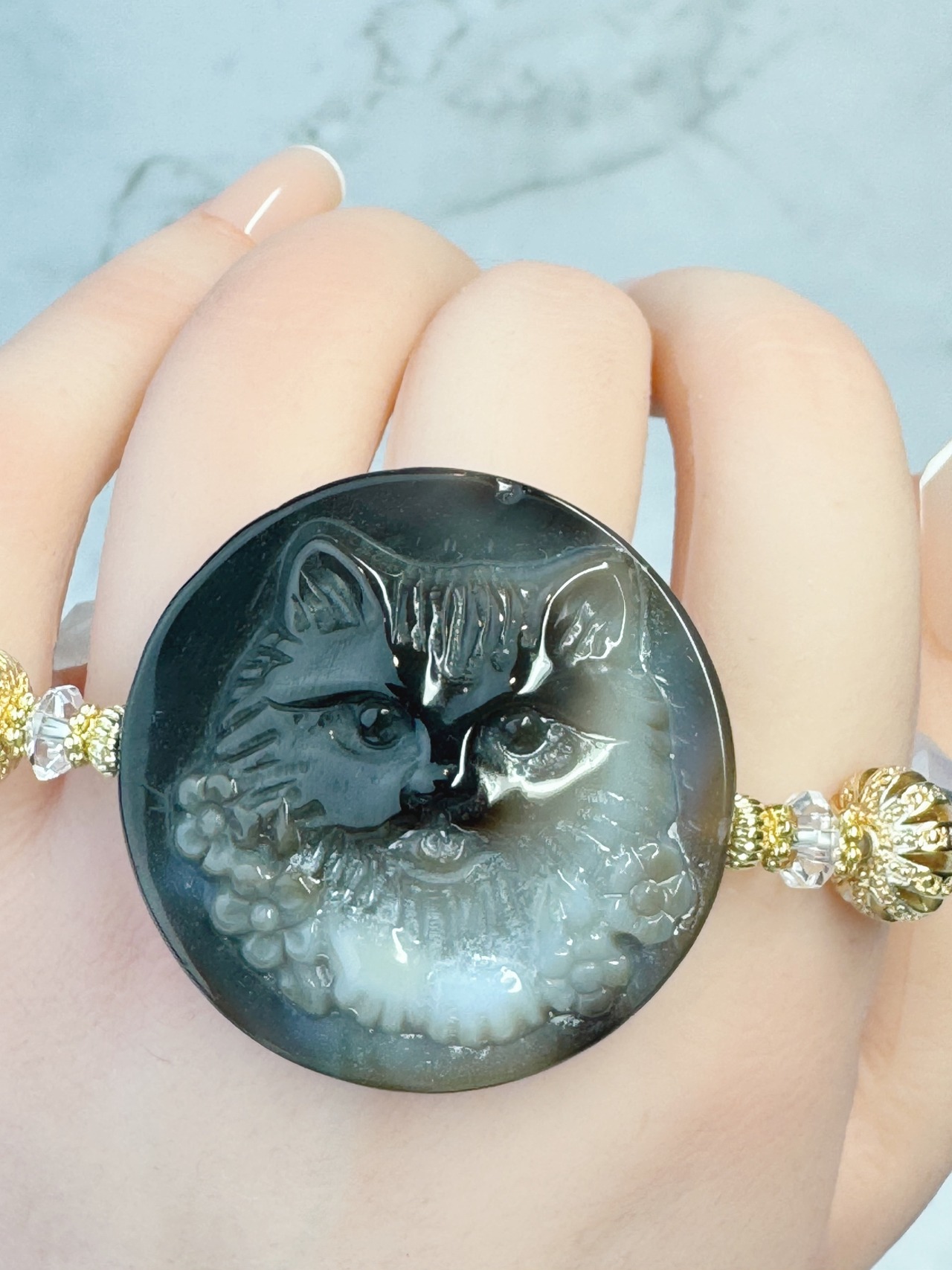 瑪瑙の猫、カルセドニー、カルサイト、水晶を使ったブレスレットです。