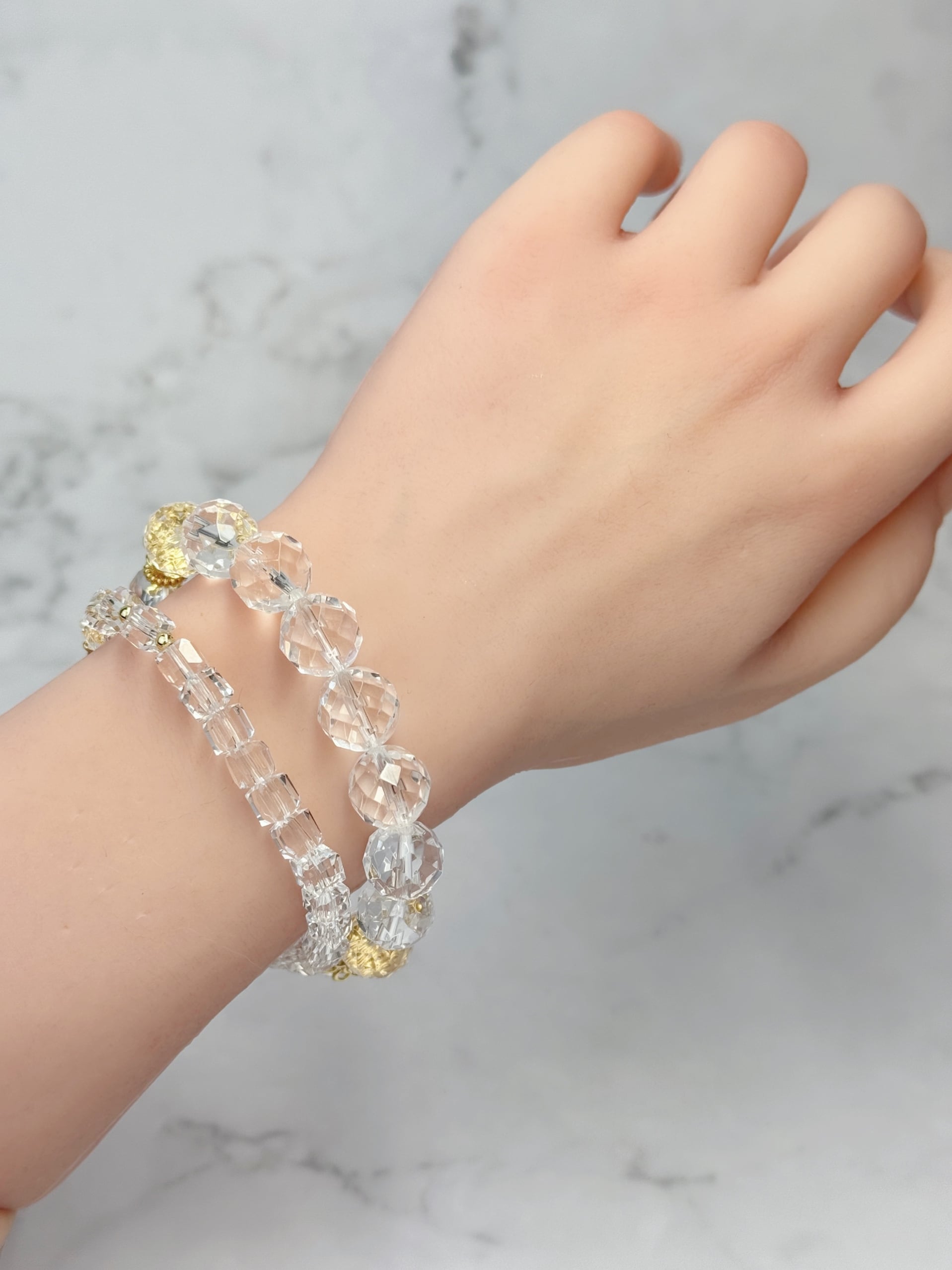 上品な水晶の輝きは、どんな装いにも馴染み、手元を綺麗に演出してくれる。そんなブレスレットです。