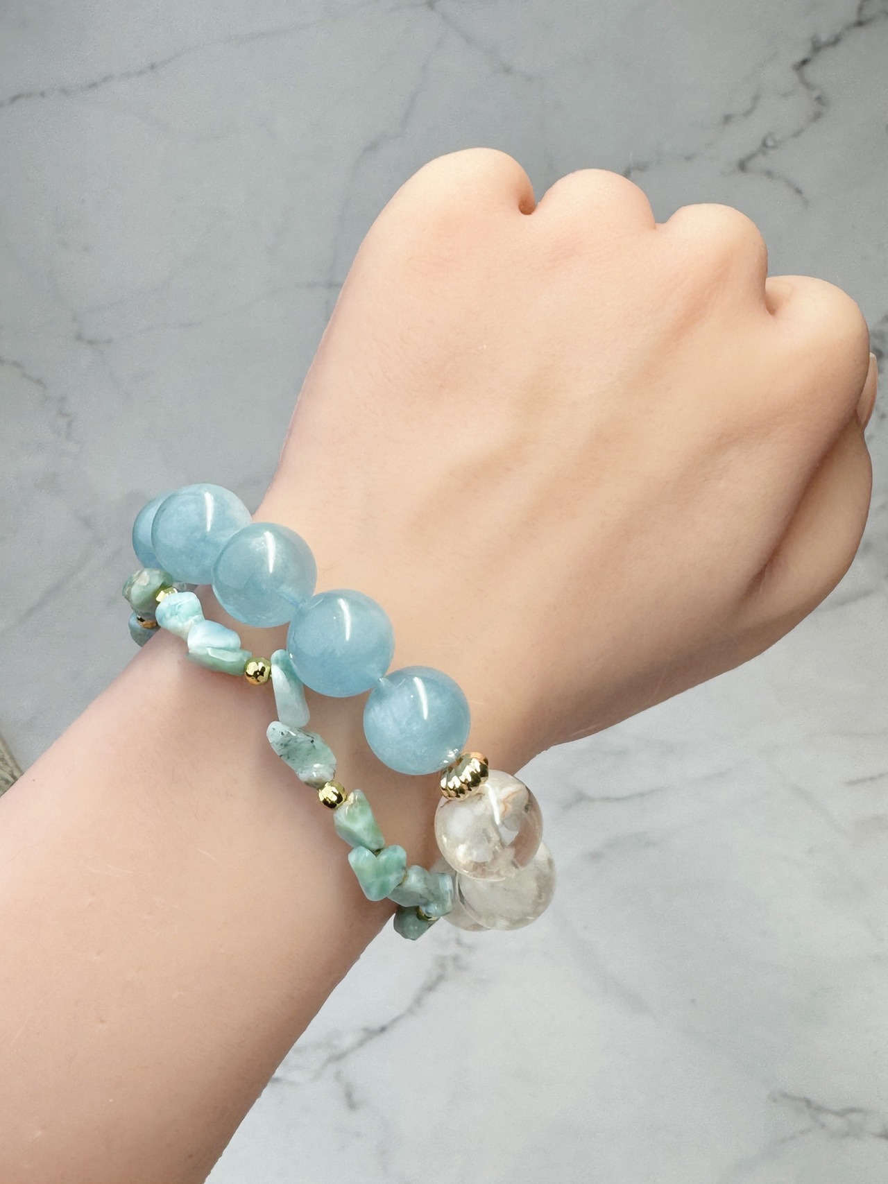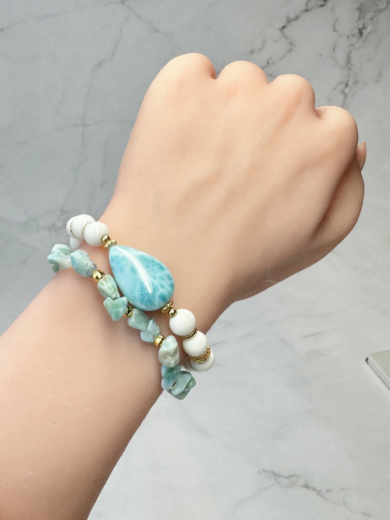 ラリマーの穏やかなブルーが、さりげなく手元を彩ります。重ね付け用に作ってみました。