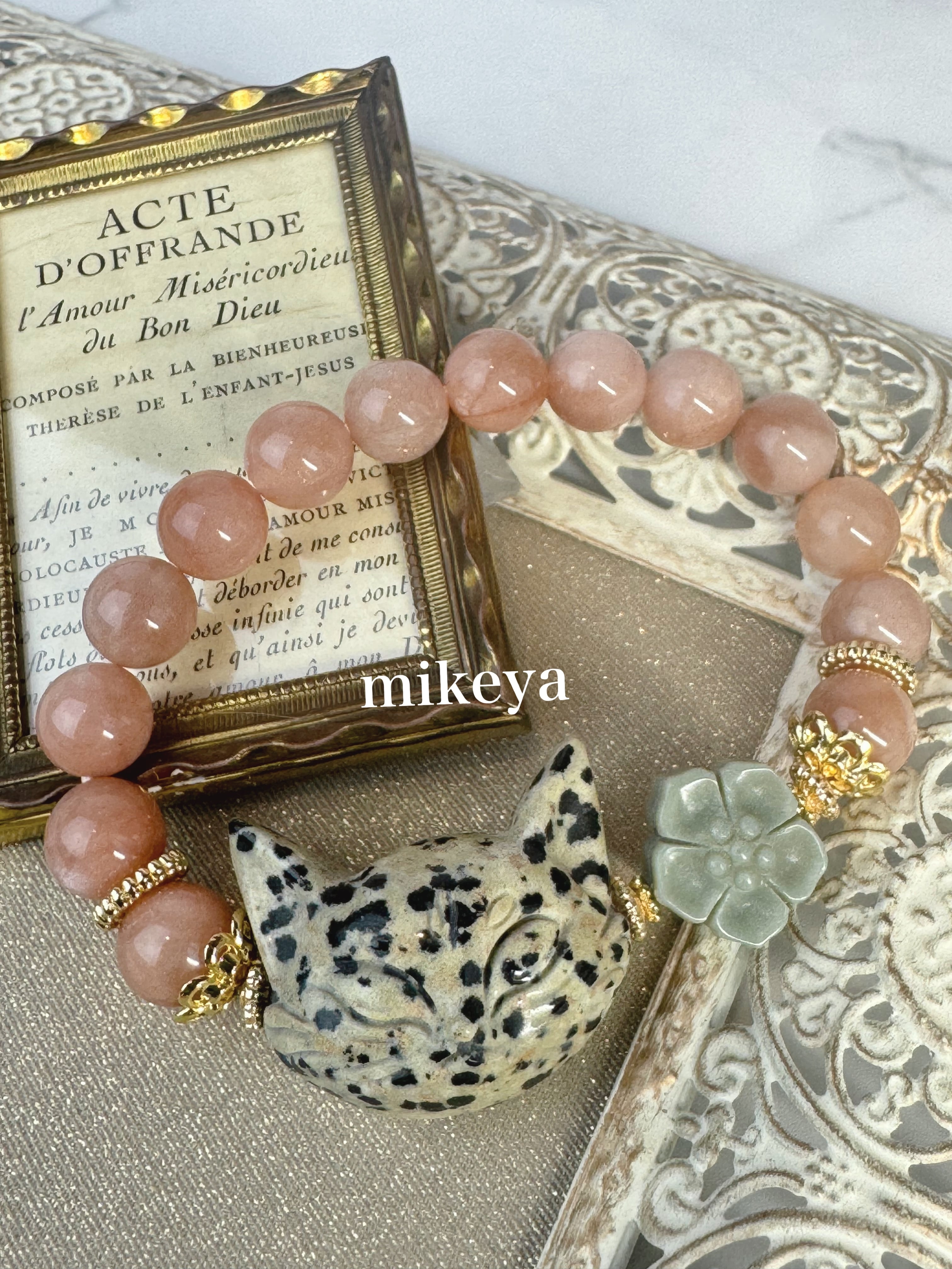 #天然石ブレスレット#パワーストーン#ダルメシアンジャスパー#アラシャンアゲート #ピーチムーンストーン#癒しのブレスレット #心の安定 #自分軸を整える #穏やかなエネルギ-#ネコ#ネコブレスレット#MIKEYA