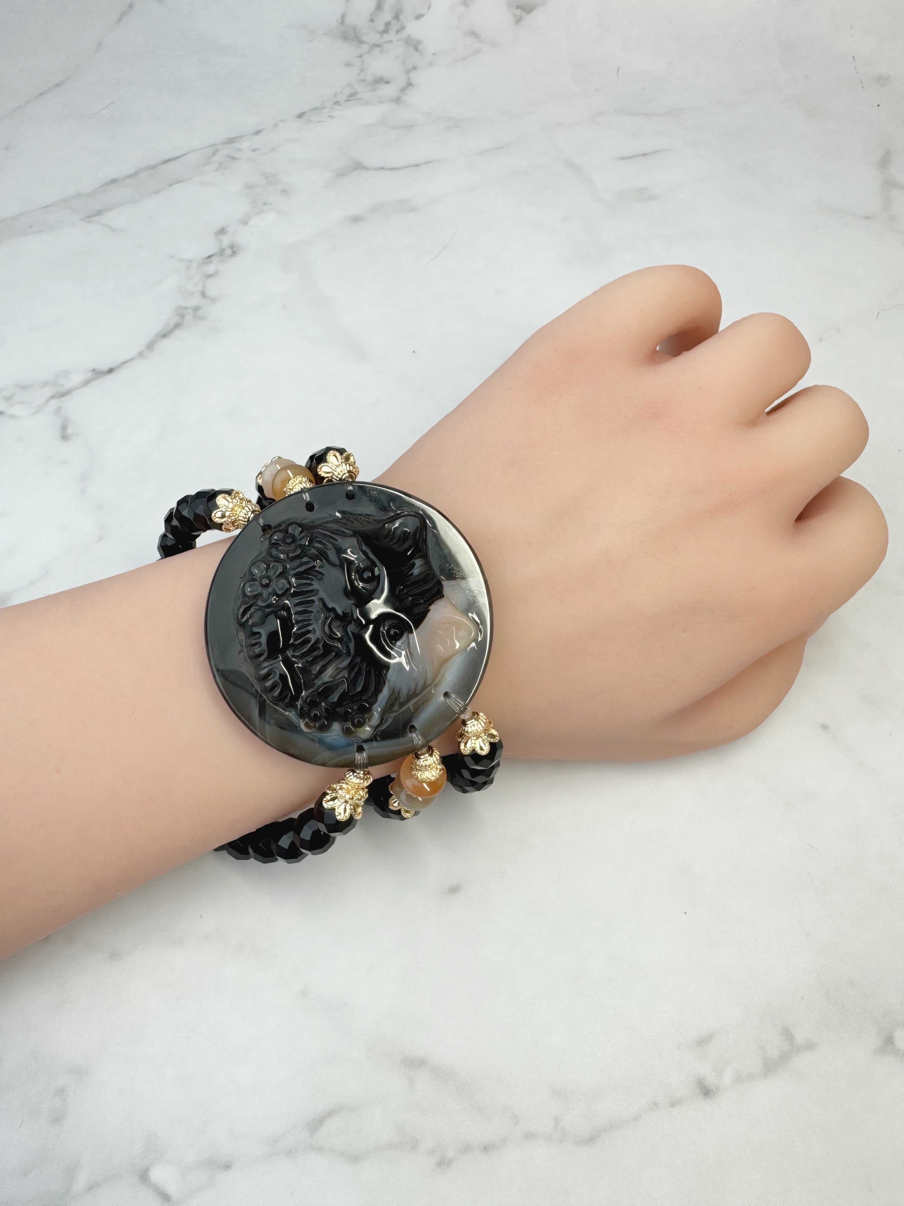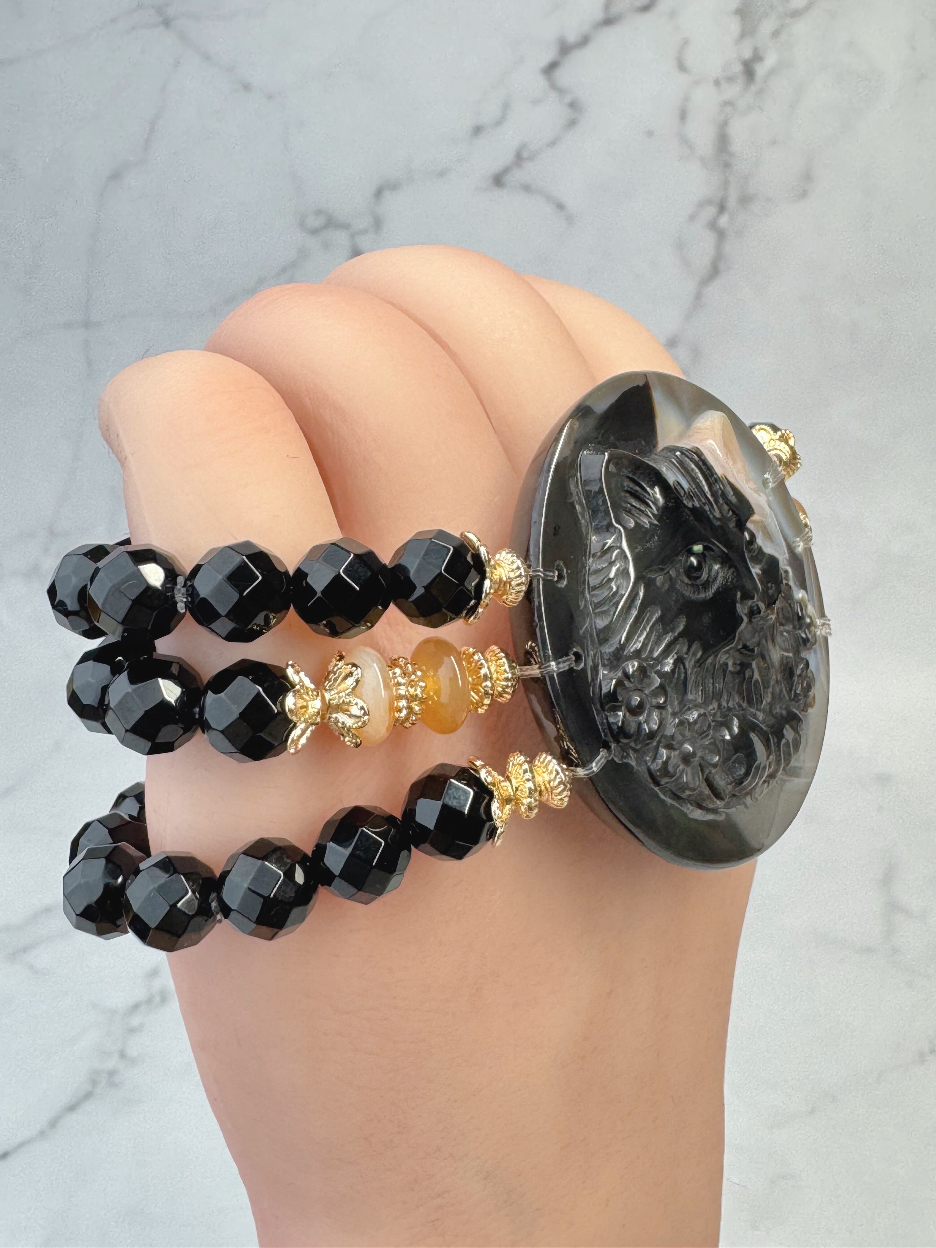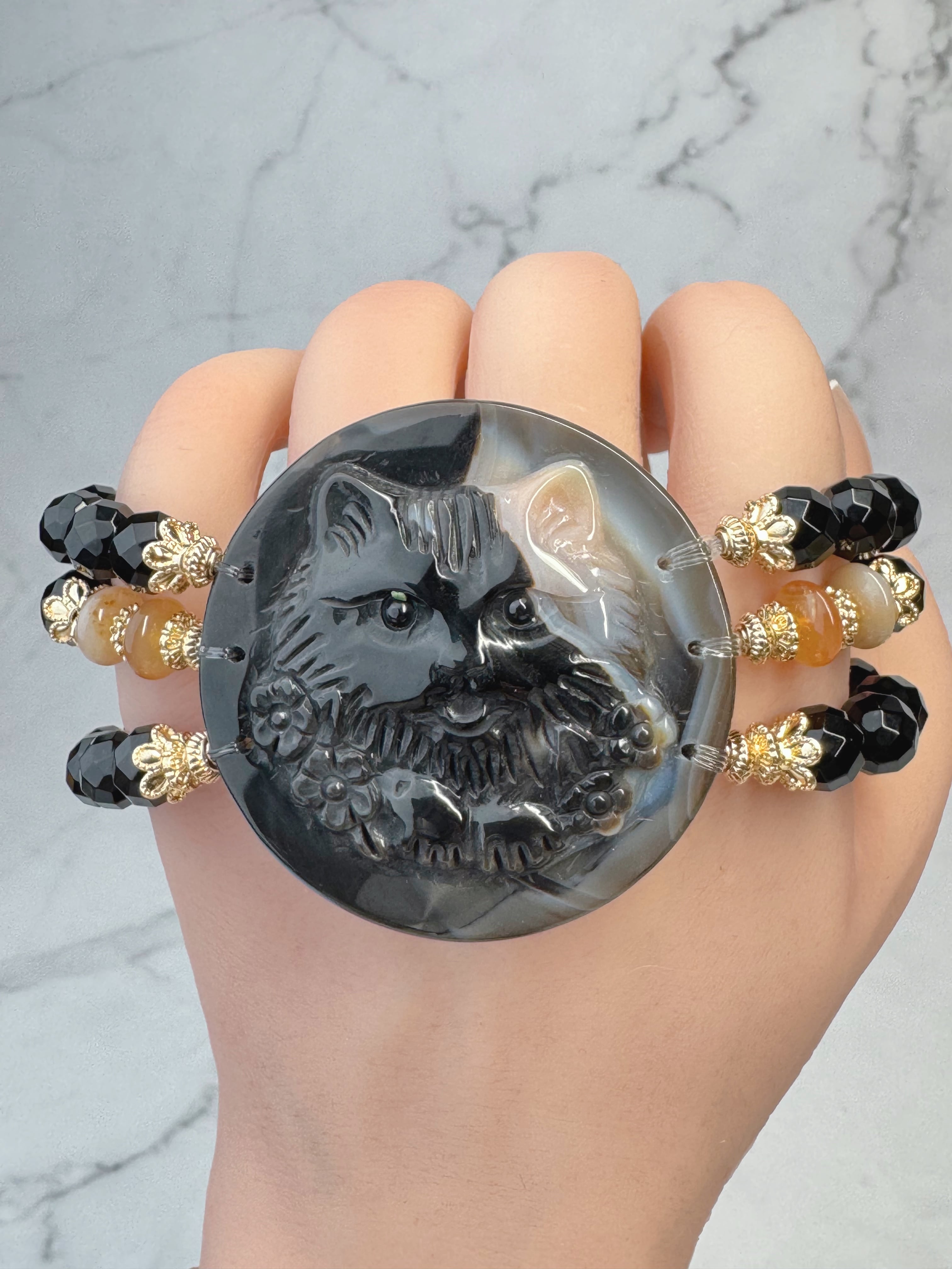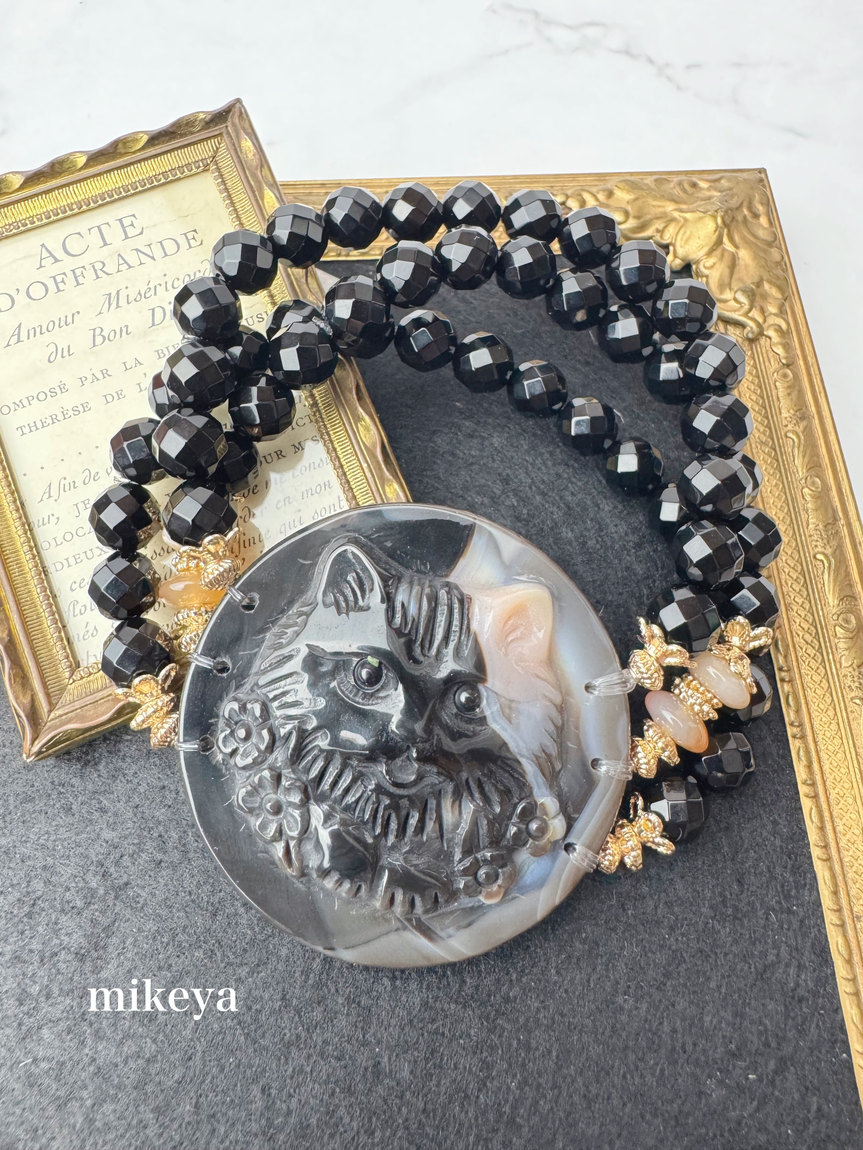 メノウ(ネコ)、オニキス、MIXカーネリアンのブレスレットになります。