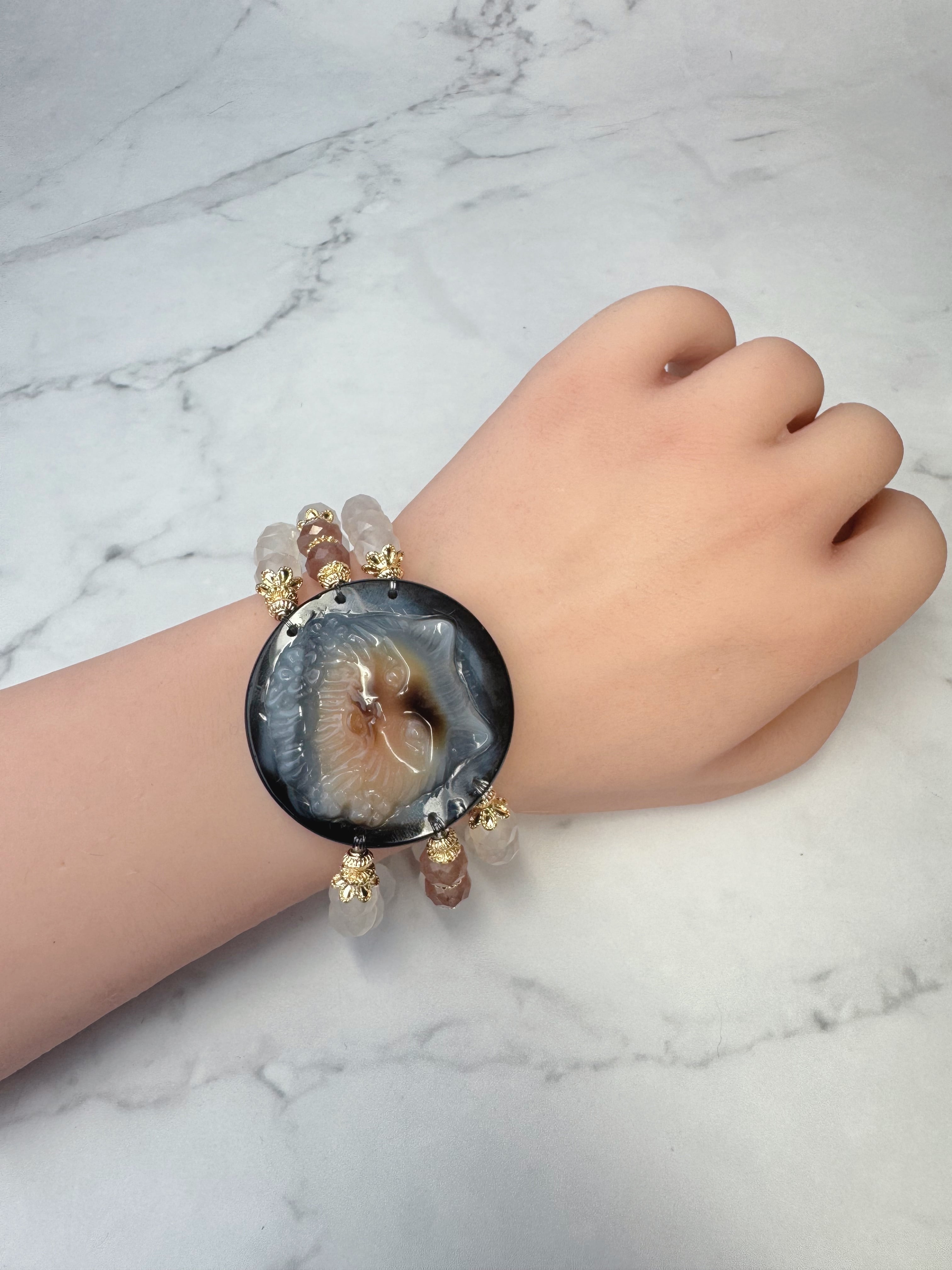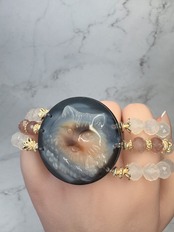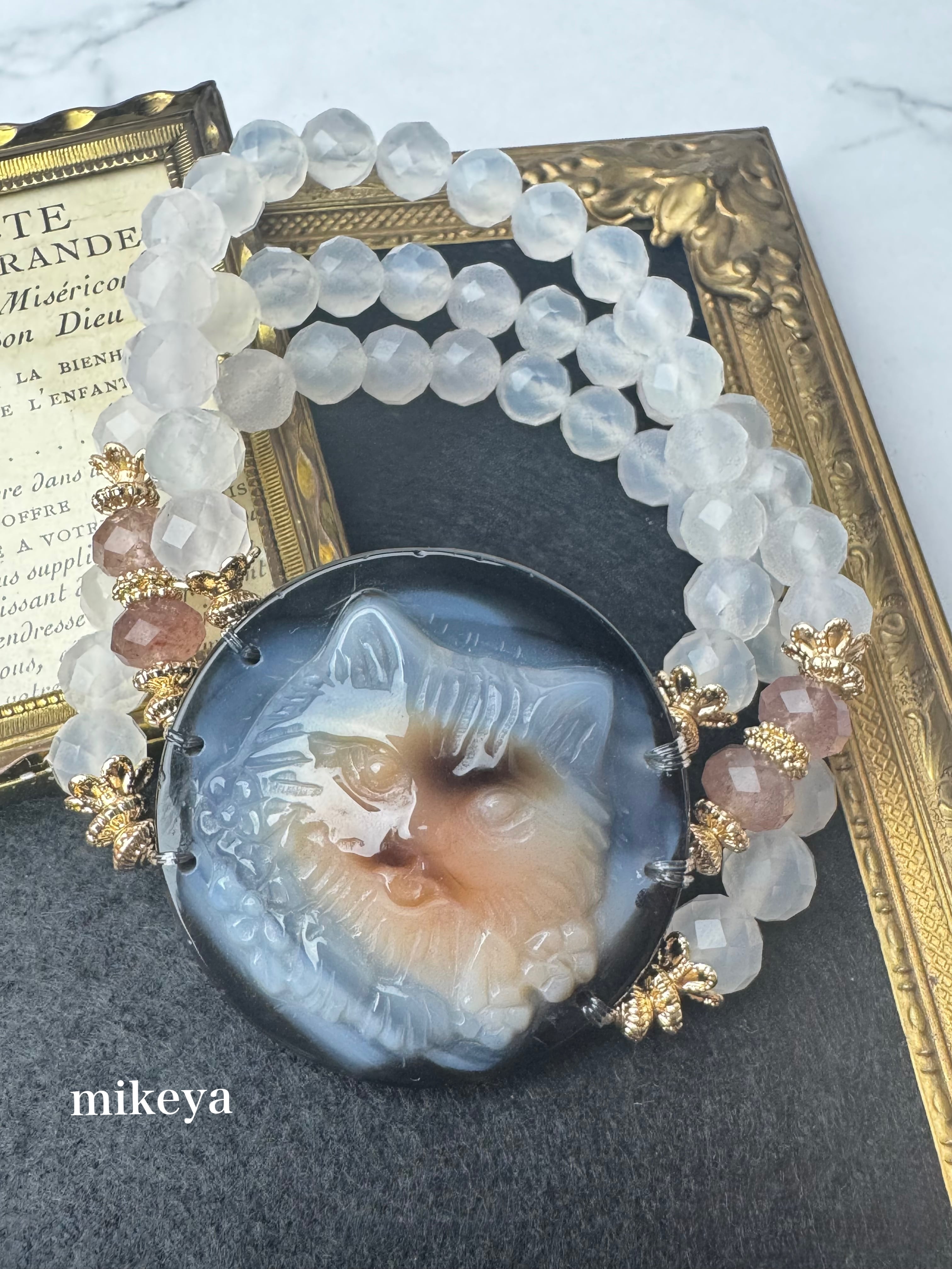 メノウ(ネコ)、ホワイトカルセドニー、ピンクエピドートのブレスレットになります。