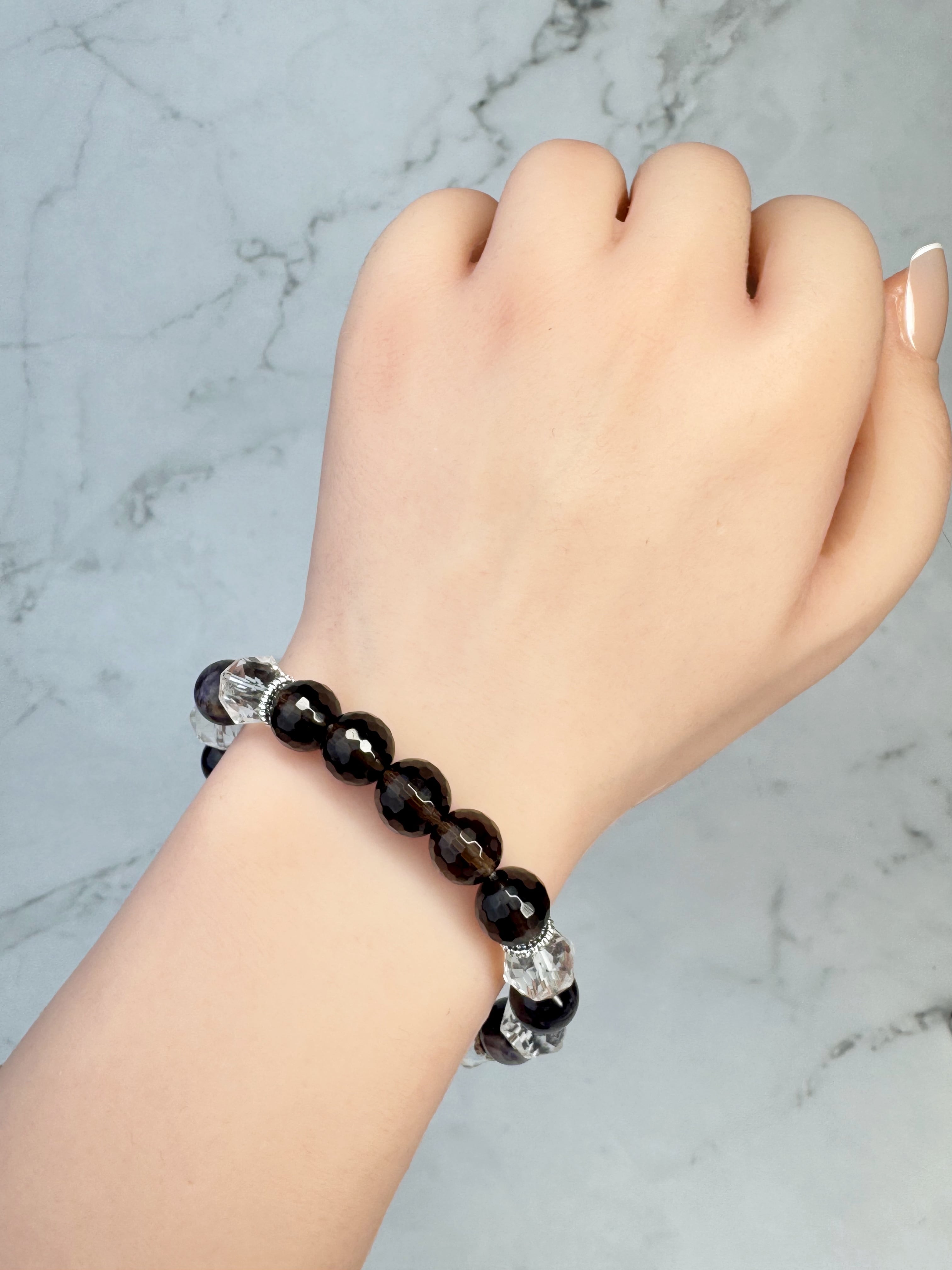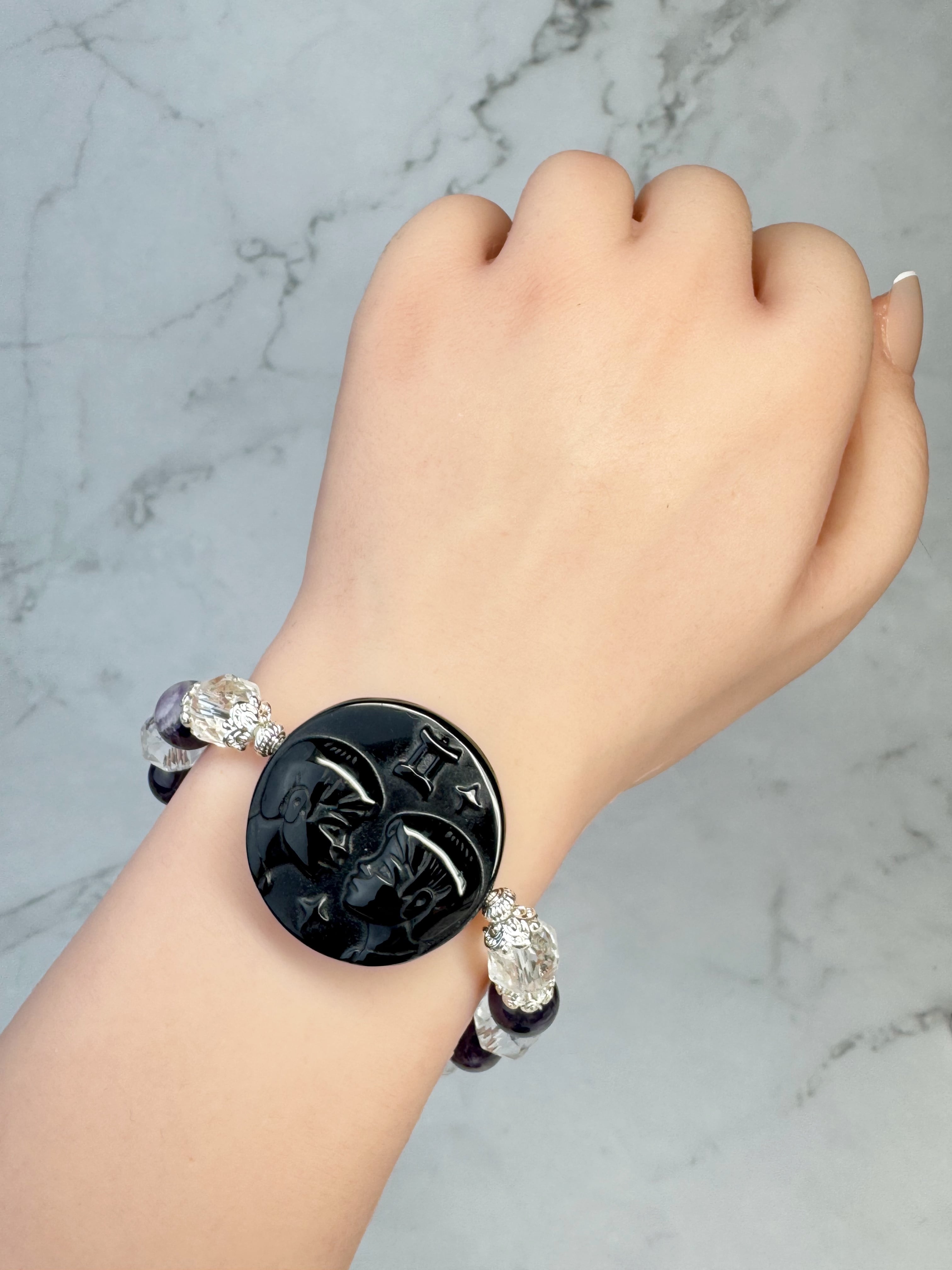 ブラックオブシディアン(双子座♊︎)、水晶、ストライプアメジスト、ダークスモーキークォーツのブレスレットになります。