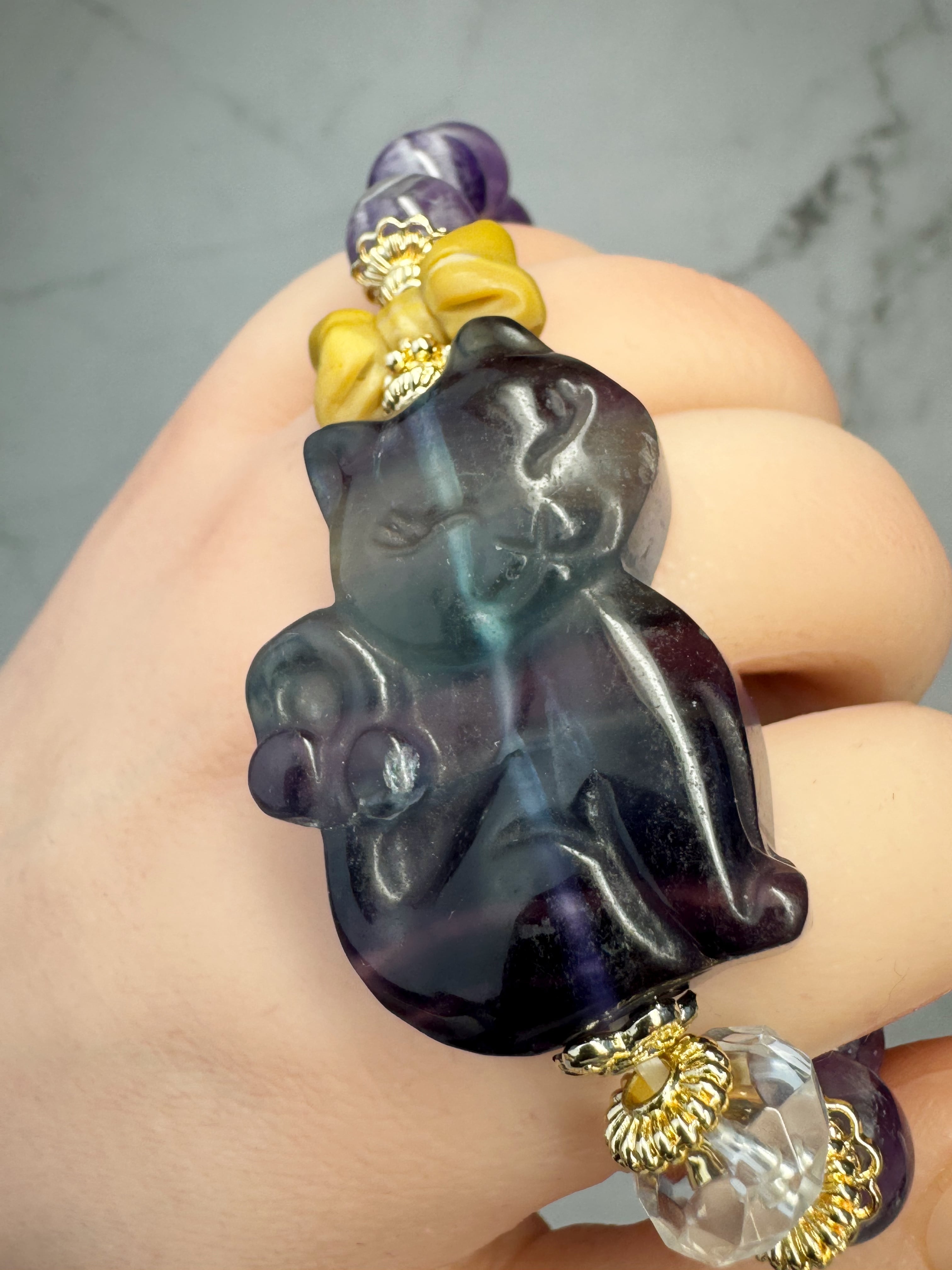 フローライト(ネコ)とストライプアメジスト、アラシャンアゲート(リボン)、水晶のブレスレットになります。