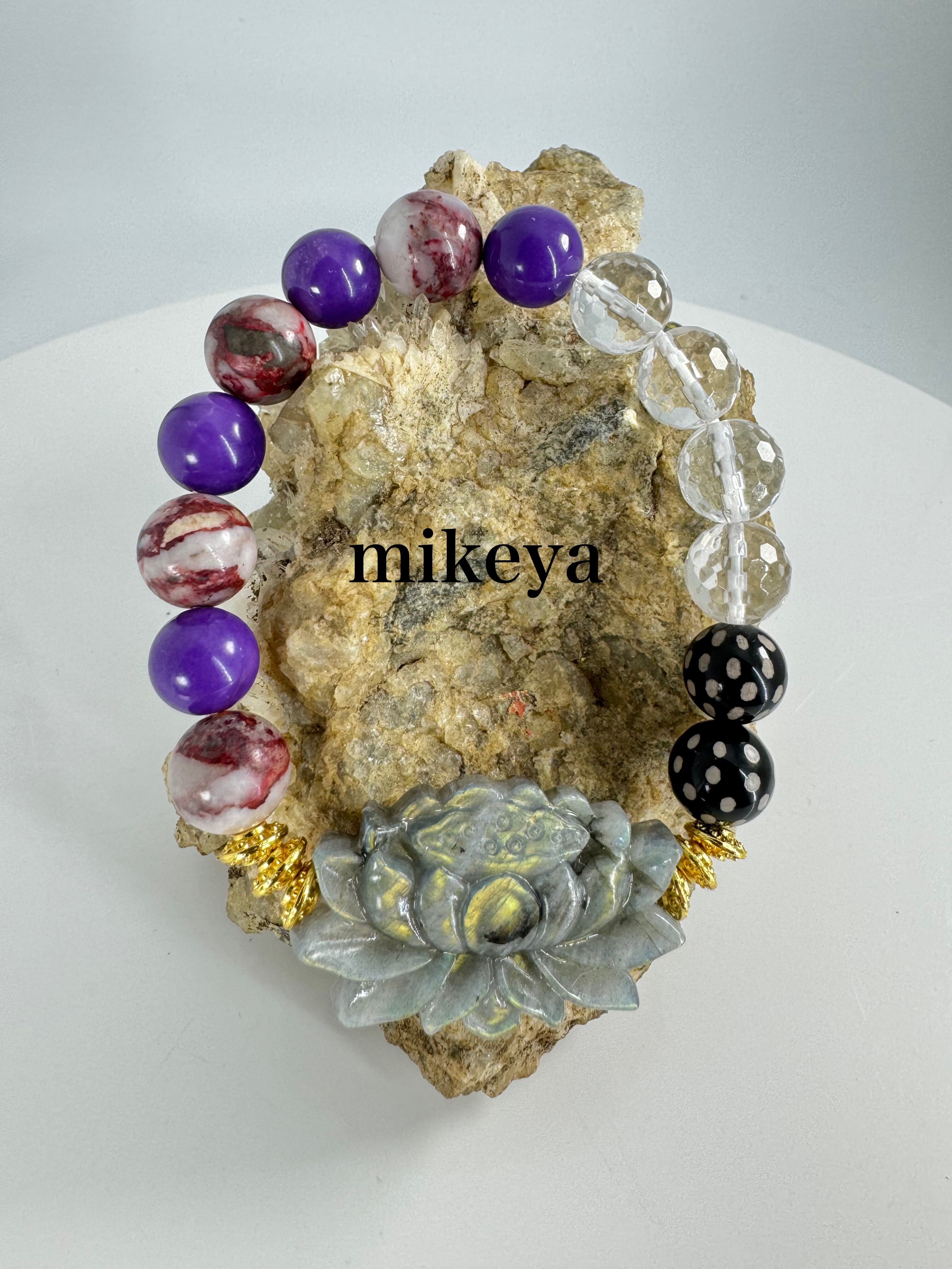 蓮の花でもアジアンテイストにはならず、満点天珠の水玉がアクセントとなり、フォスフォシデライトの紫との組み合わせで、大人可愛いブレスレットと仕上がりました。