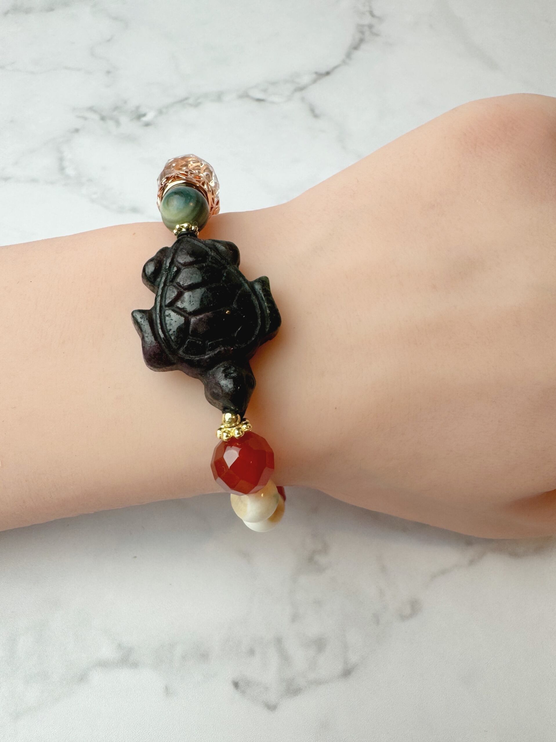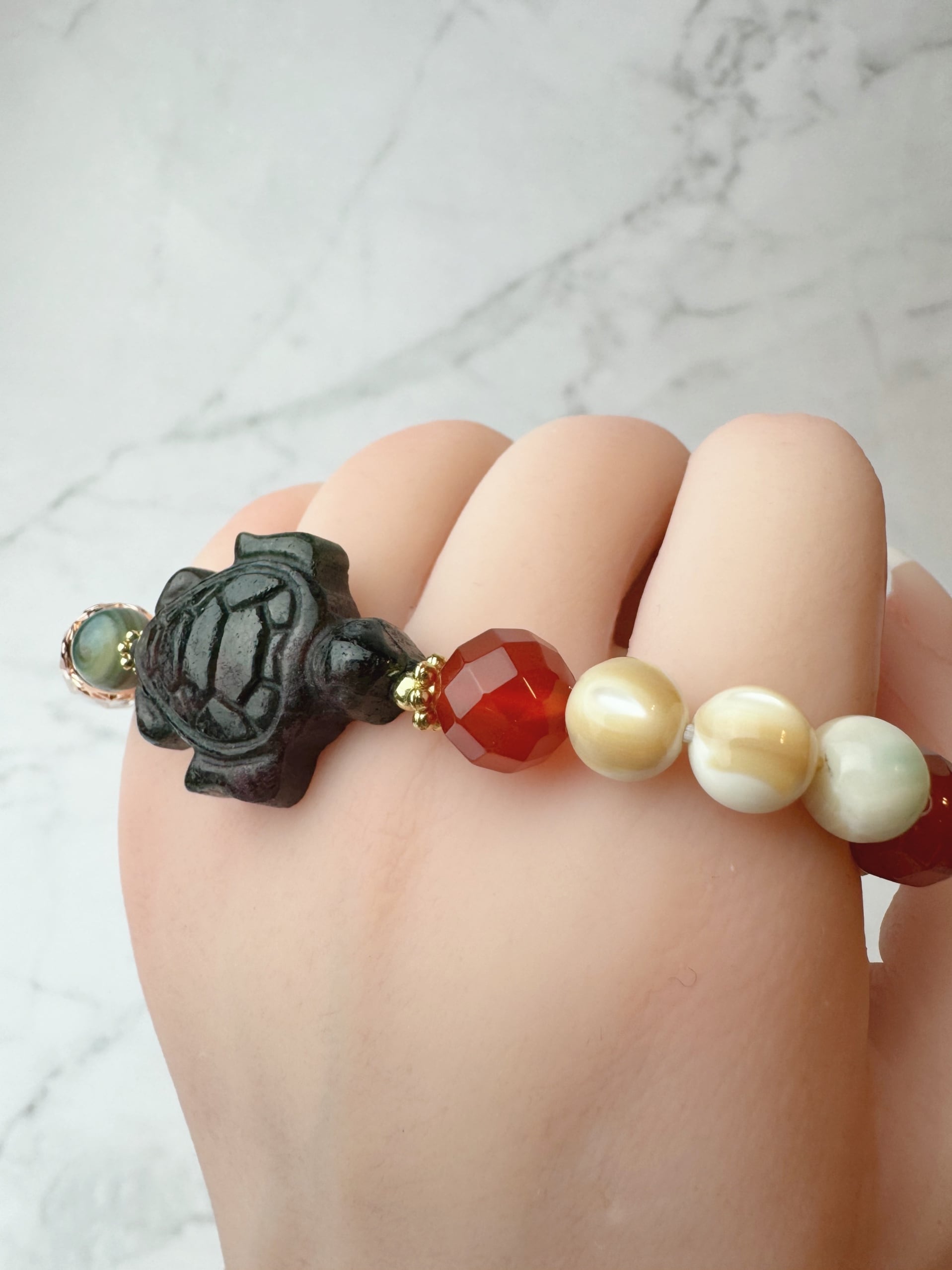 ルビーインゾイサイト(海亀)夜光貝、レッドアゲート、水晶を使ったブレスレットになります。