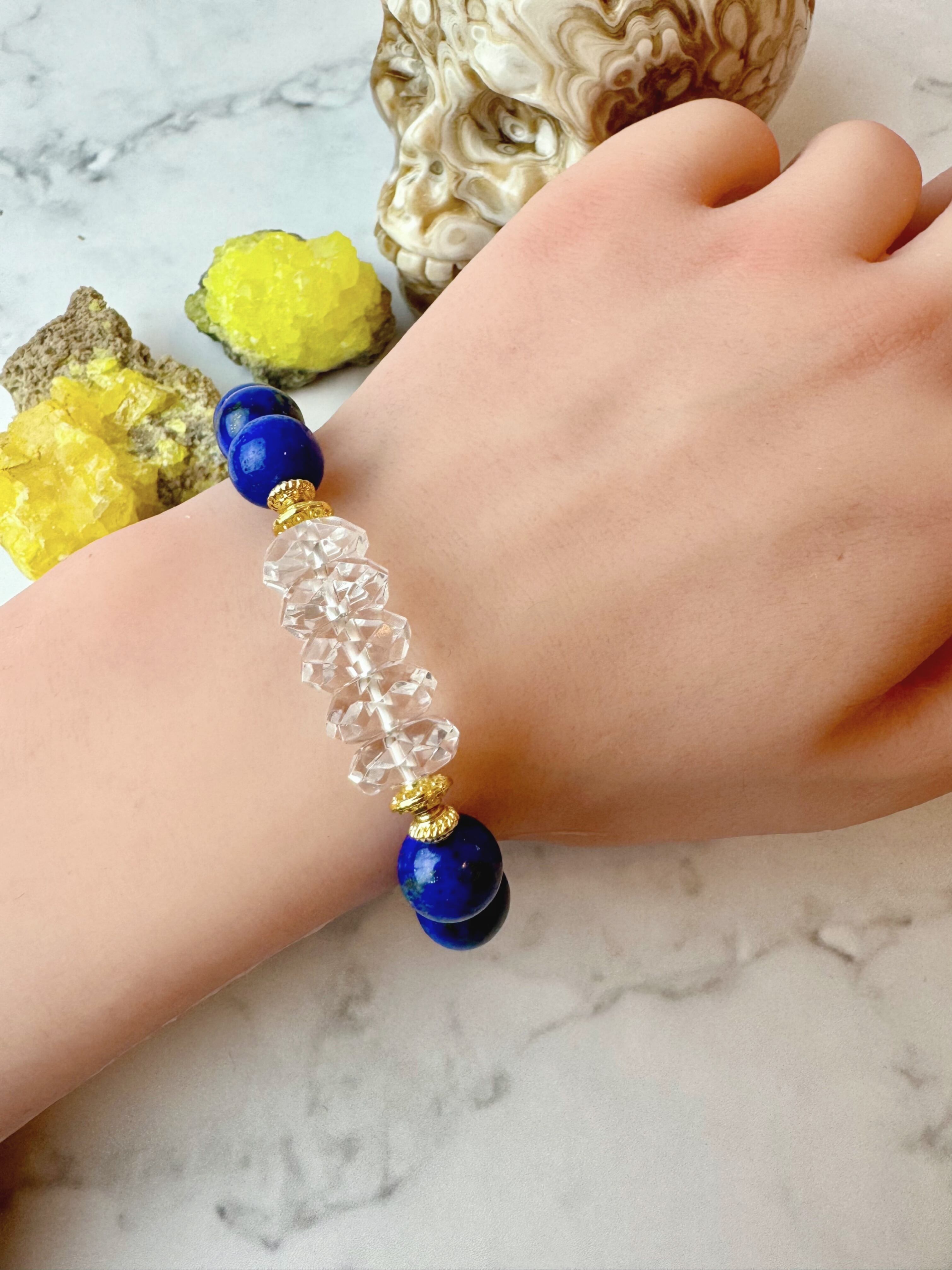 水晶、ラピスラズリ、ミックスルチルクォーツで、どんな悪いものも吹き飛ばしてくれそうなブレスレットになりました。