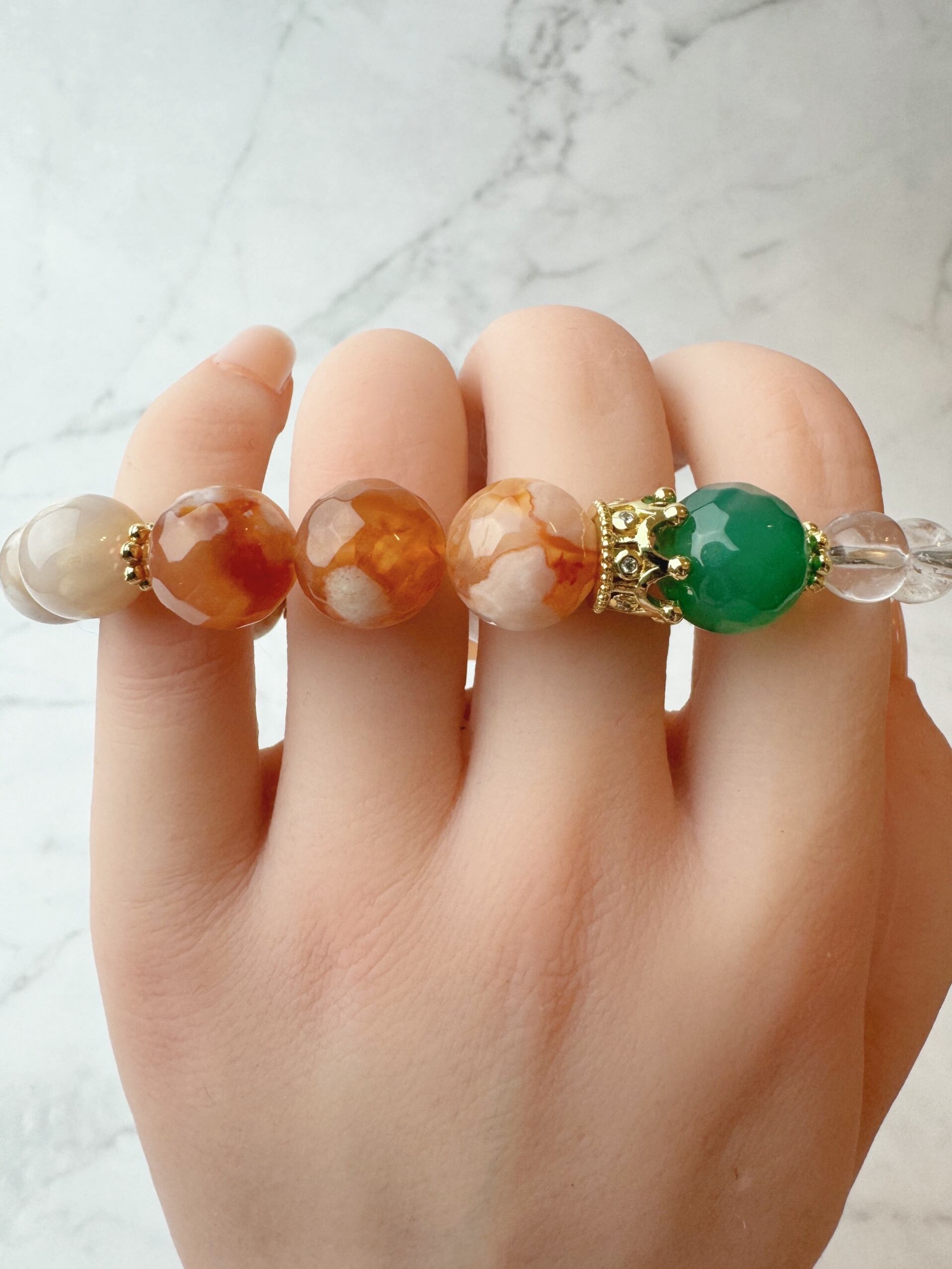 グリーン桜瑪瑙をアクセントにし、ホワイトセリサイトインクォーツの白で桜瑪瑙を引き立てています。