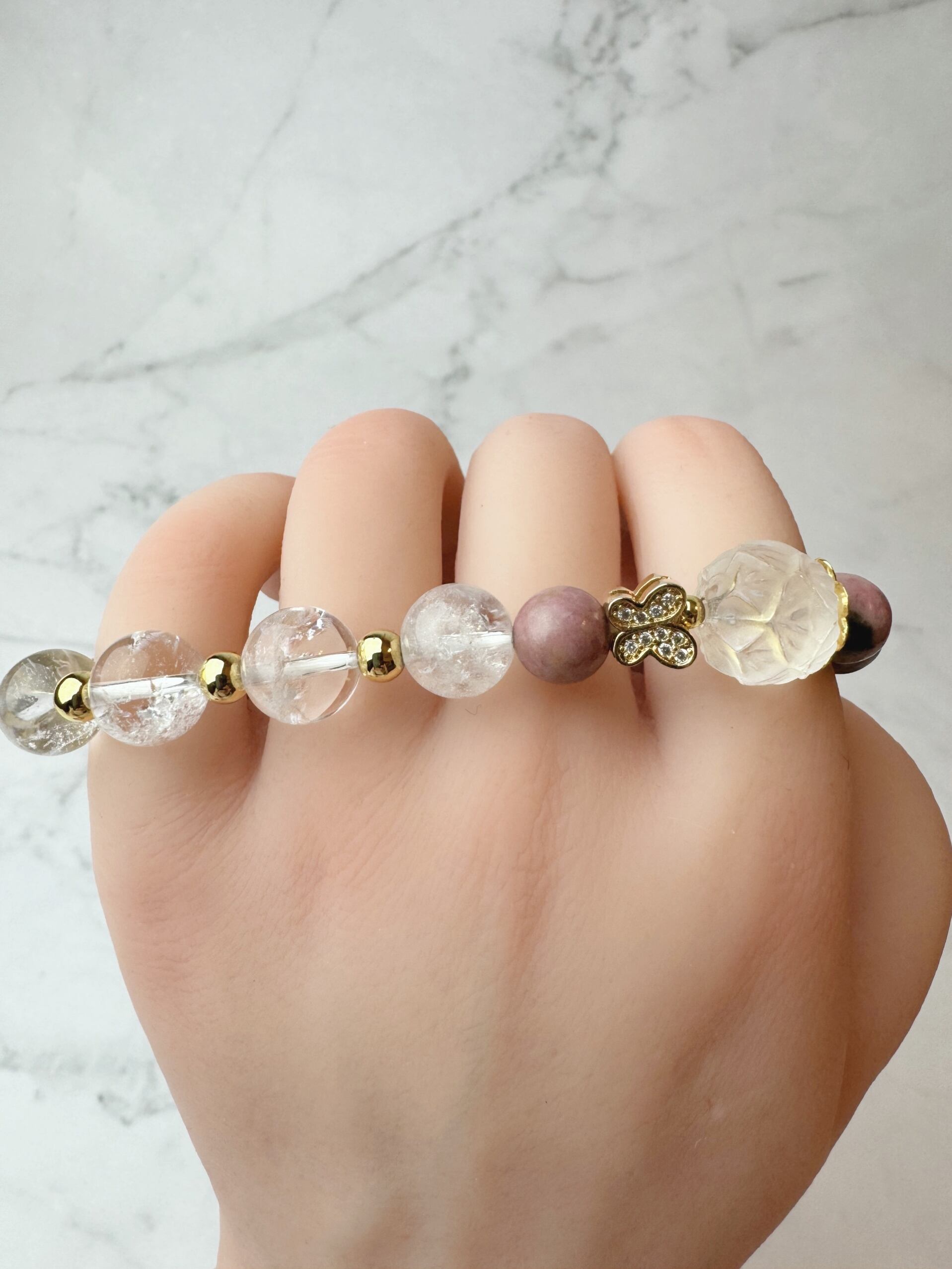 水晶の蓮の花に蝶がとまっているイメージでデザインしました。