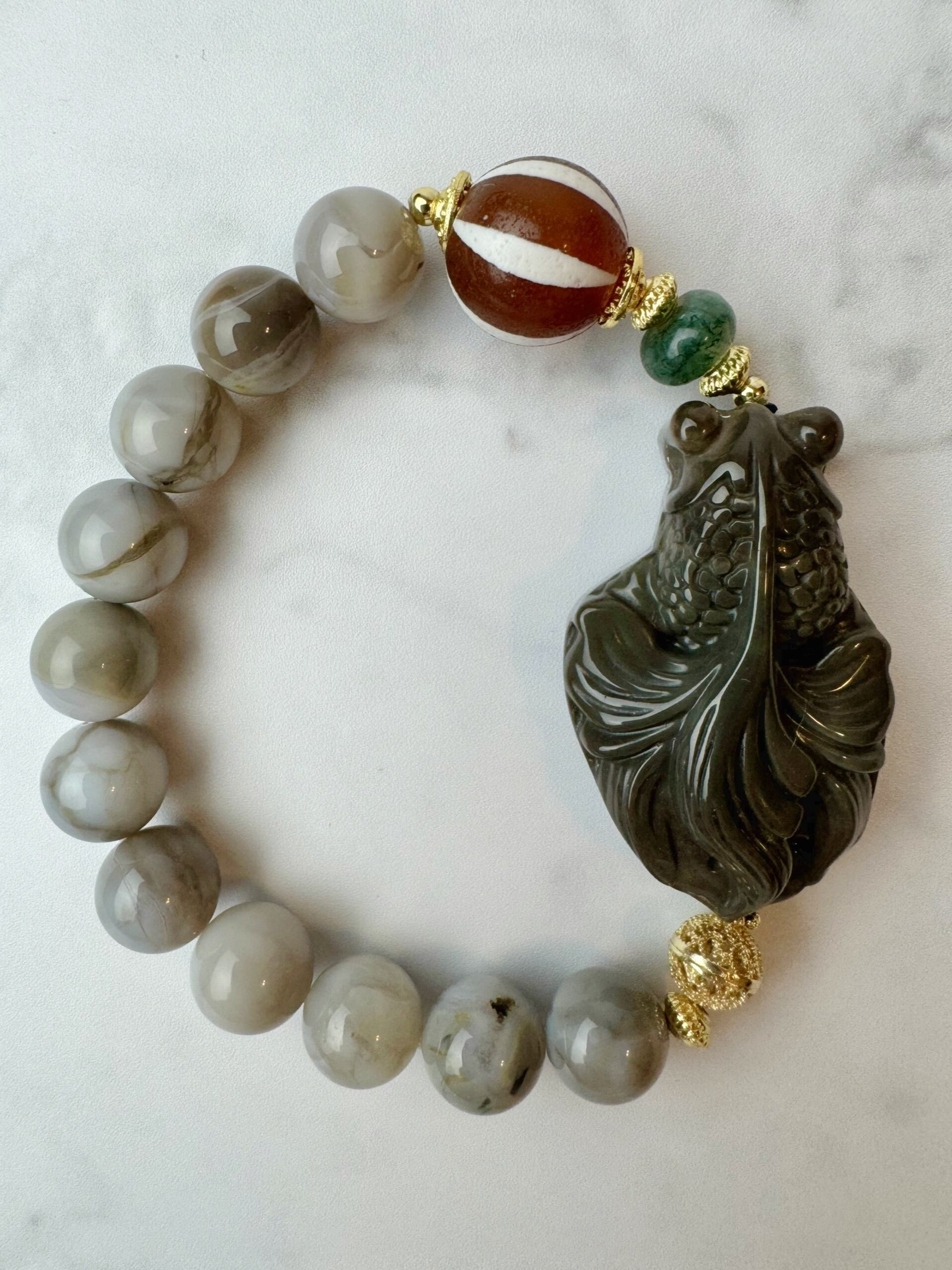 金魚のアラシャンアゲートブレスレットになります。肌馴染みの良いグレーなので、暗くならず、可愛らしいブレスレットです。赤色の西瓜天珠がポイントになっています。