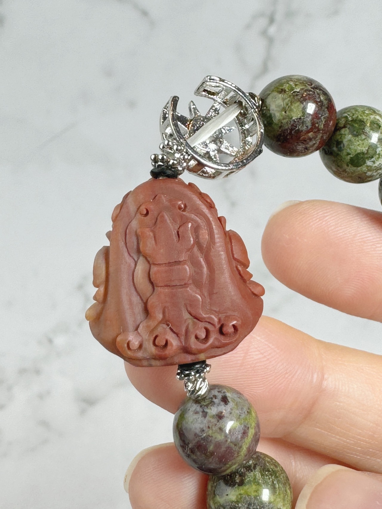 生命力溢れるドラゴンブラッドジャスパーと組み合わせてみました。シルバーパーツに付いている石はサンストーンになります。