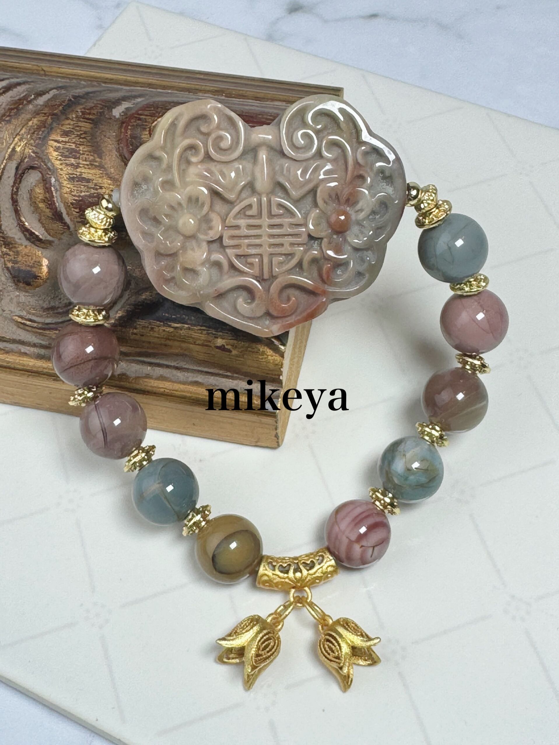 玉の部分のアラシャンアゲートはカラフルな色合いです。アクセサリーパーツの花が、ぶつかって小さな鈴のような音が致しますので、気になる方は御遠慮ください。