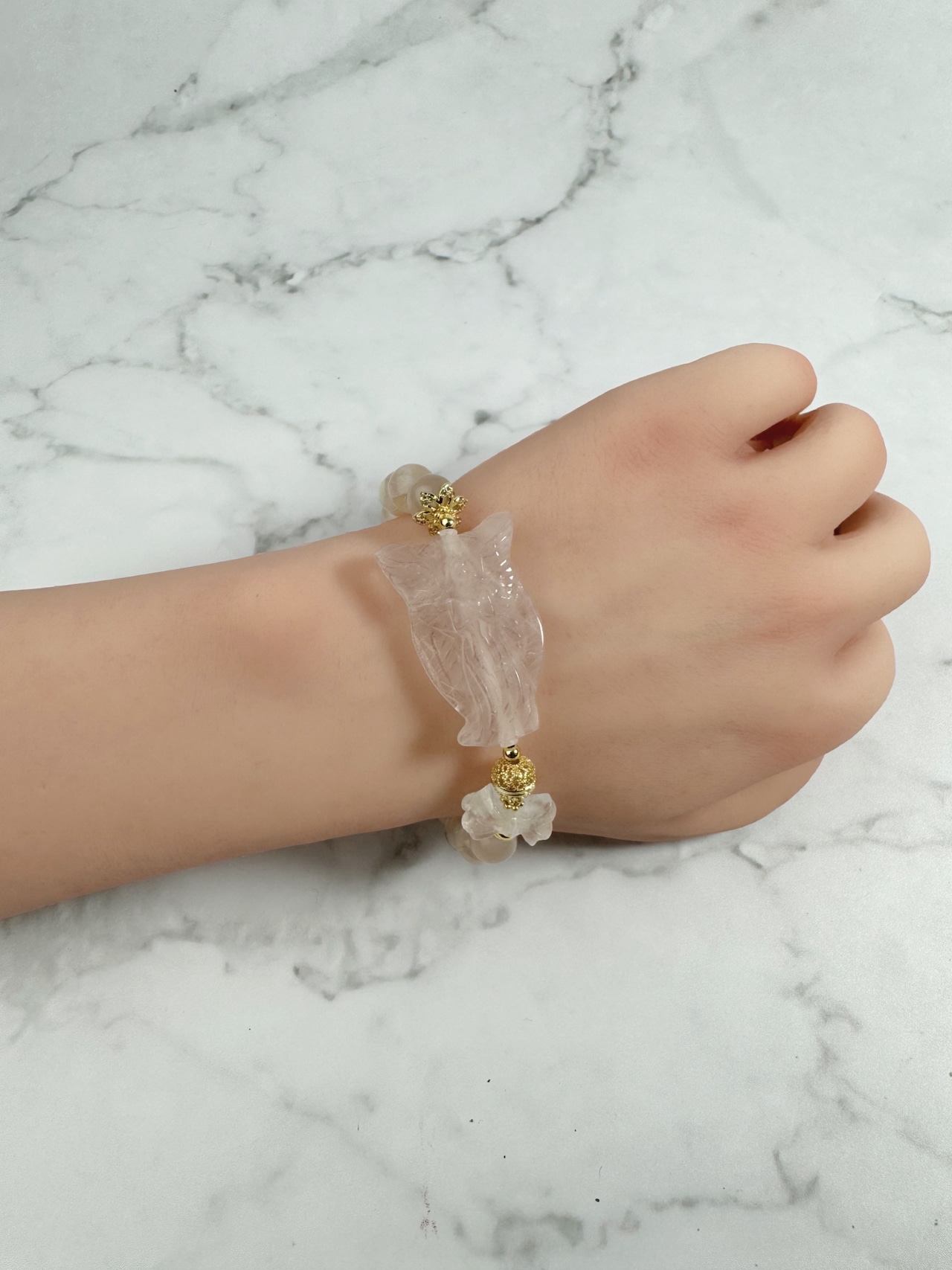 お写真2枚目から水晶のブレスになり、6枚目からローズクォーツのブレスになります。