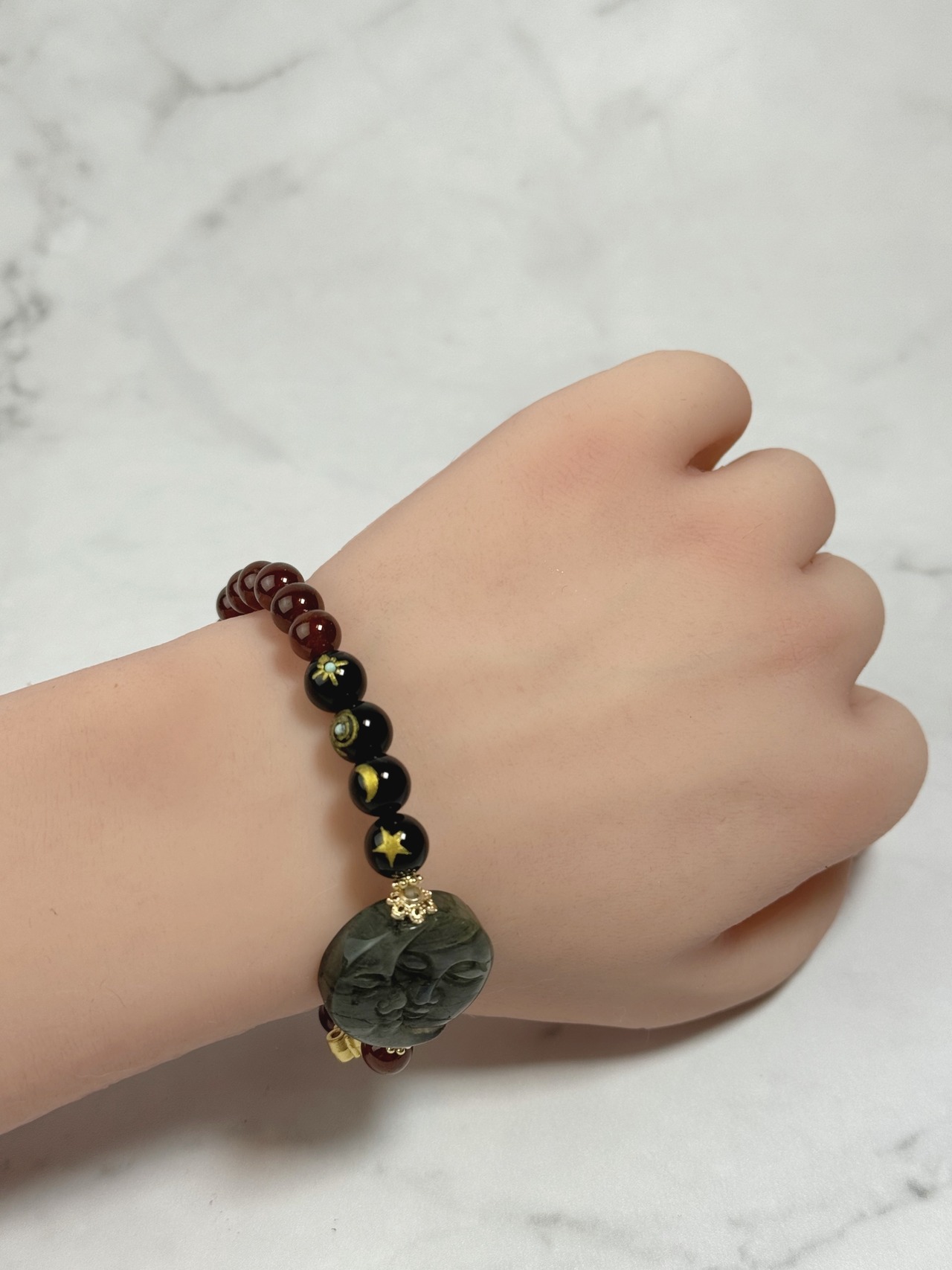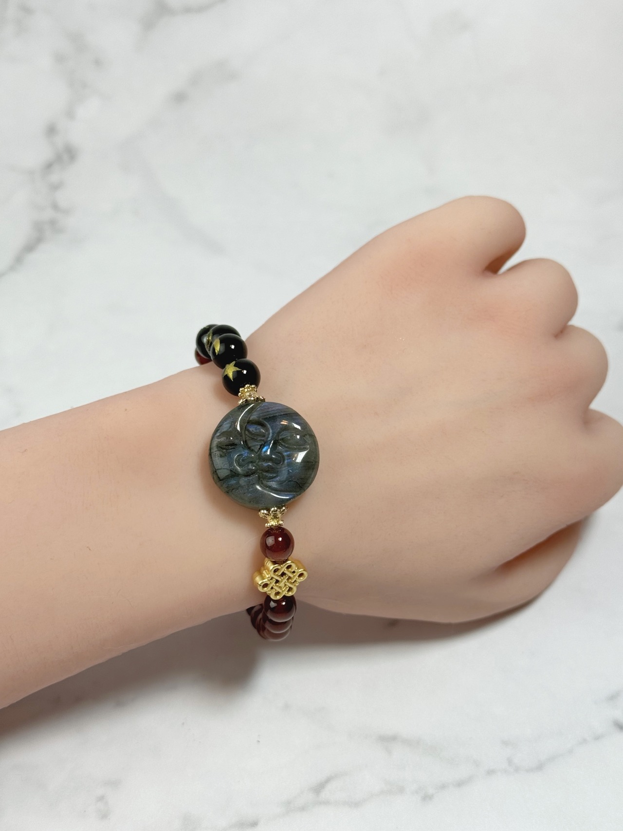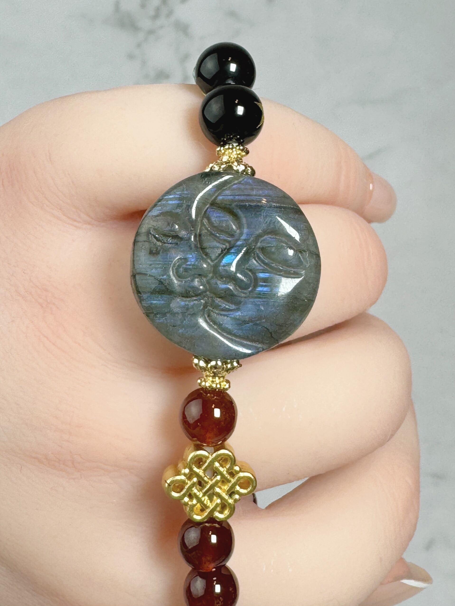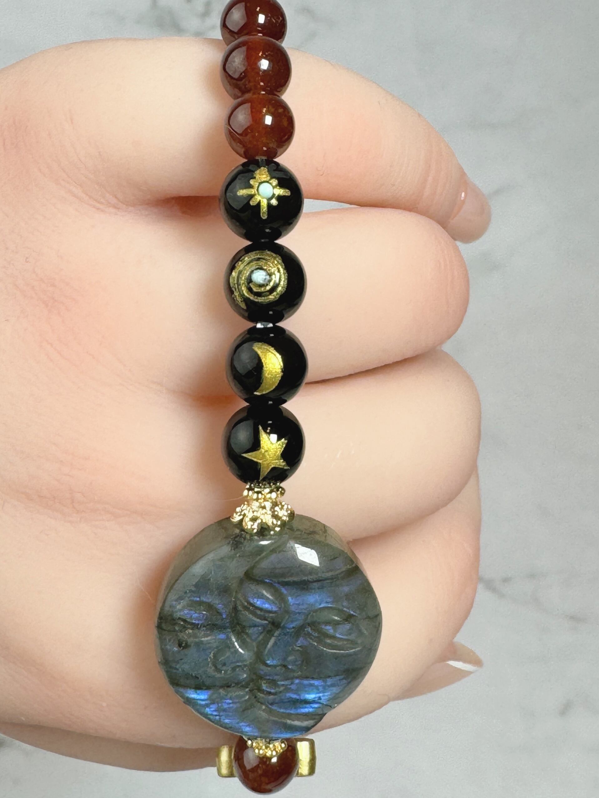 月と太陽のモチーフのラブラドライトのブレスレットになります。