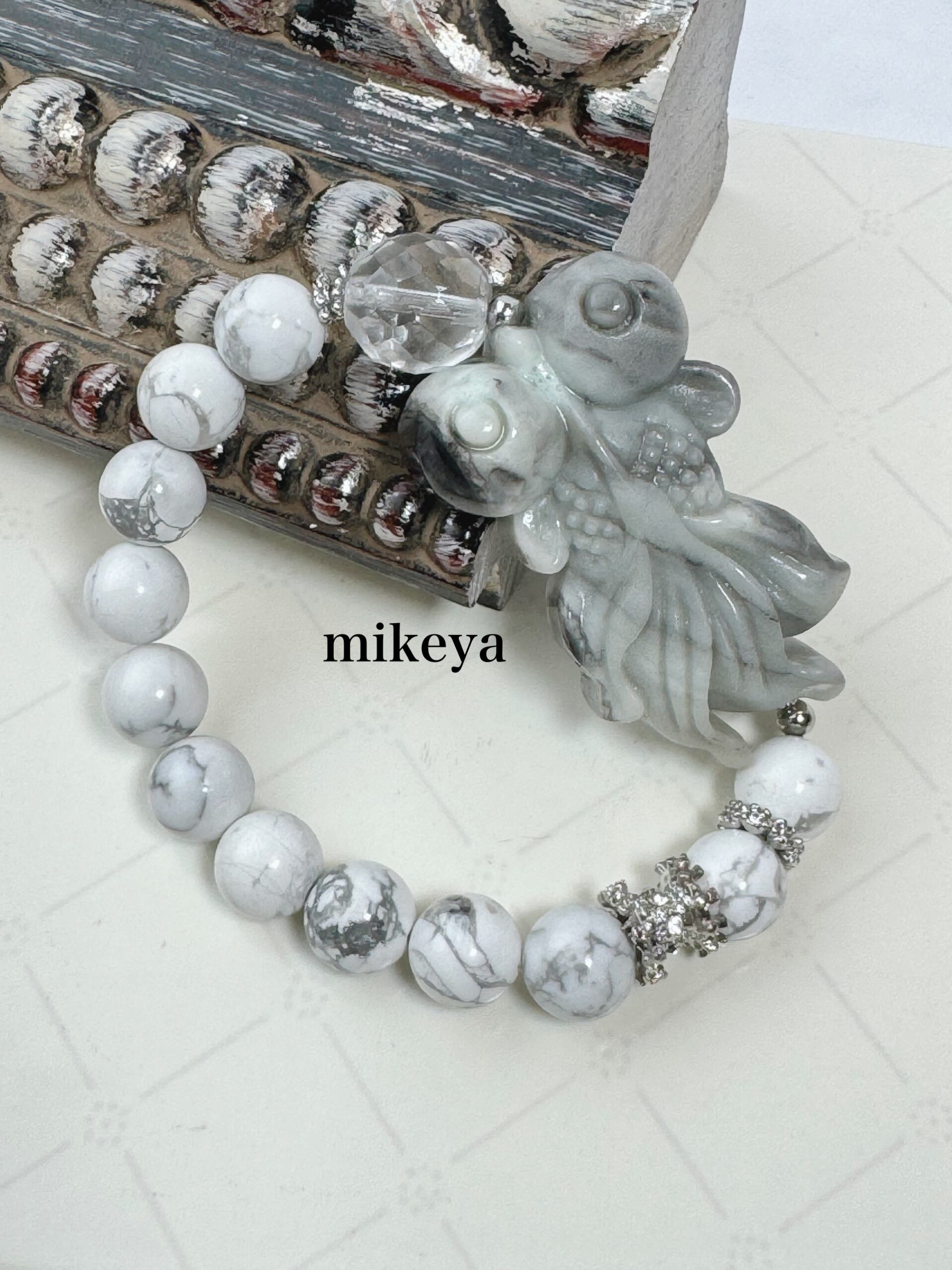 水晶を、デメキンが口から吐いた水の泡にみたて、清潔感のあるハウライトと合わせることにより、爽やかなブレスレットとなりました。