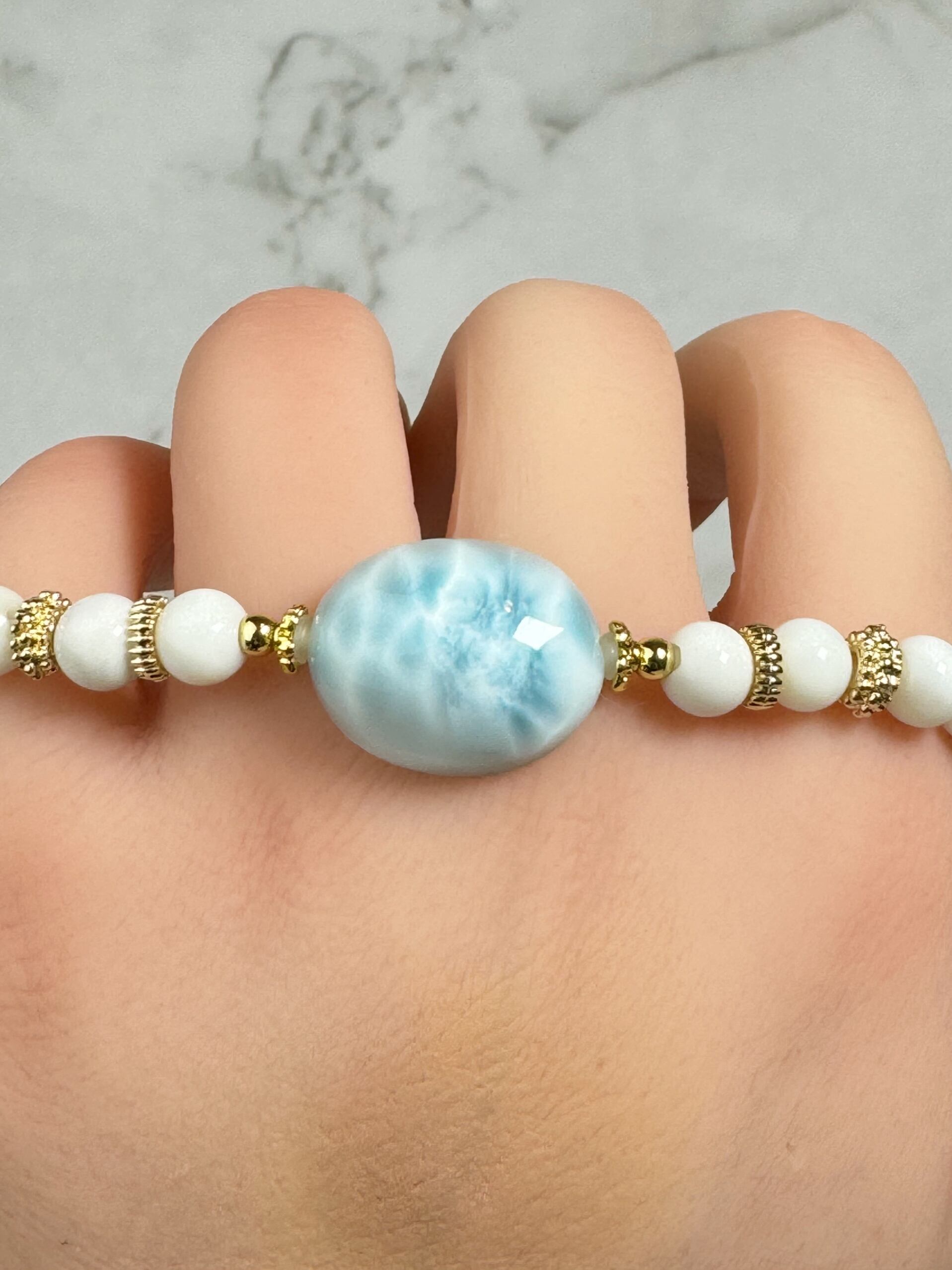 ホワイトオニキスによって、より爽やかで、ラリマーの美しさが引き立てられます。