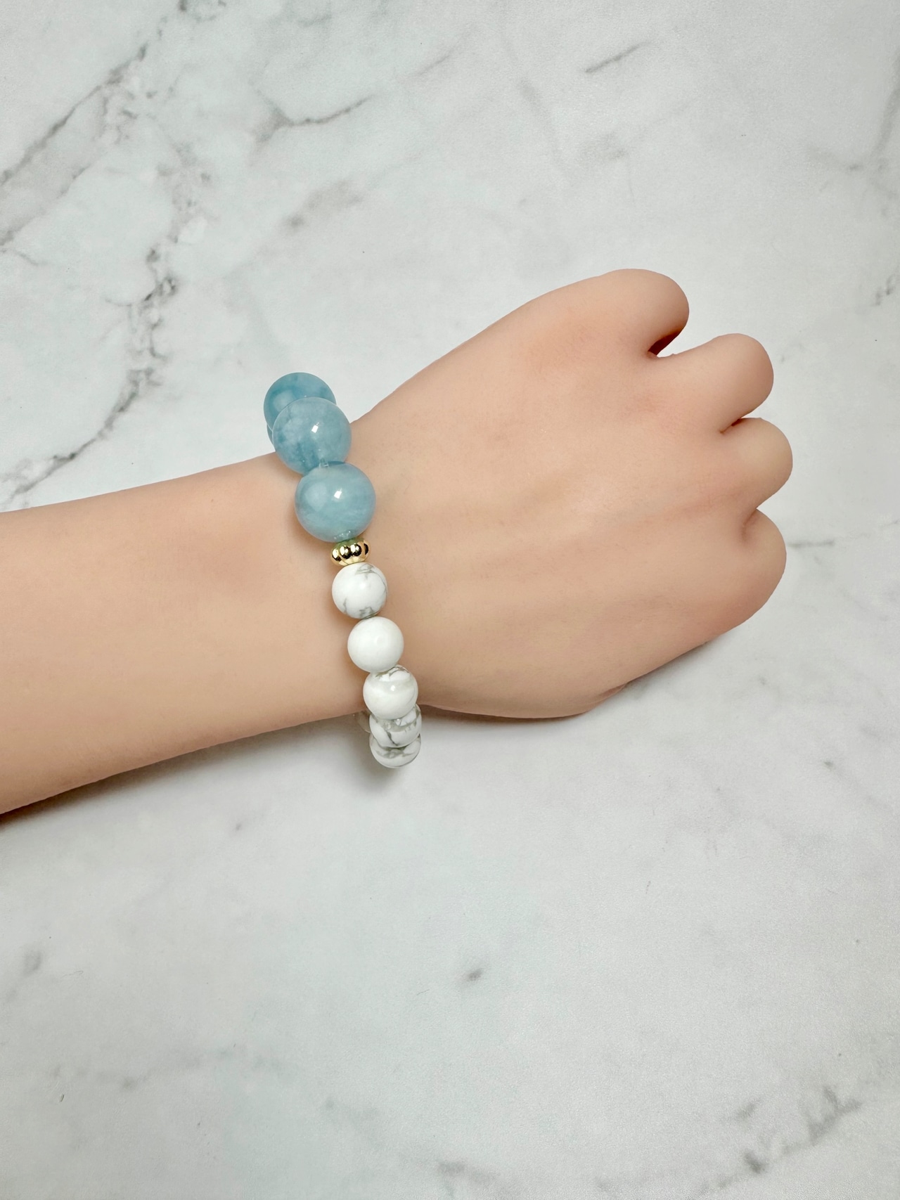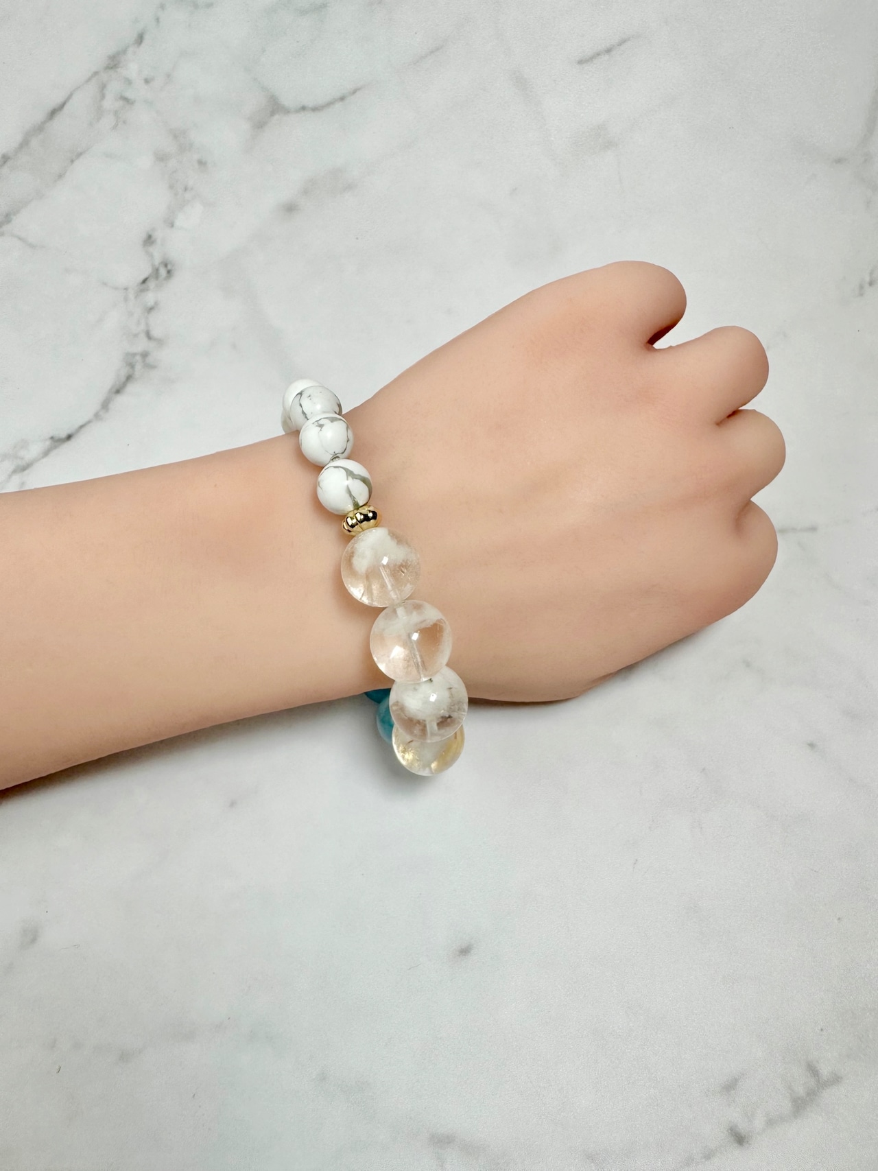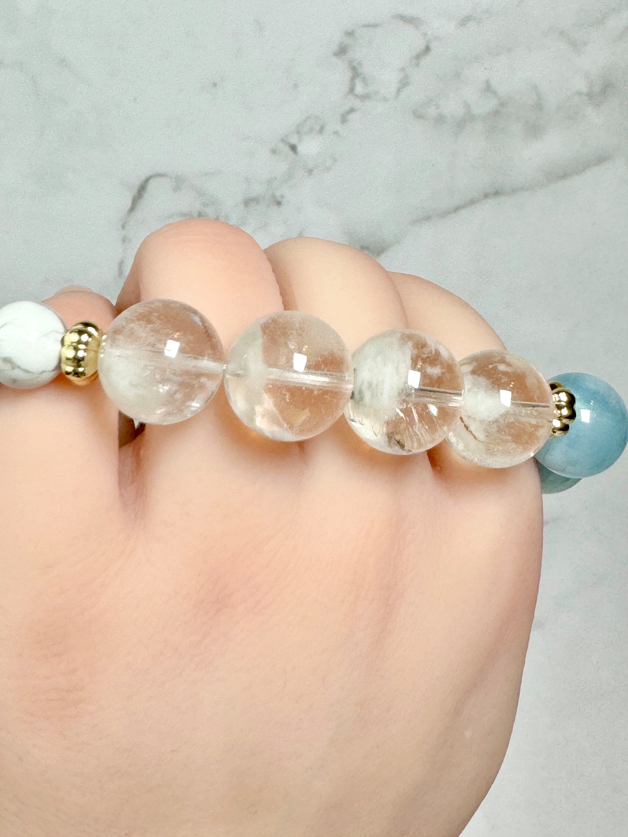 クラウディアクアマリン×コットンインクルージョンクォーツ×ハウライトのブレスレットになります。