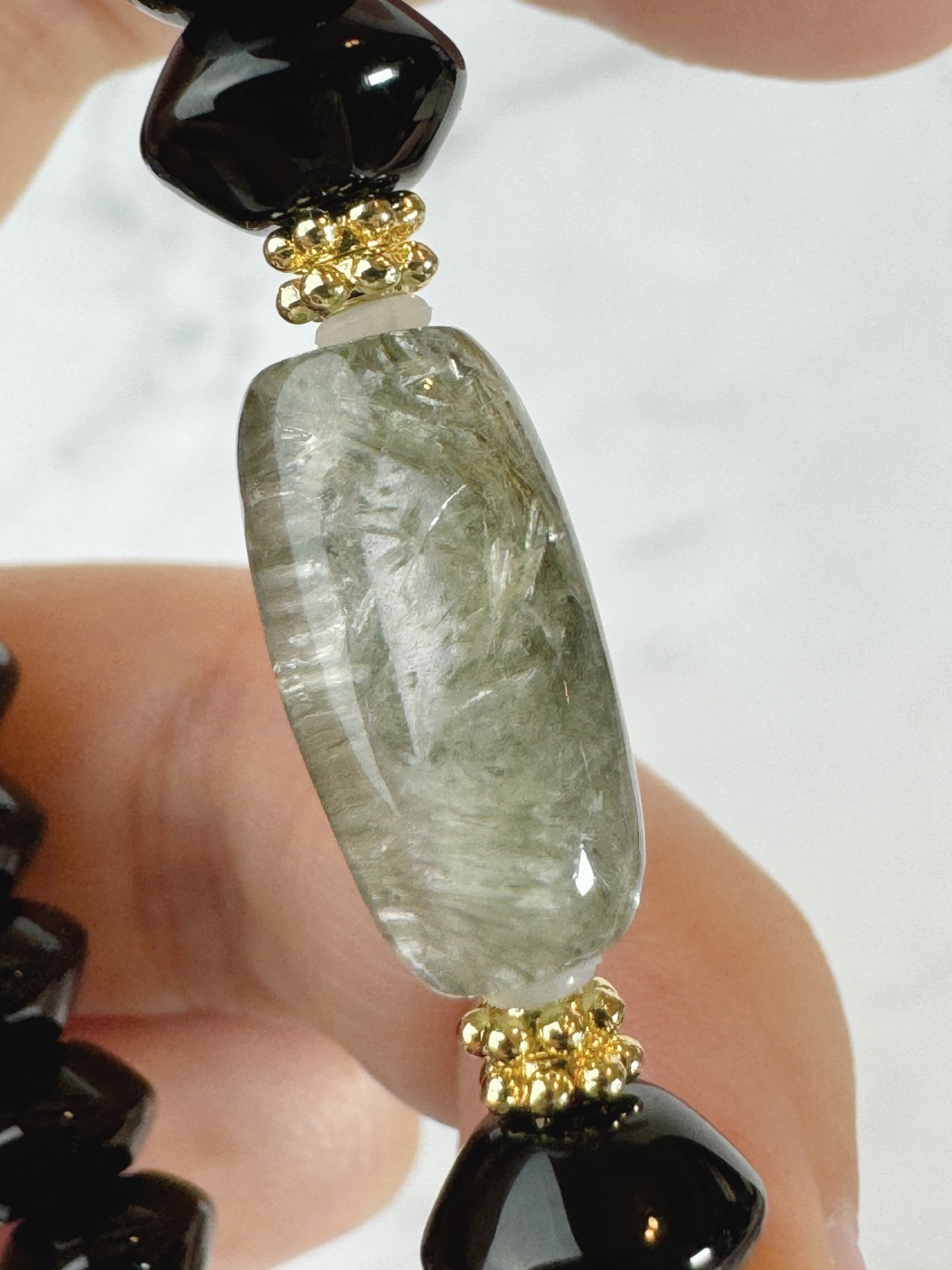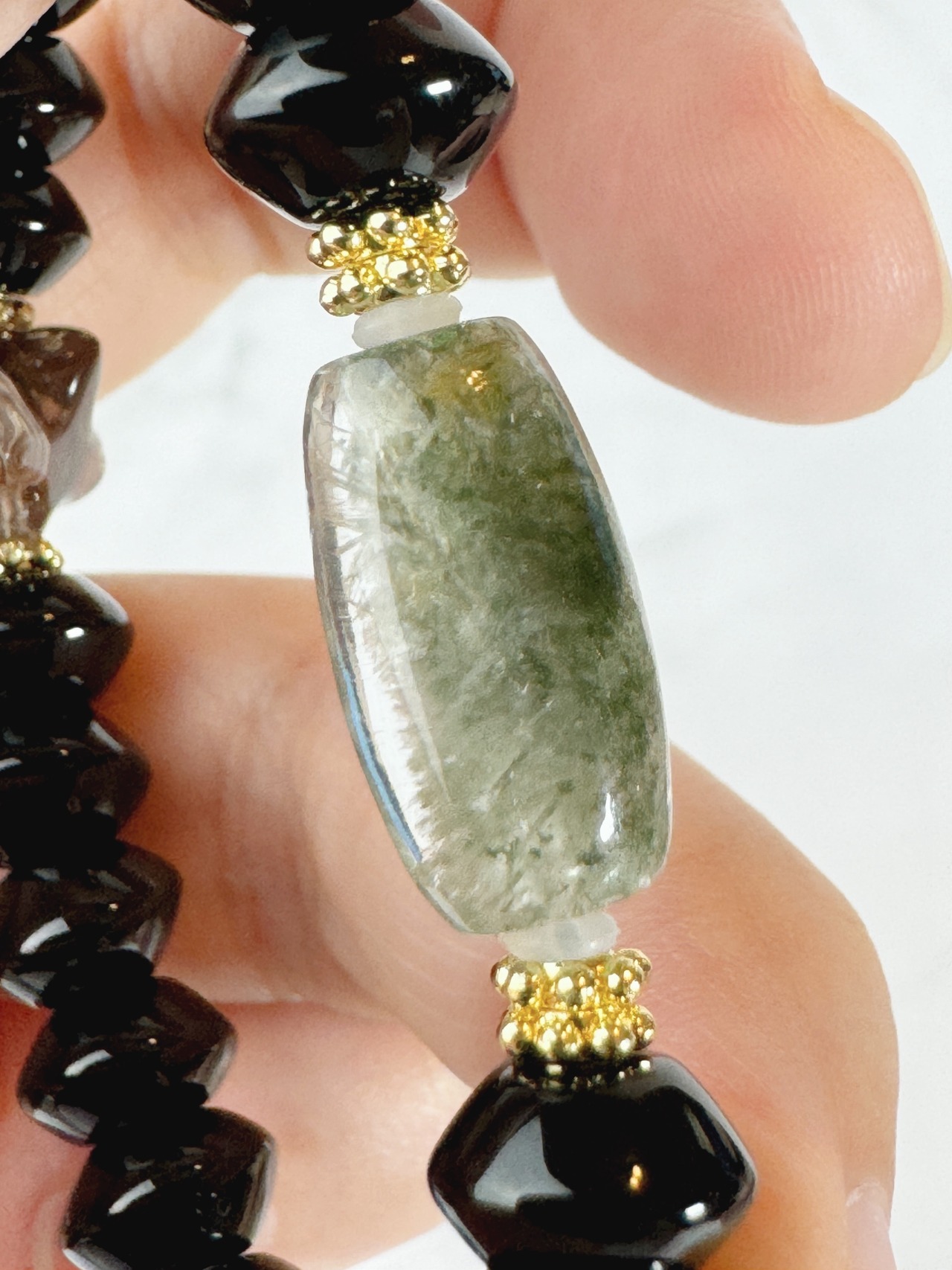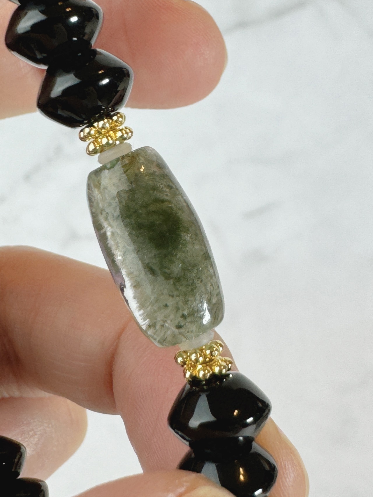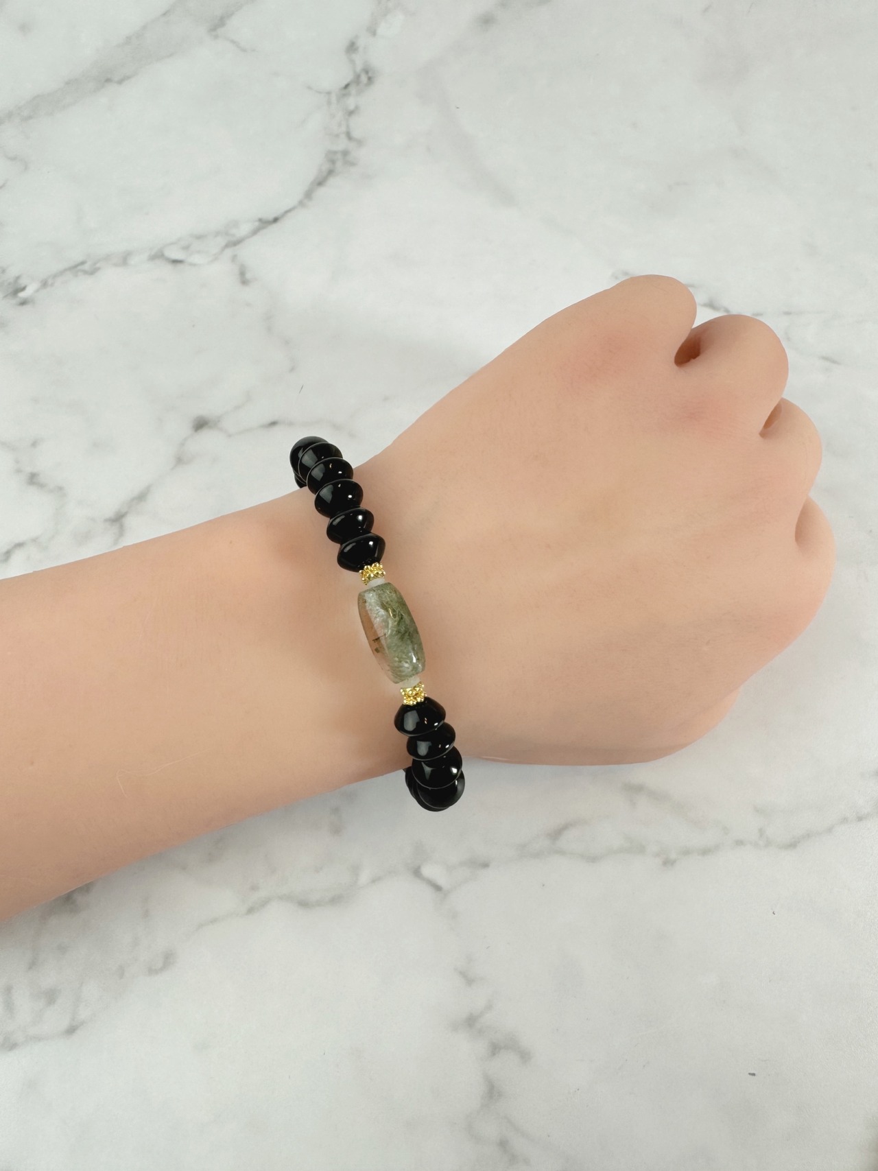 算盤状のオニキスが品良く、重ね付けもしやすい霊性高いブレスレットになっております。