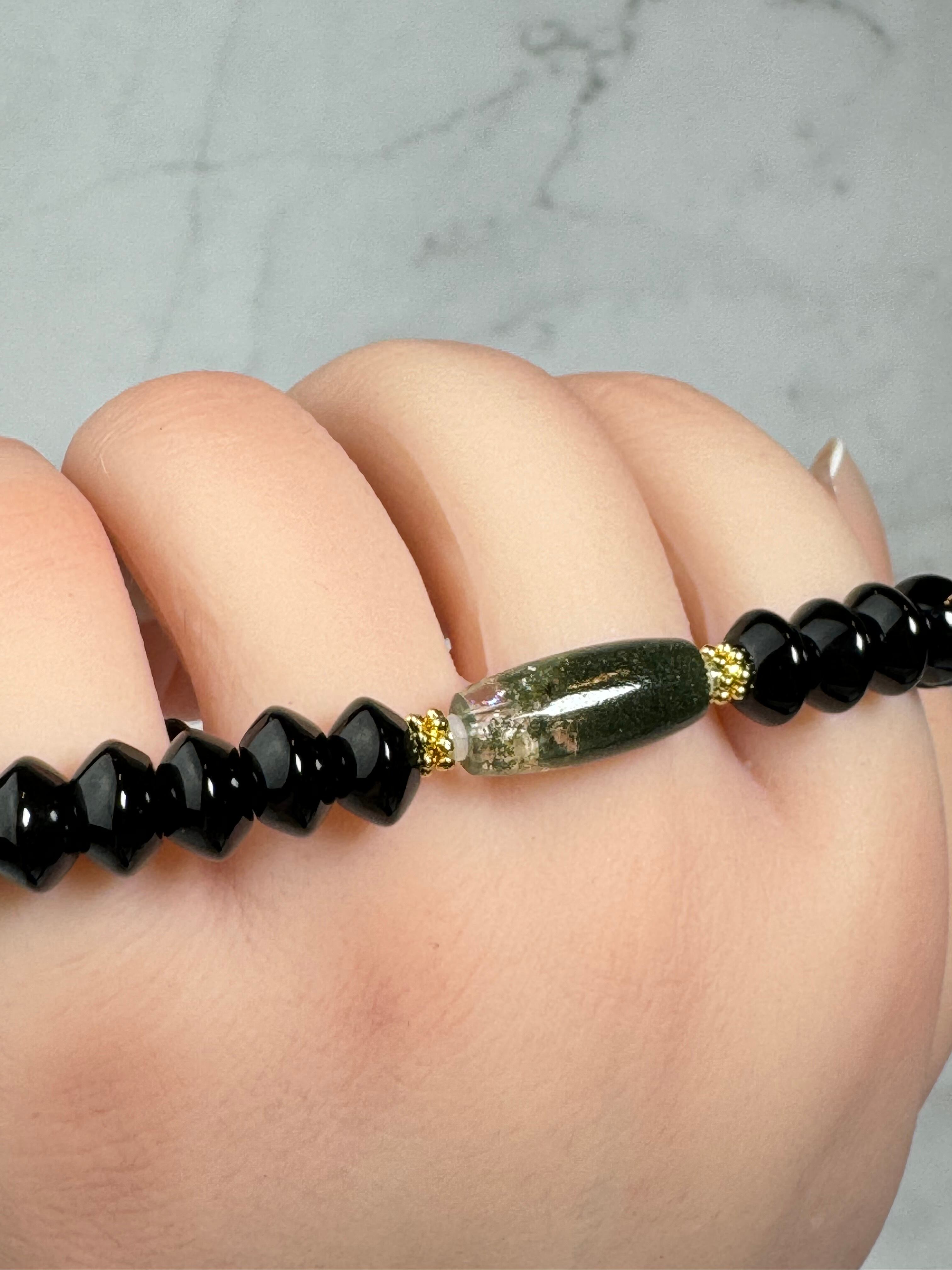 算盤状のオニキスが品良く、重ね付けもしやすい霊性高いブレスレットになっております。