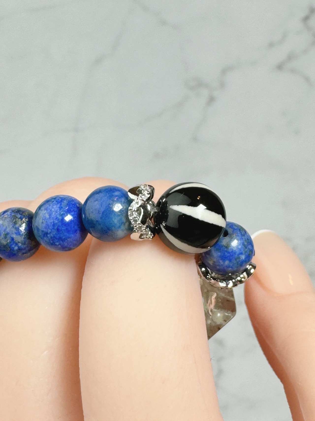 カイラスの水晶と最古のパワーストーンと言われているラピスラズリラズリと合わせる事により、より霊性高く、黒線天珠のアクセントでお洒落に仕上げました。