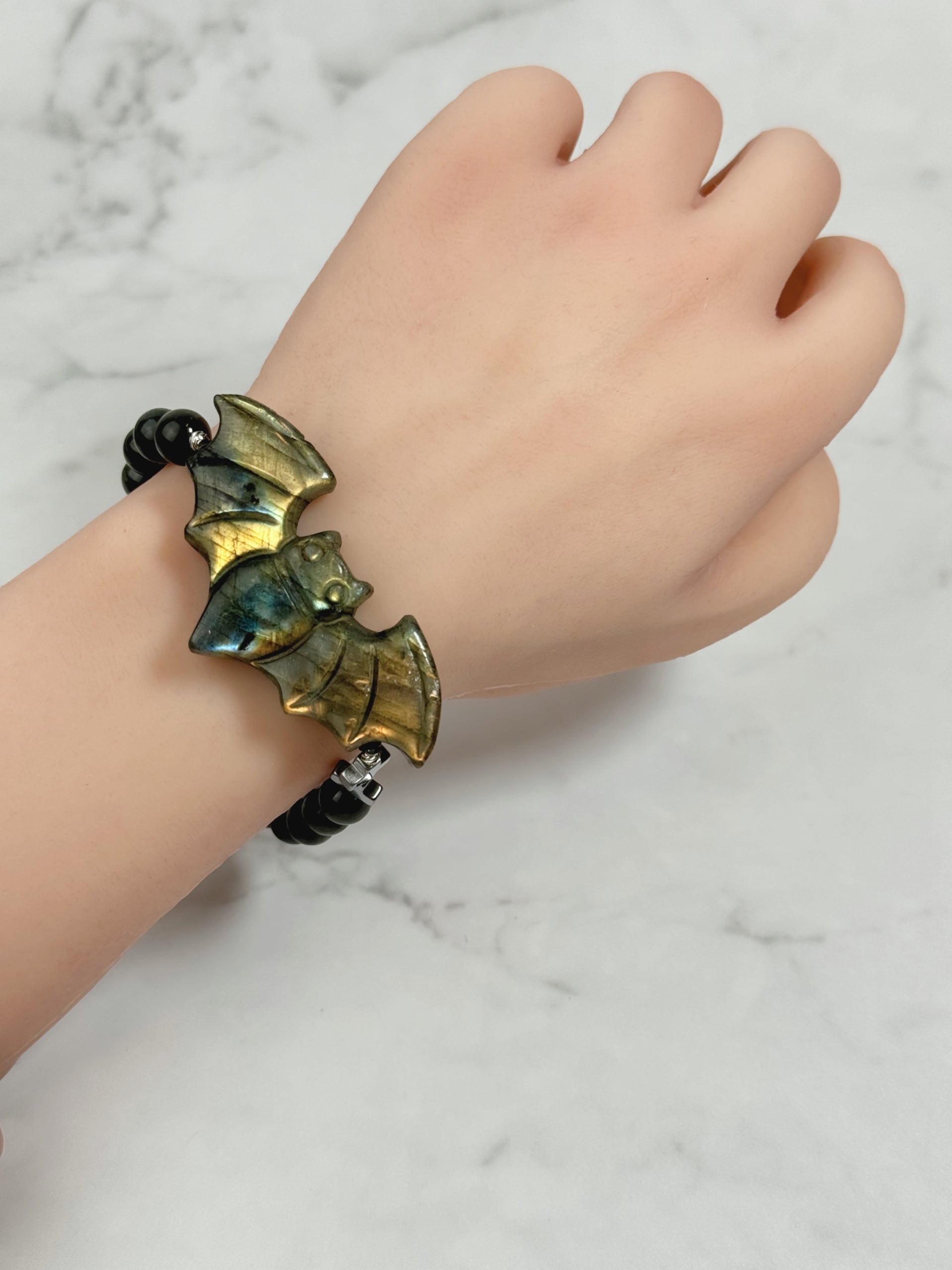 ラブラドライトのコウモリのブレスレットになります。