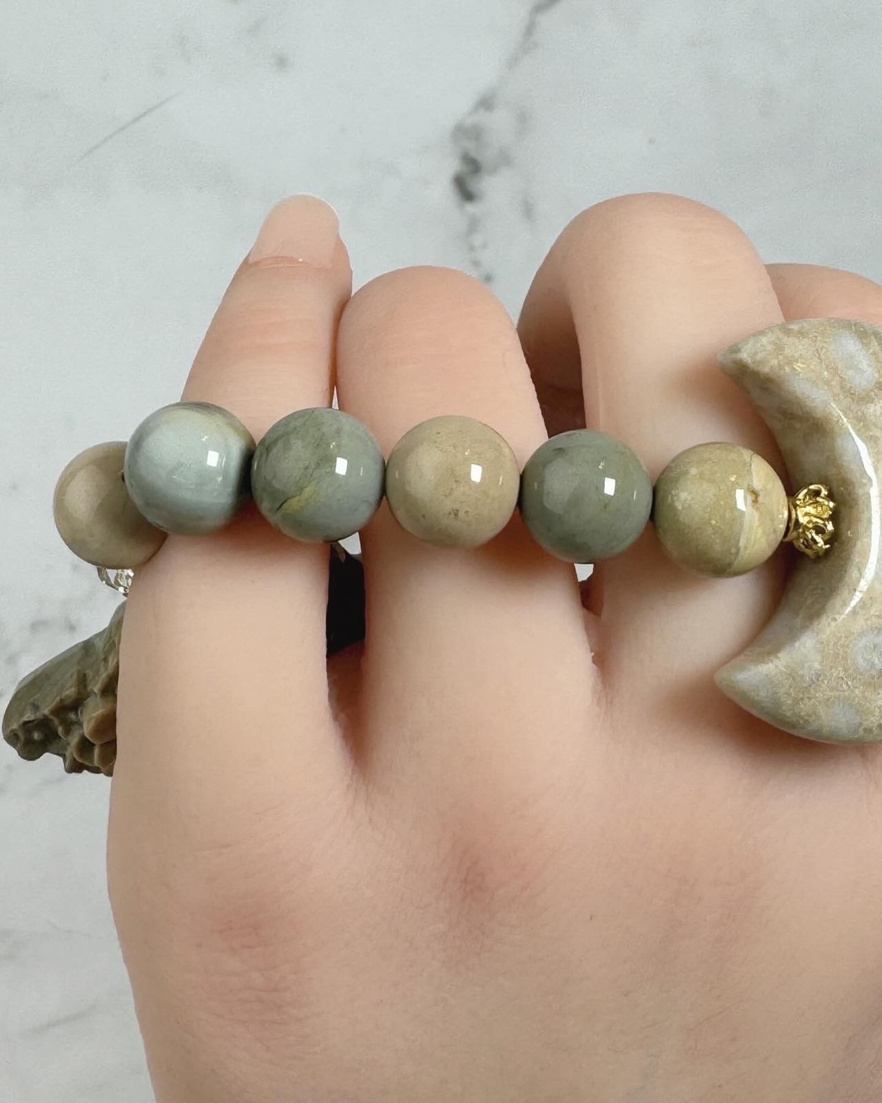 アラシャンアゲートの蝶々とフォッシャルコーラルの月のブレスレットになります。