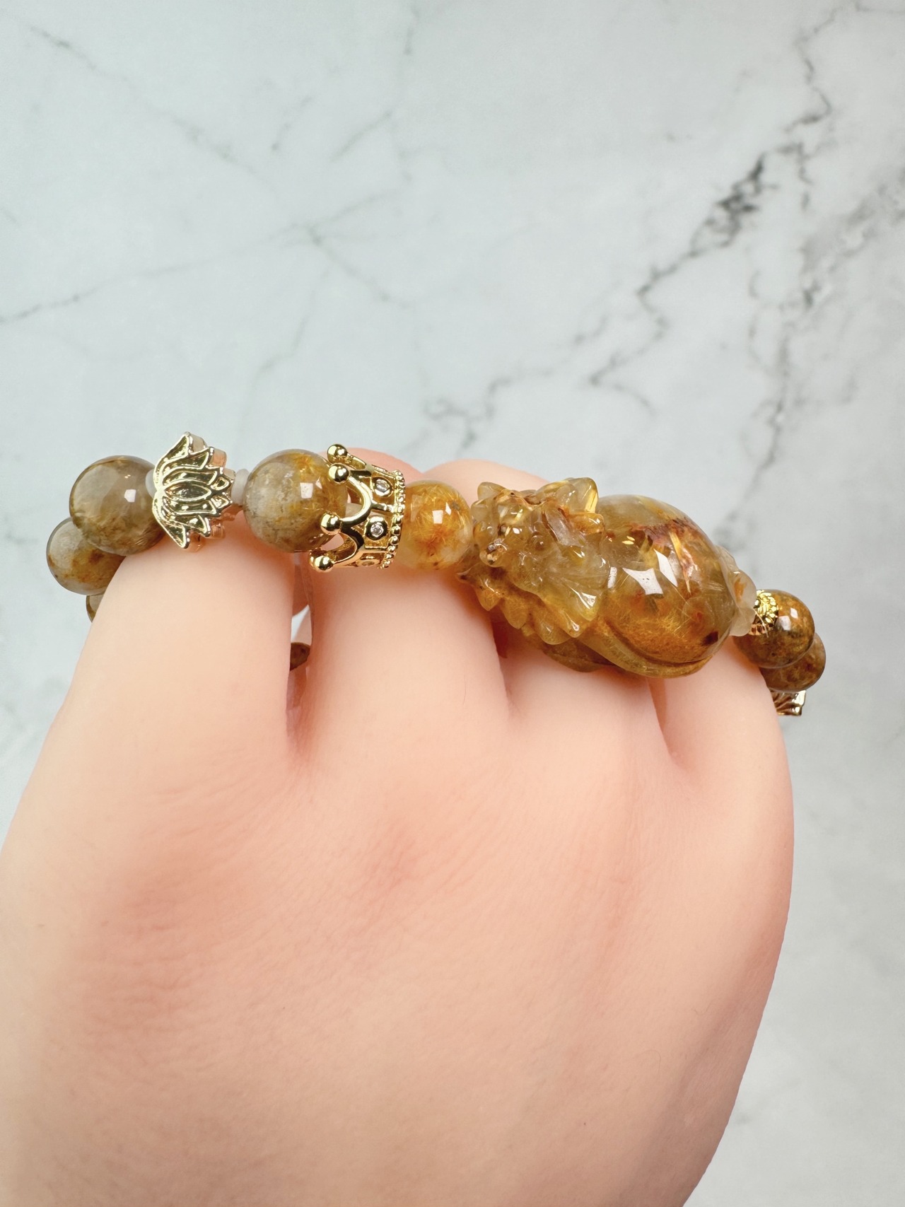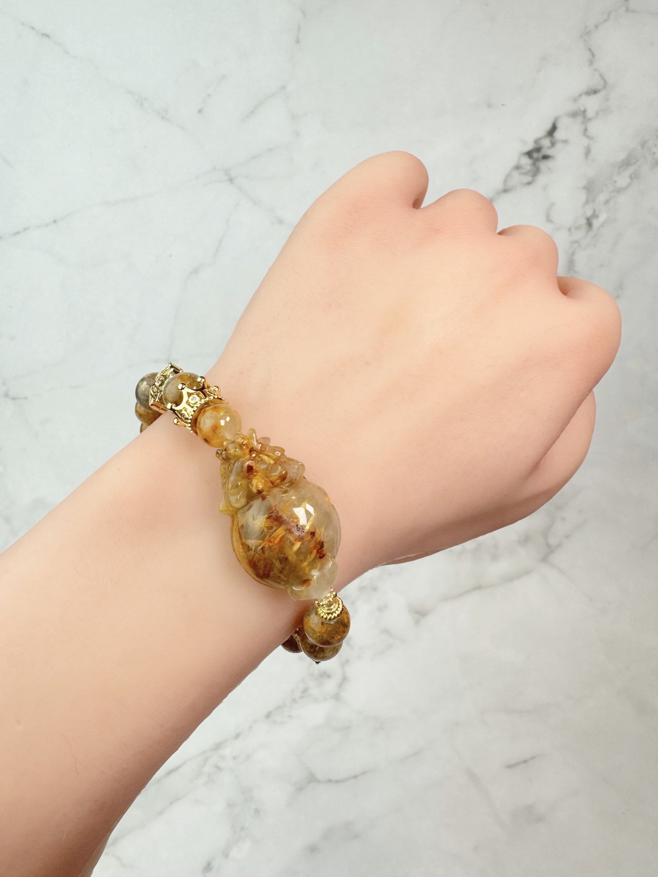 柔らかいフラワールチルと可愛らしい龍亀によって、ギラギラしない金運ブレスレットとなりました。色合い的にも何にでも合いやすいので、常に付けていられます。