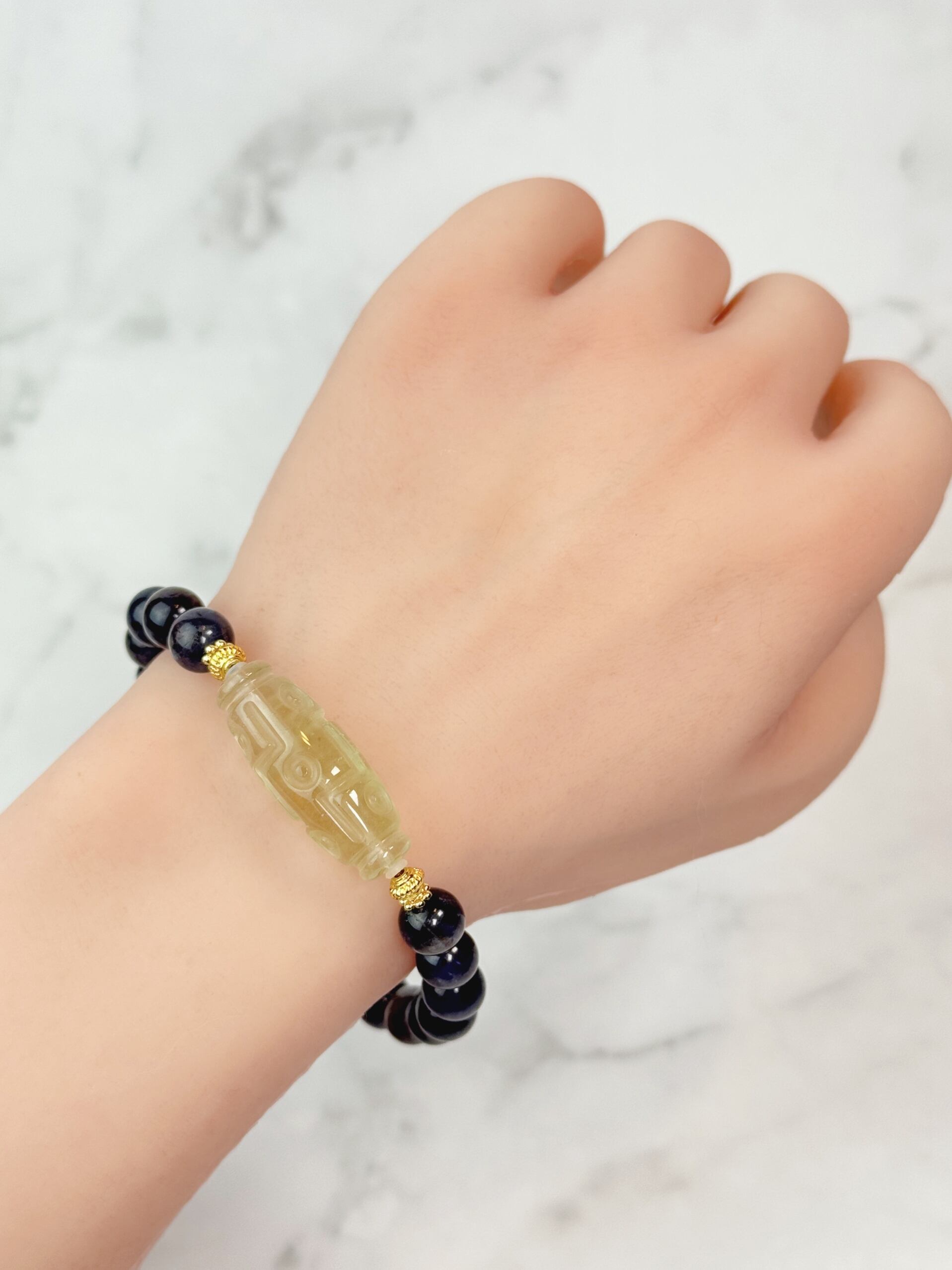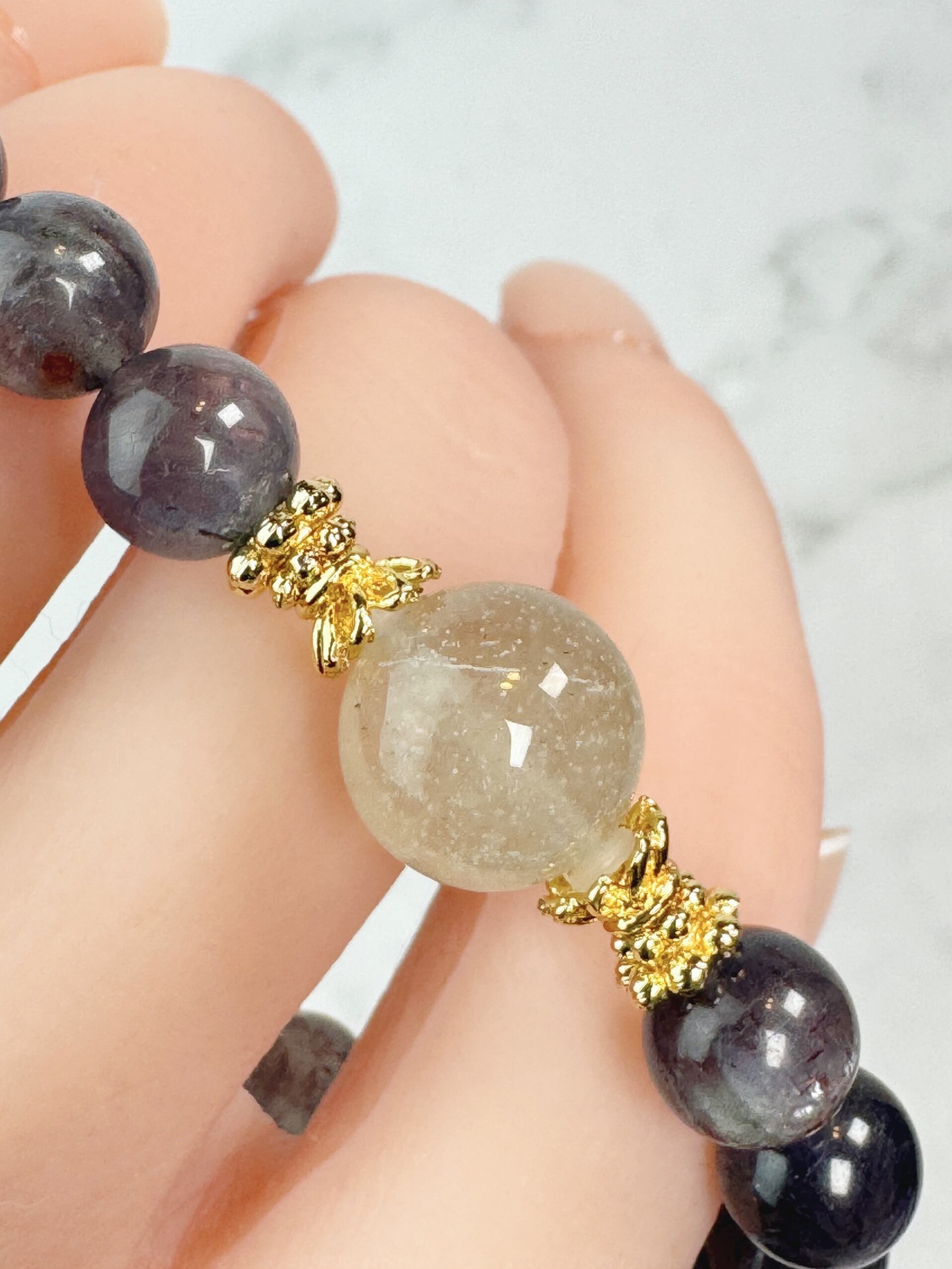 リビアングラスの逆九眼天珠とアイオライトサンストーンのブレスレットです。