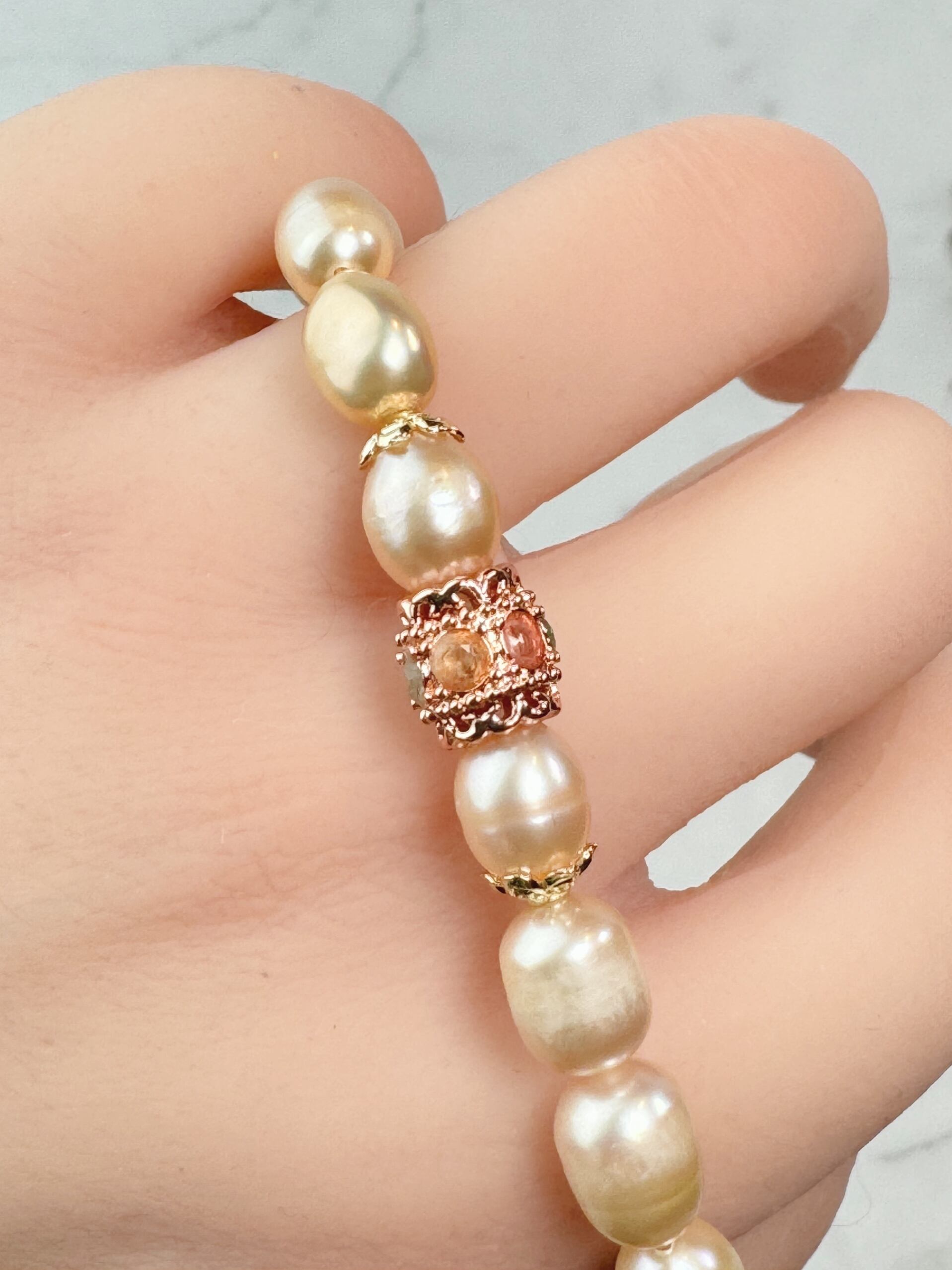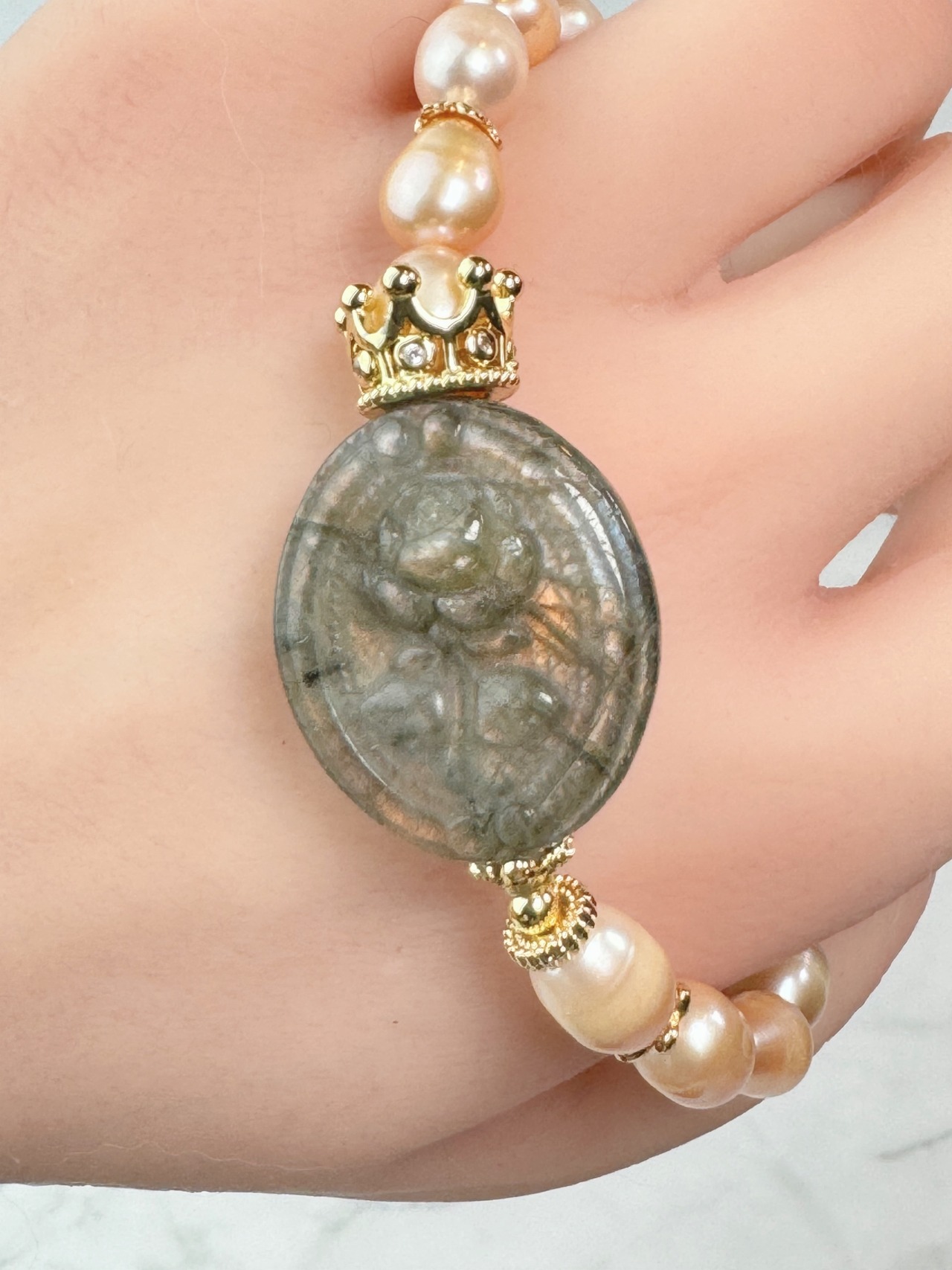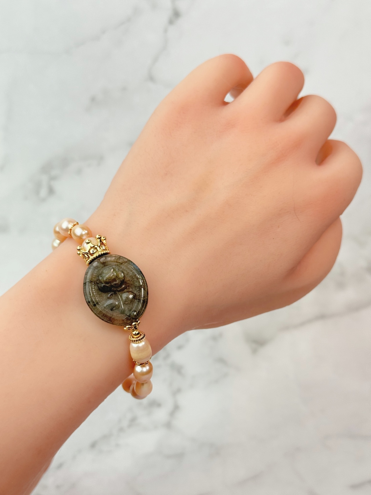 薔薇のラブラドライトと淡水パールのブレスレットになります。