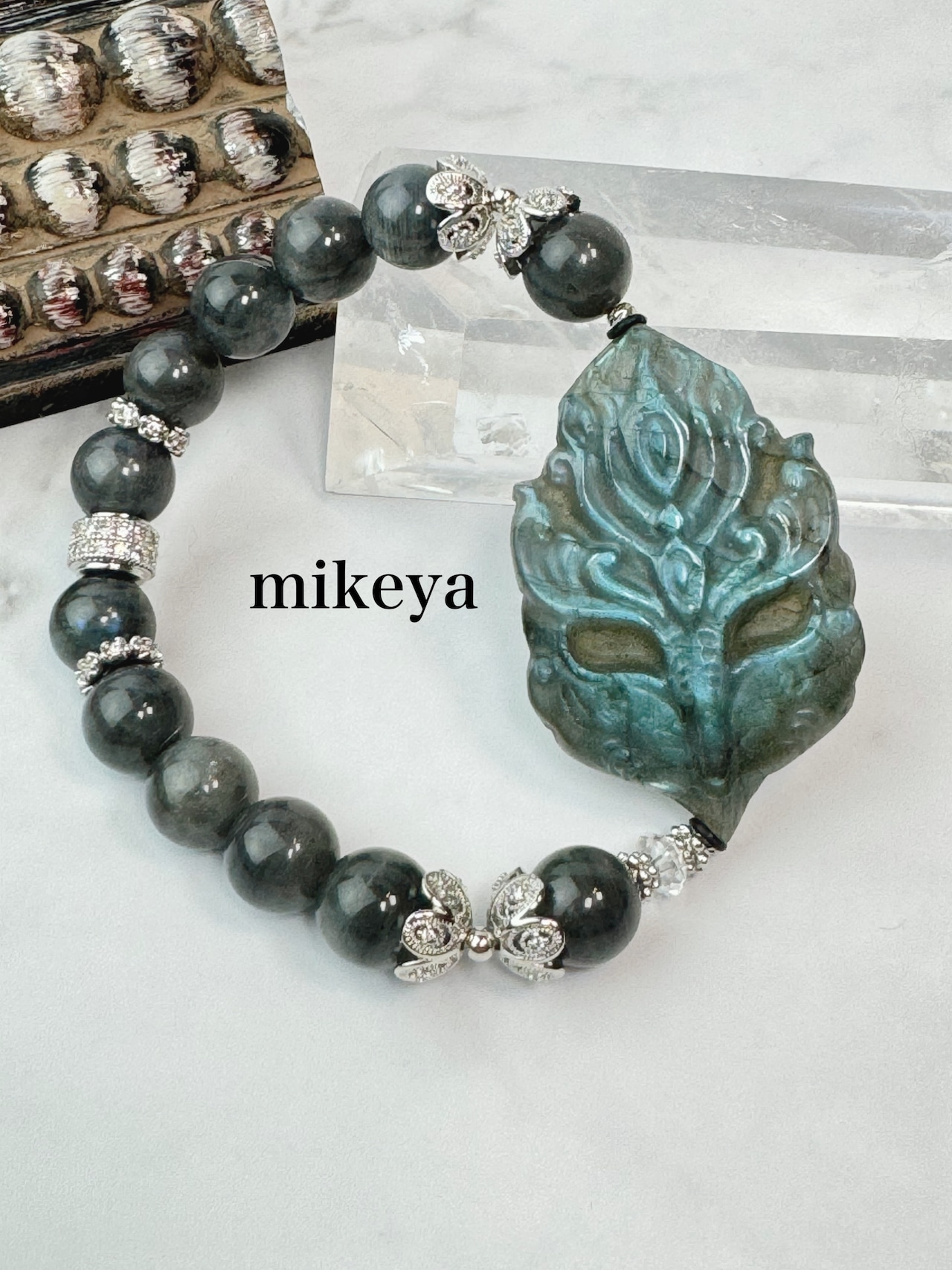 ラブラドライトの仮面のブレスレットになります。周りの石はブラックラブラドライトです。
