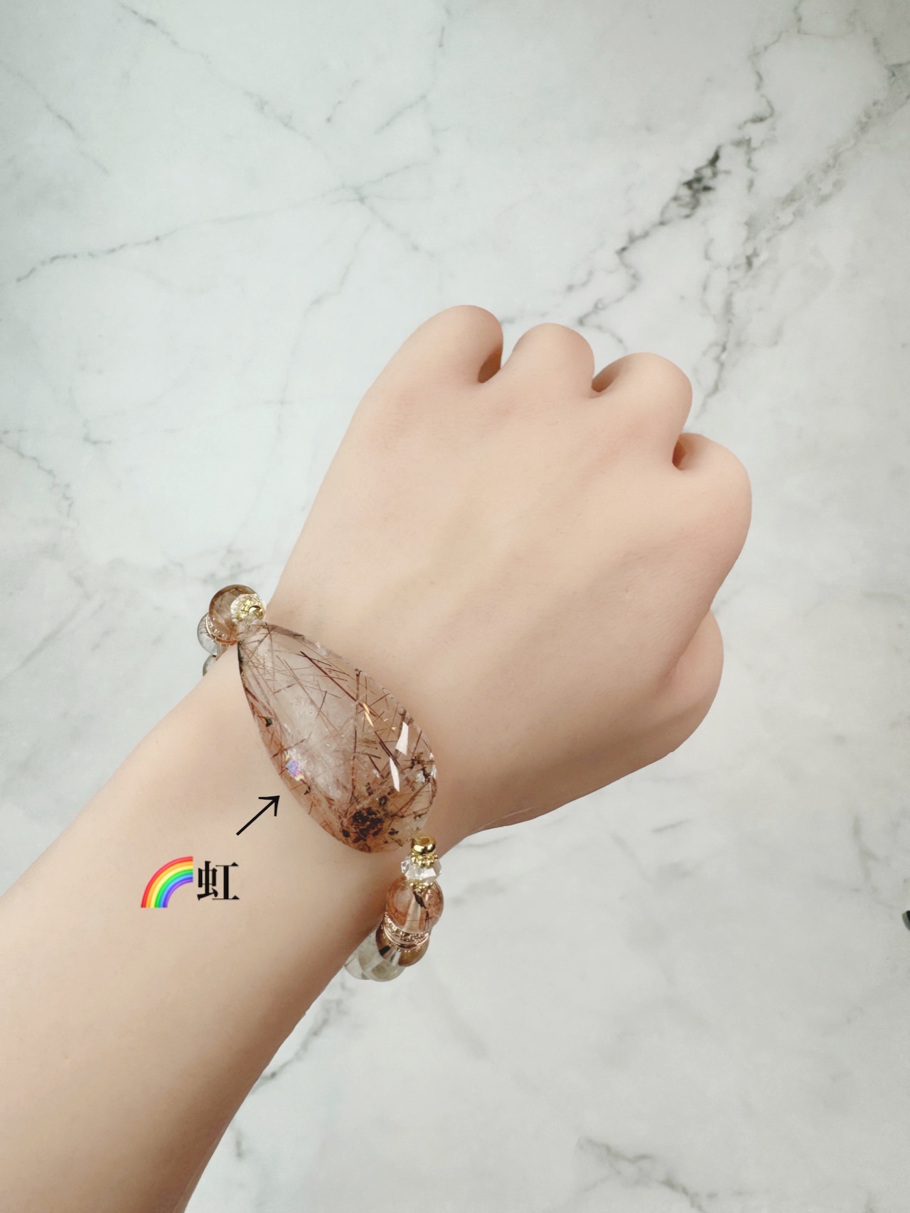 トップの石には虹が大きく入っており、眺めていても癒されます。