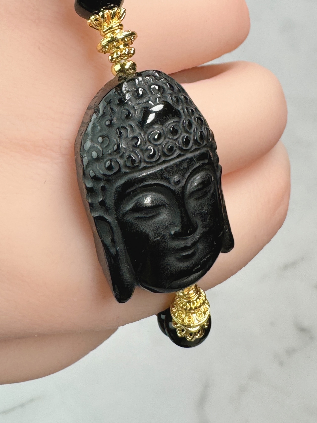 モリオン(観音様)、オニキス、菩提根(蓮)のブレスレットになります。