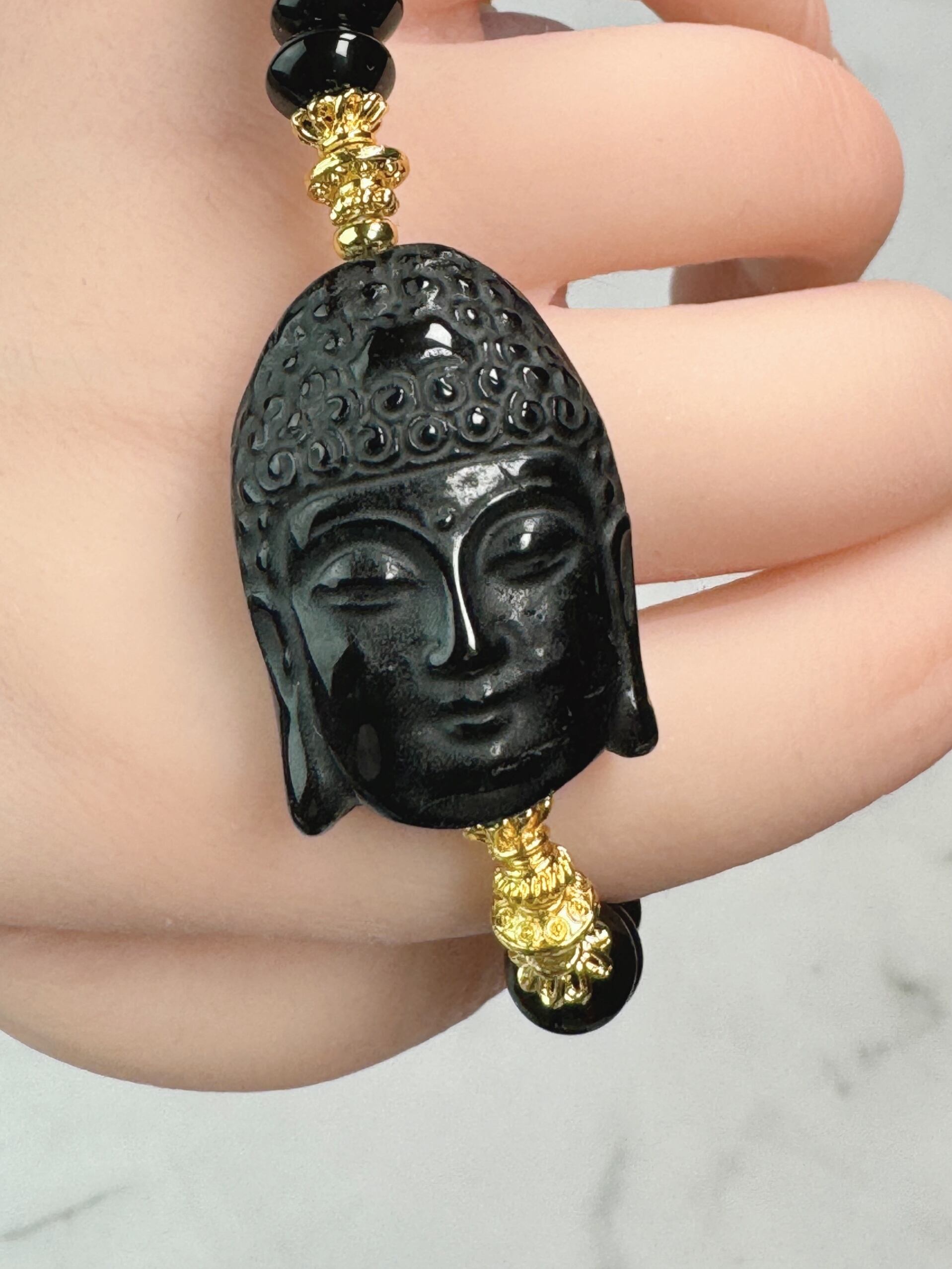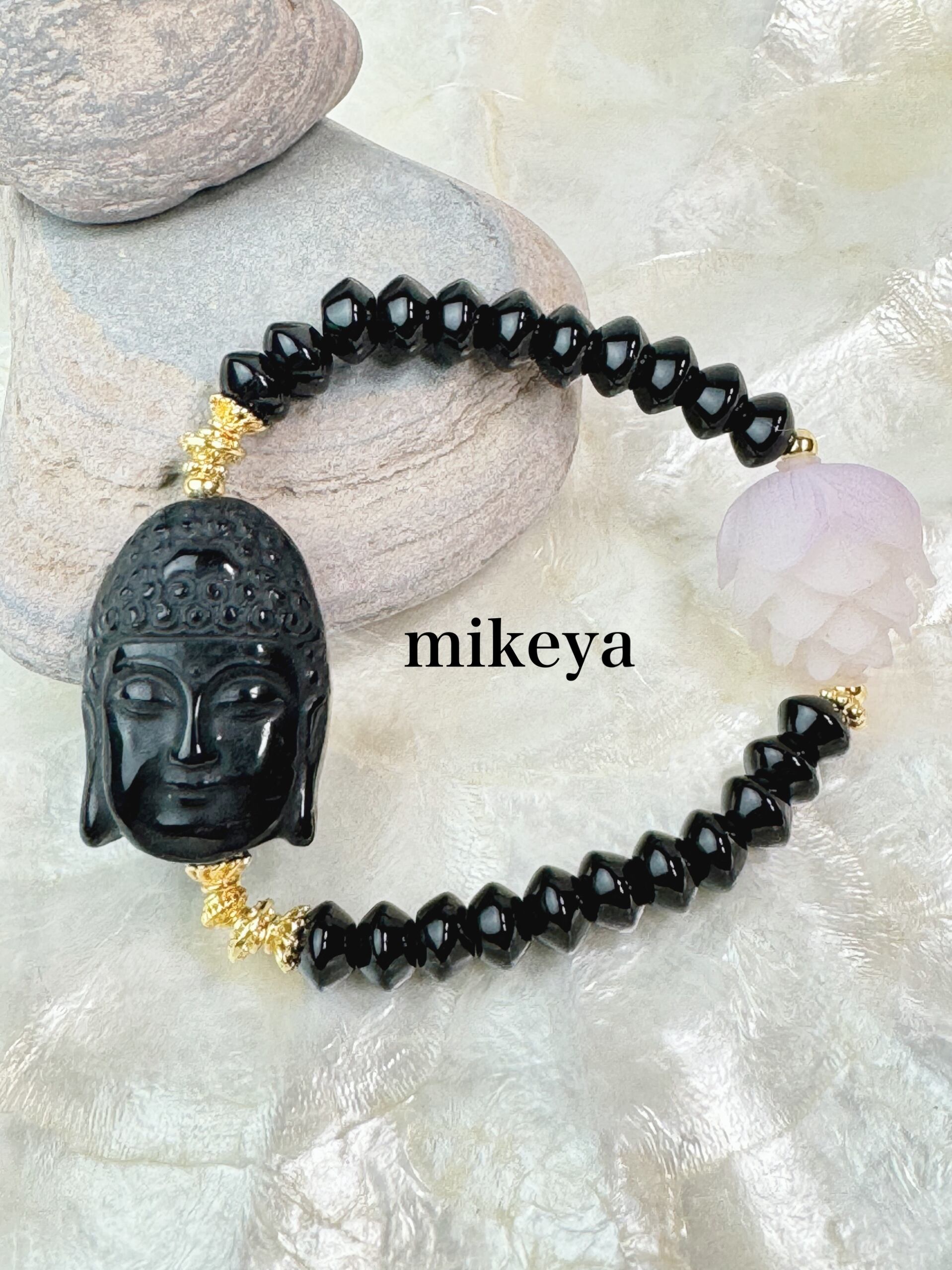 ブラックオブシディアン(観音様)、オニキス、菩提根(蓮)のブレスレットになります。