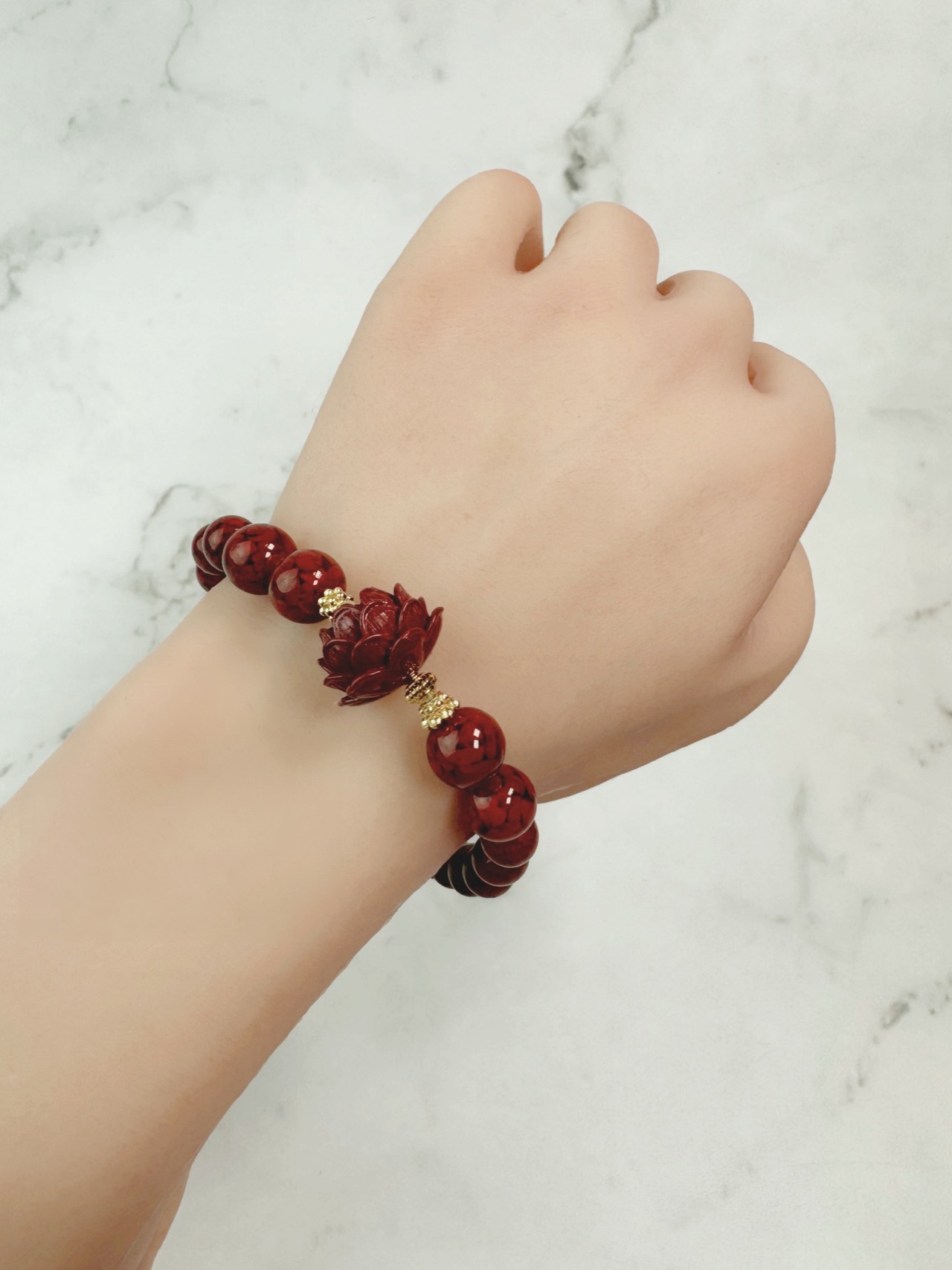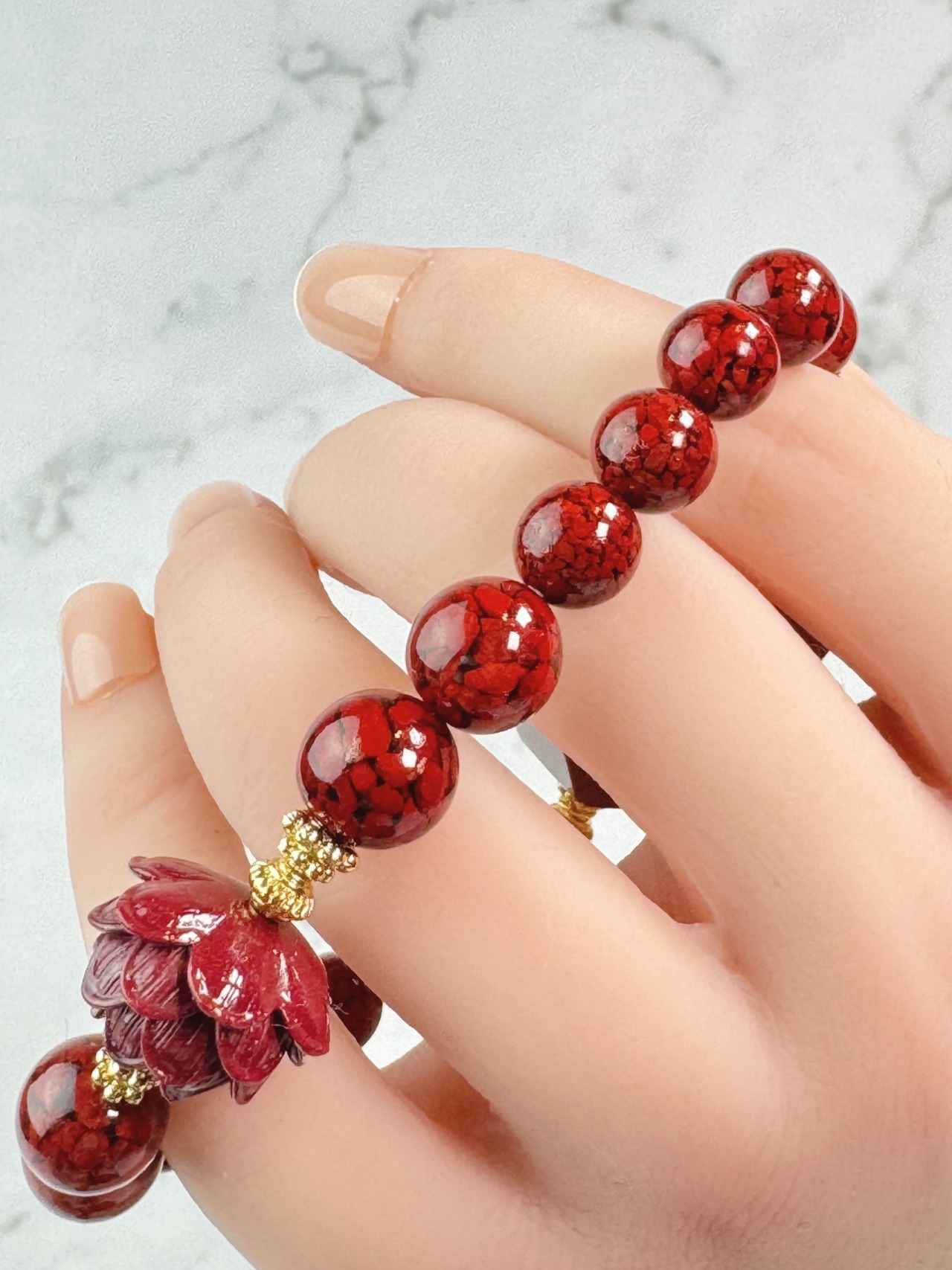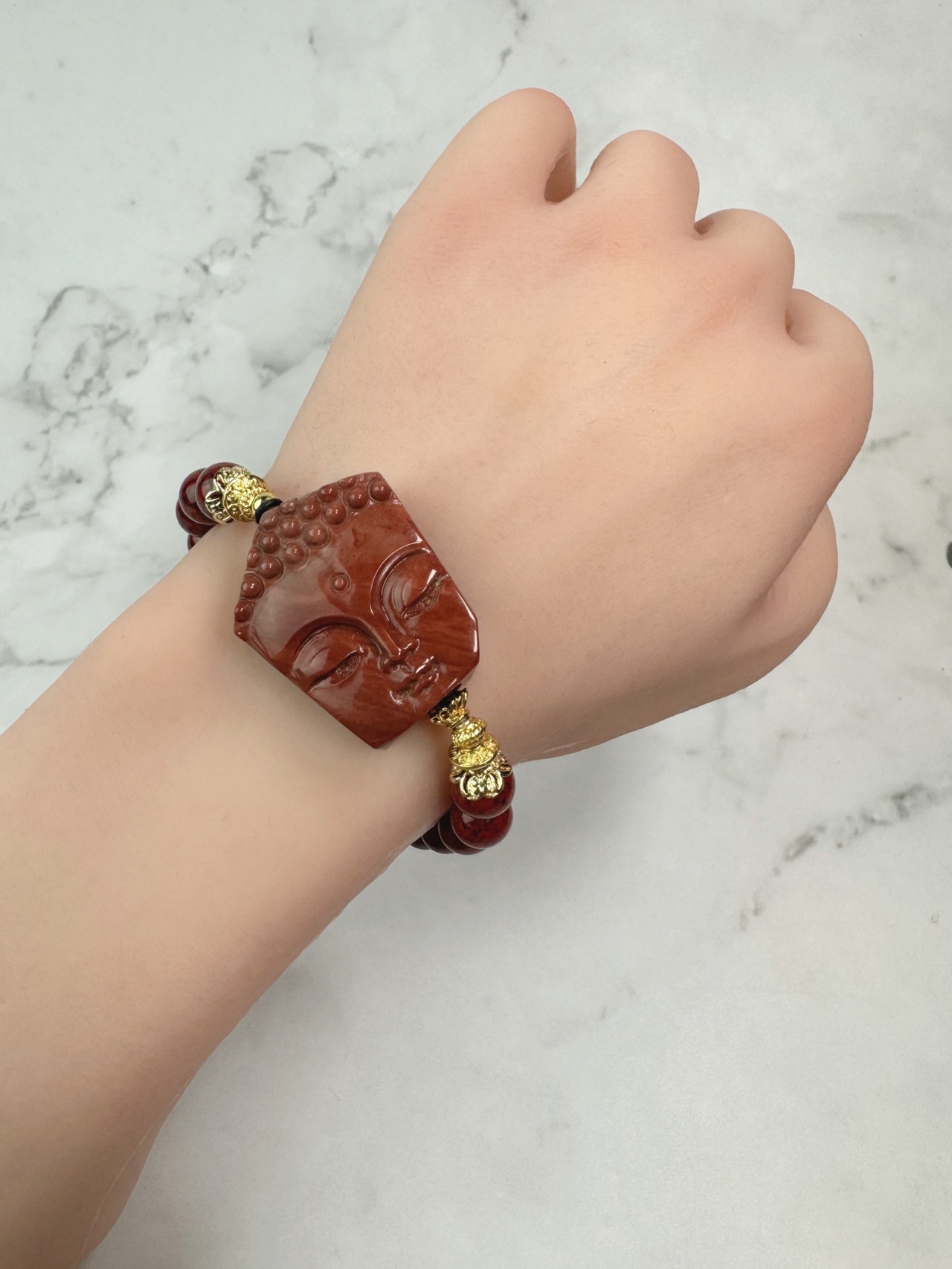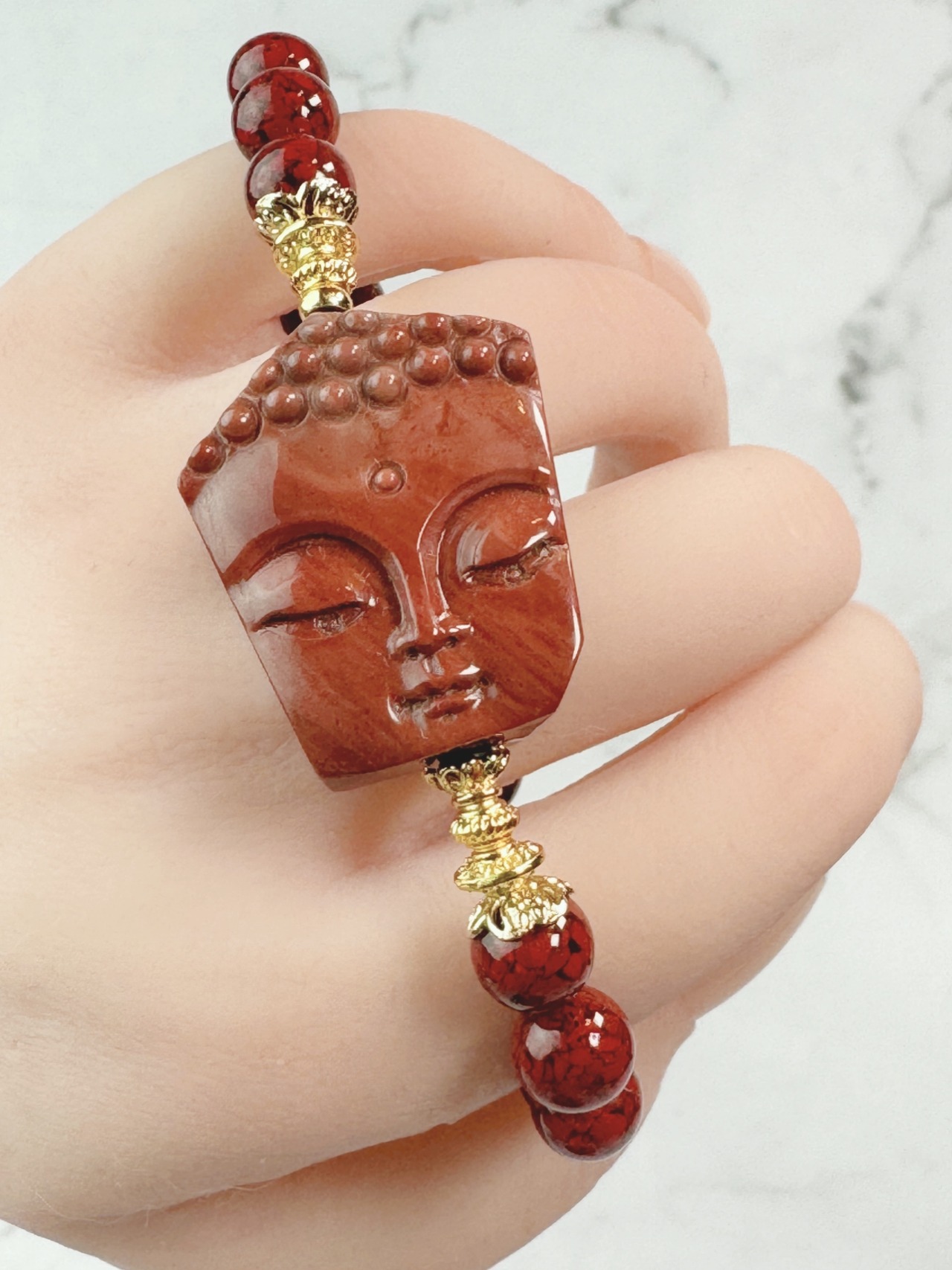 赤い観音様が、子供のお顔にも見え、愛らしいブレスレットとなりました。