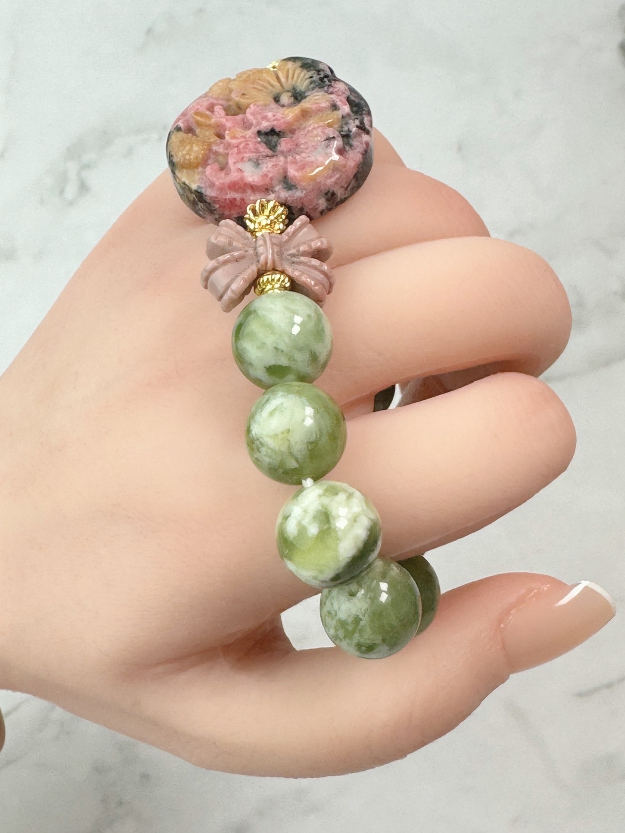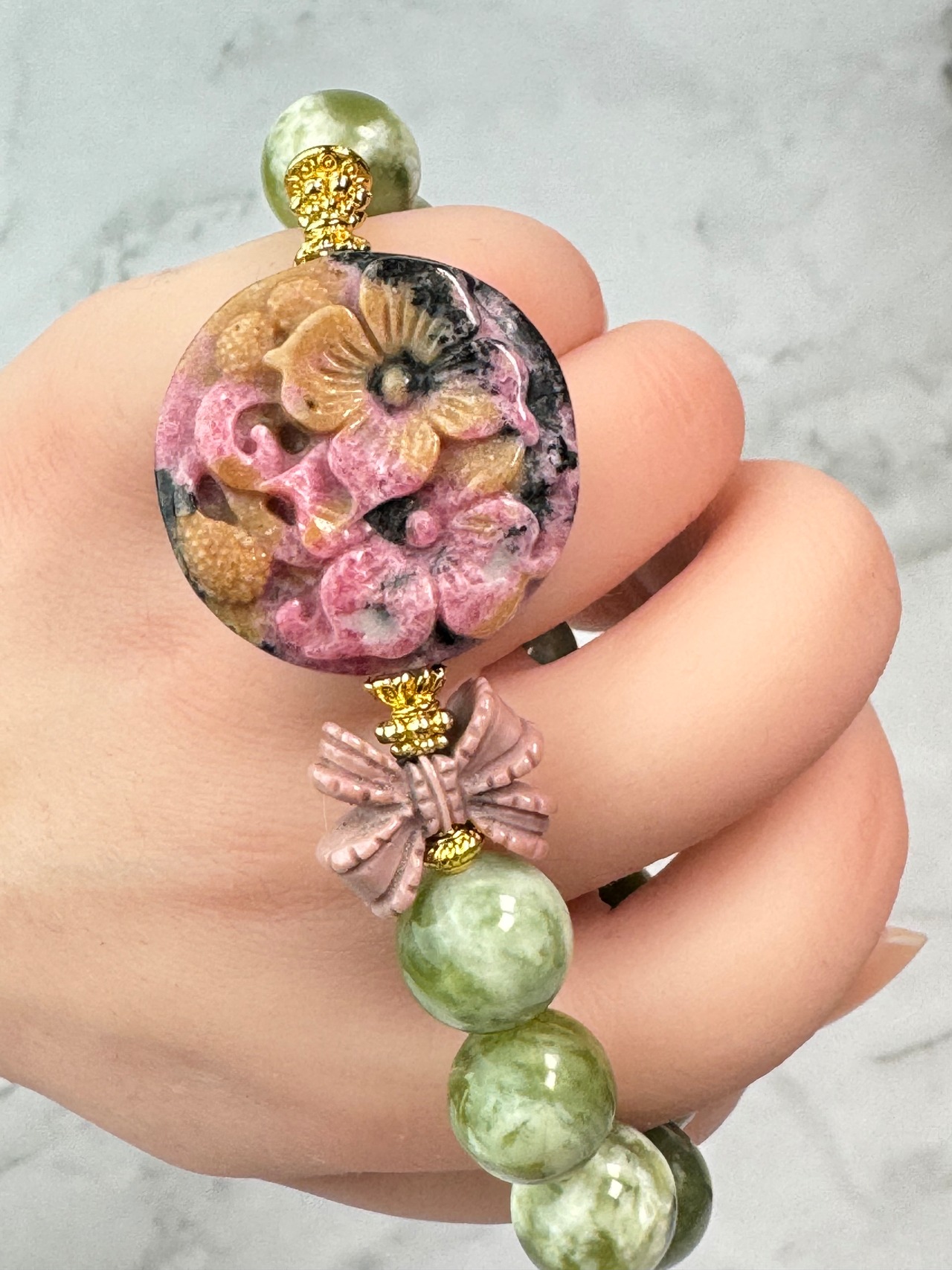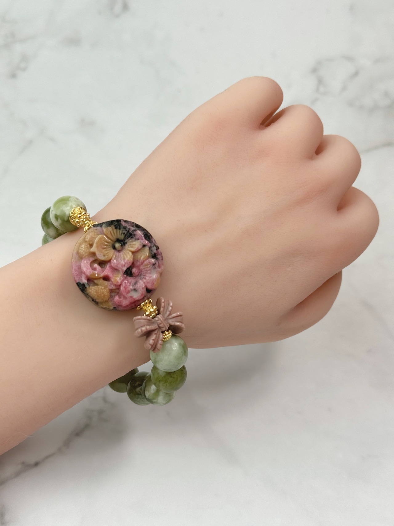 ロードナイト(花)、アラシャンアゲート(リボン)、ボーウェナイトのブレスレットです。
