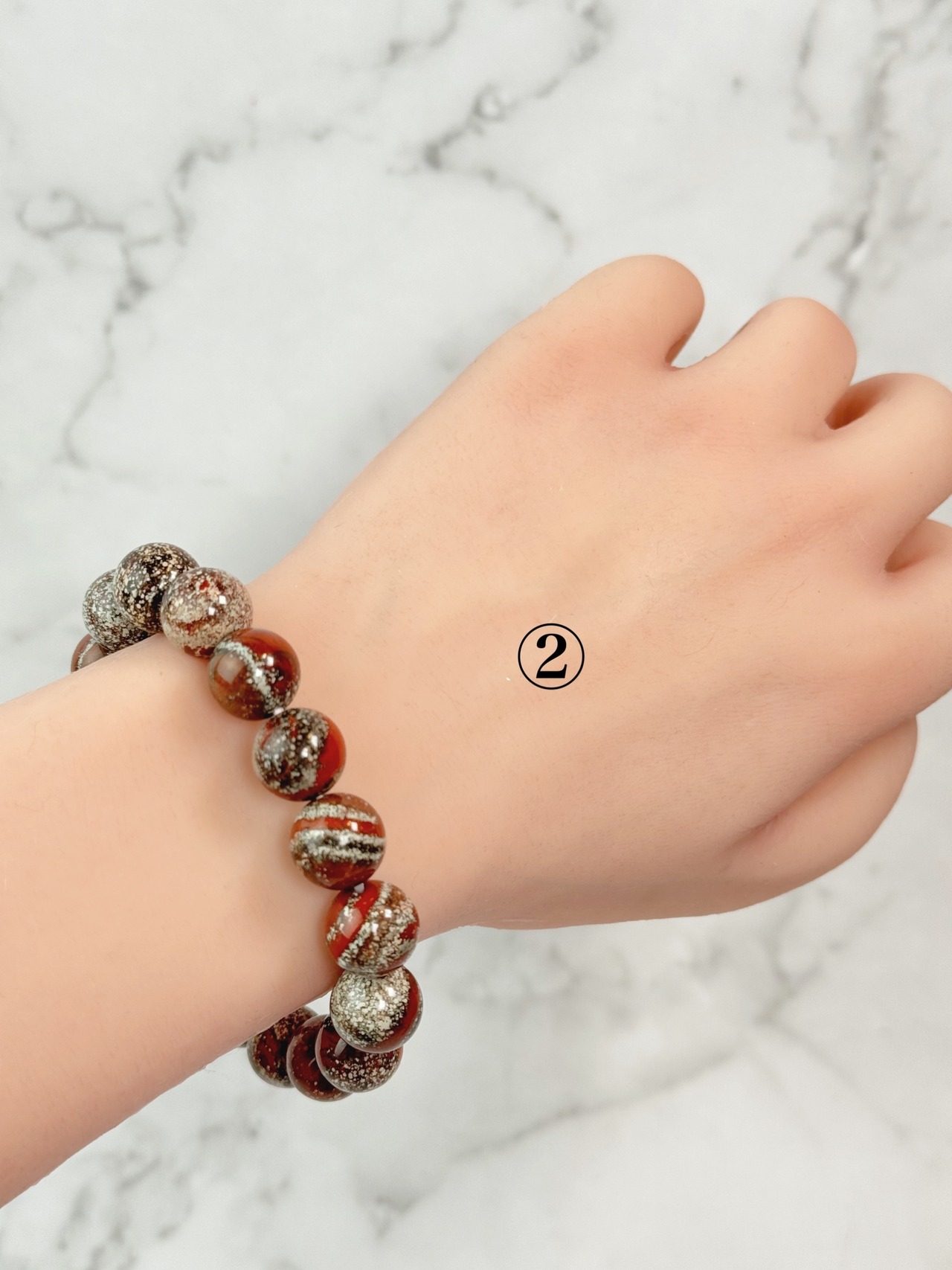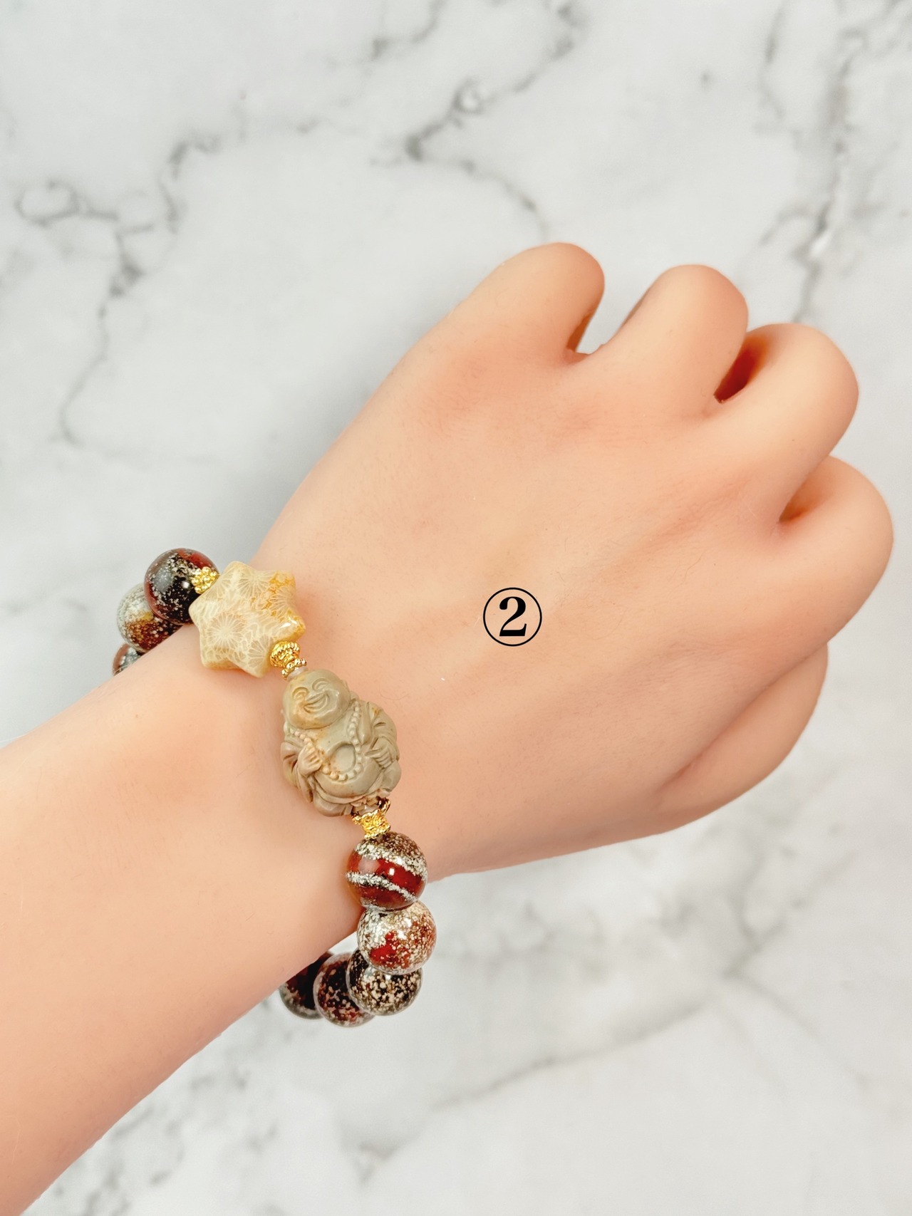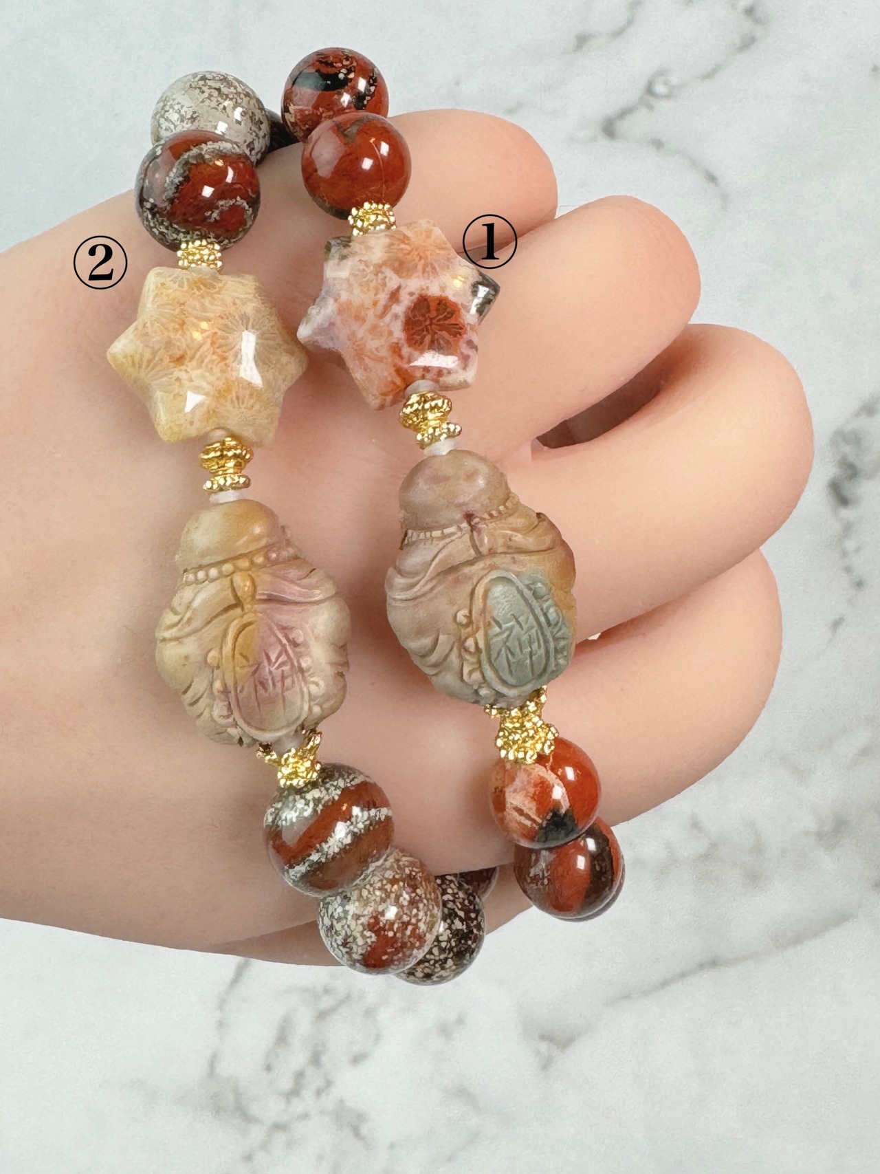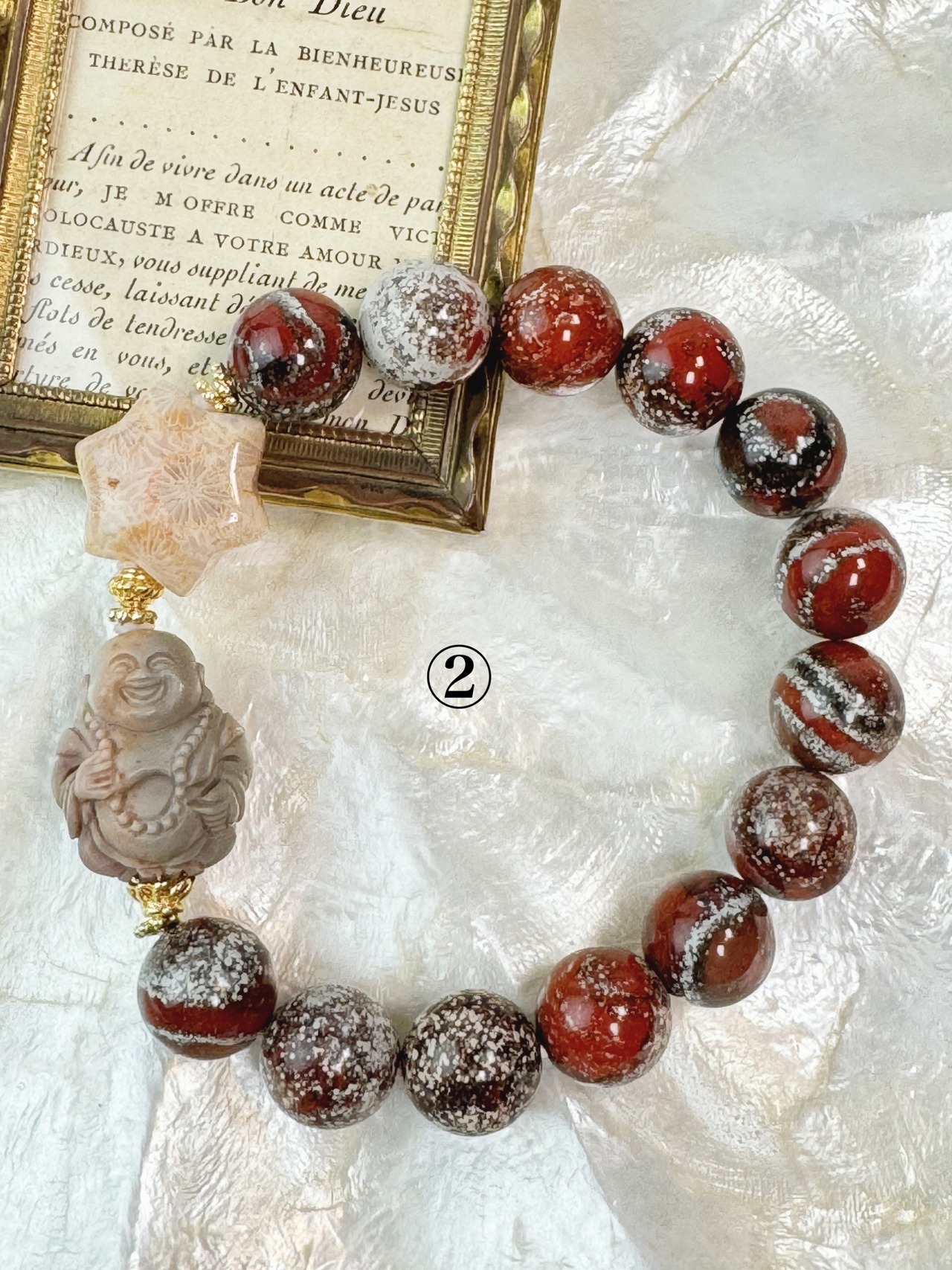アラシャンアゲート(布袋様)、フォッシャルコーラル(星)、レッドジャスパーのブレスレットになります。