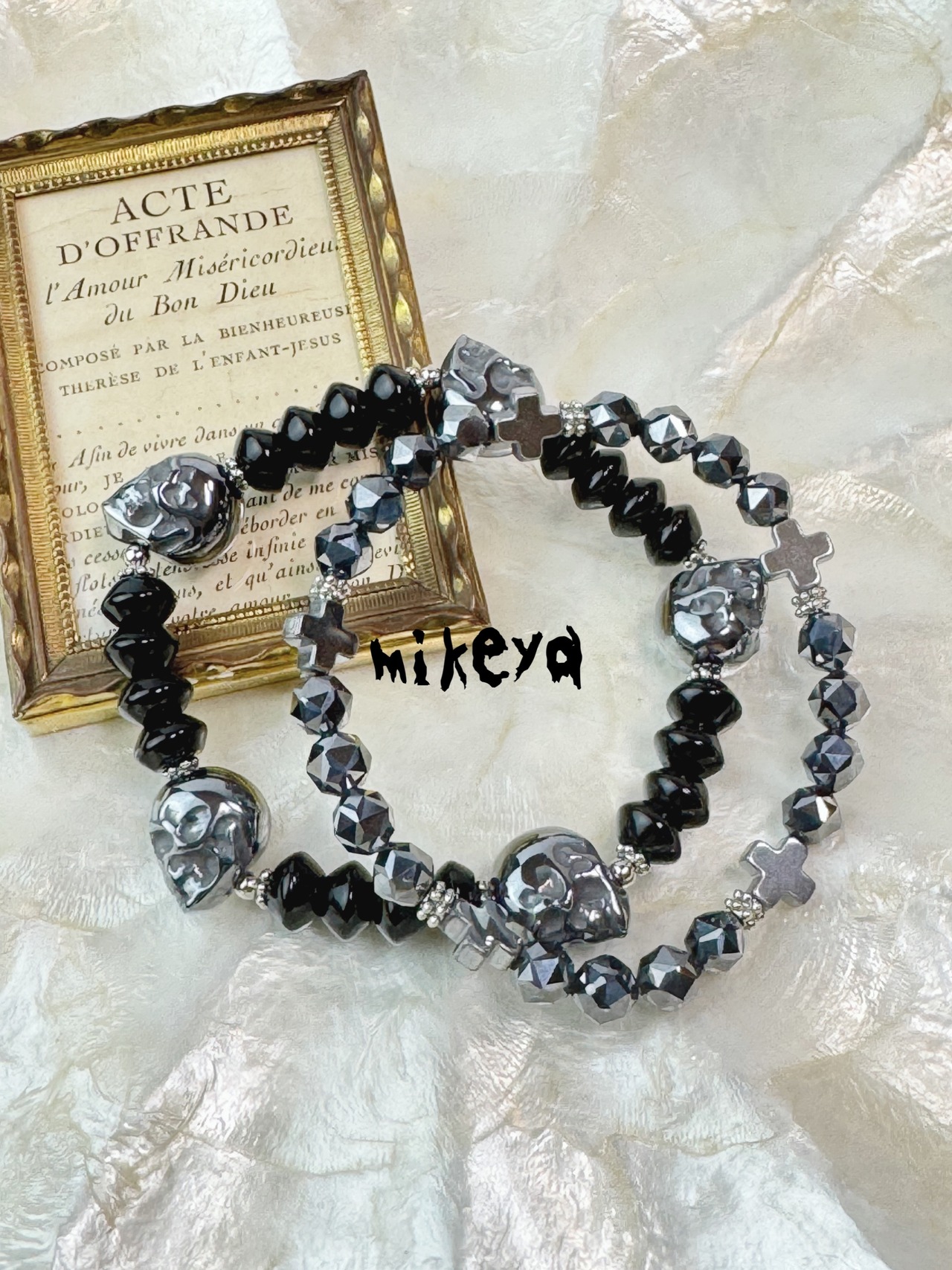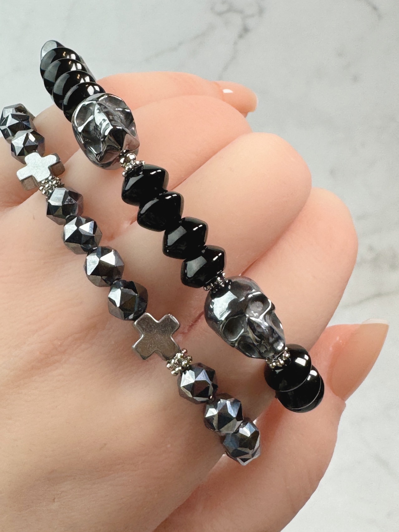 テラヘルツのスカルとオニキス、ヘマタイトのクロスとテラヘルツの2本でセットのブレスレットとなります。
