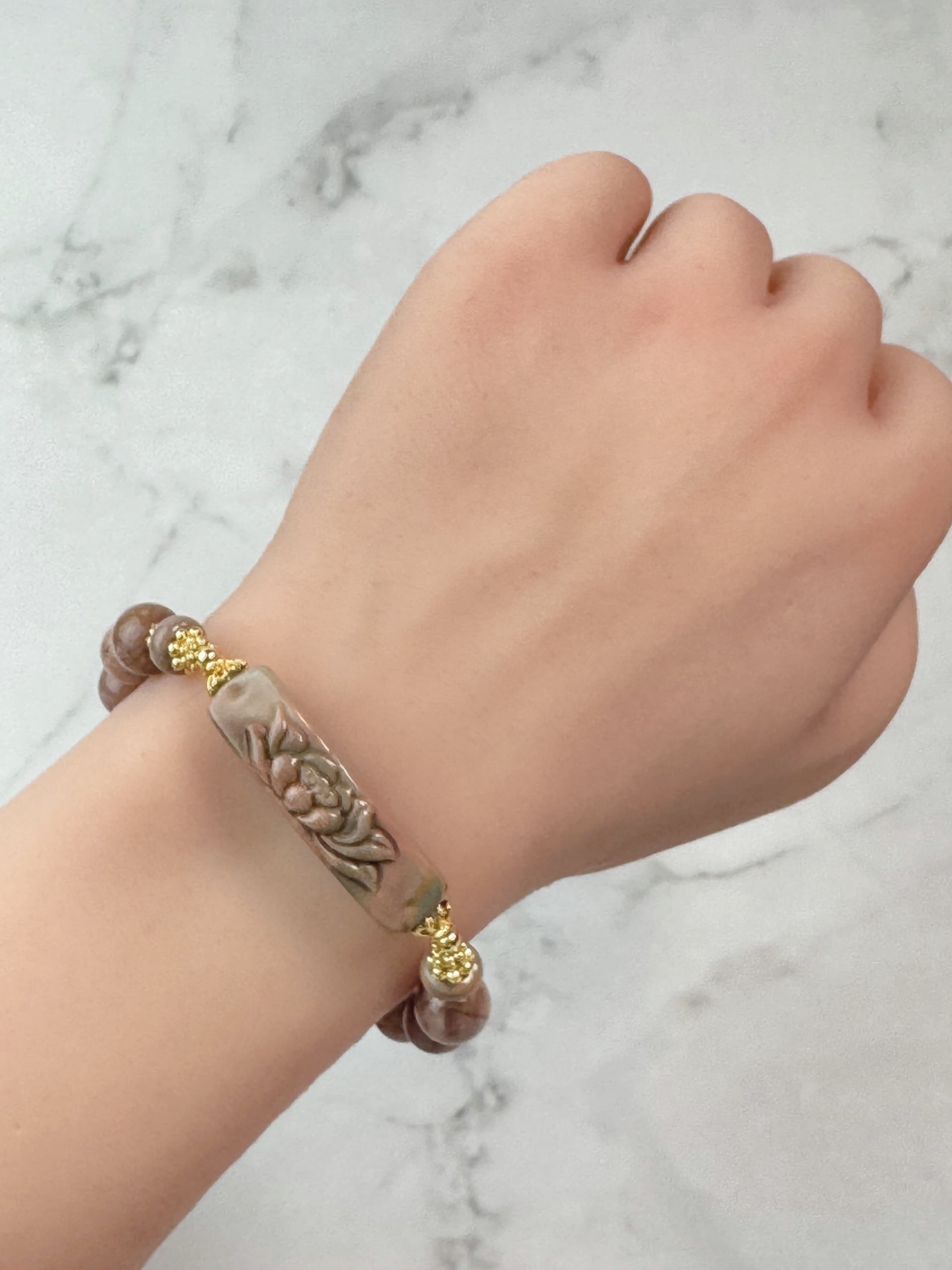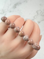 くすみピンクが肌馴染みが良く、手が綺麗に見え、どんな服装にも合うブレスレットになっております。
