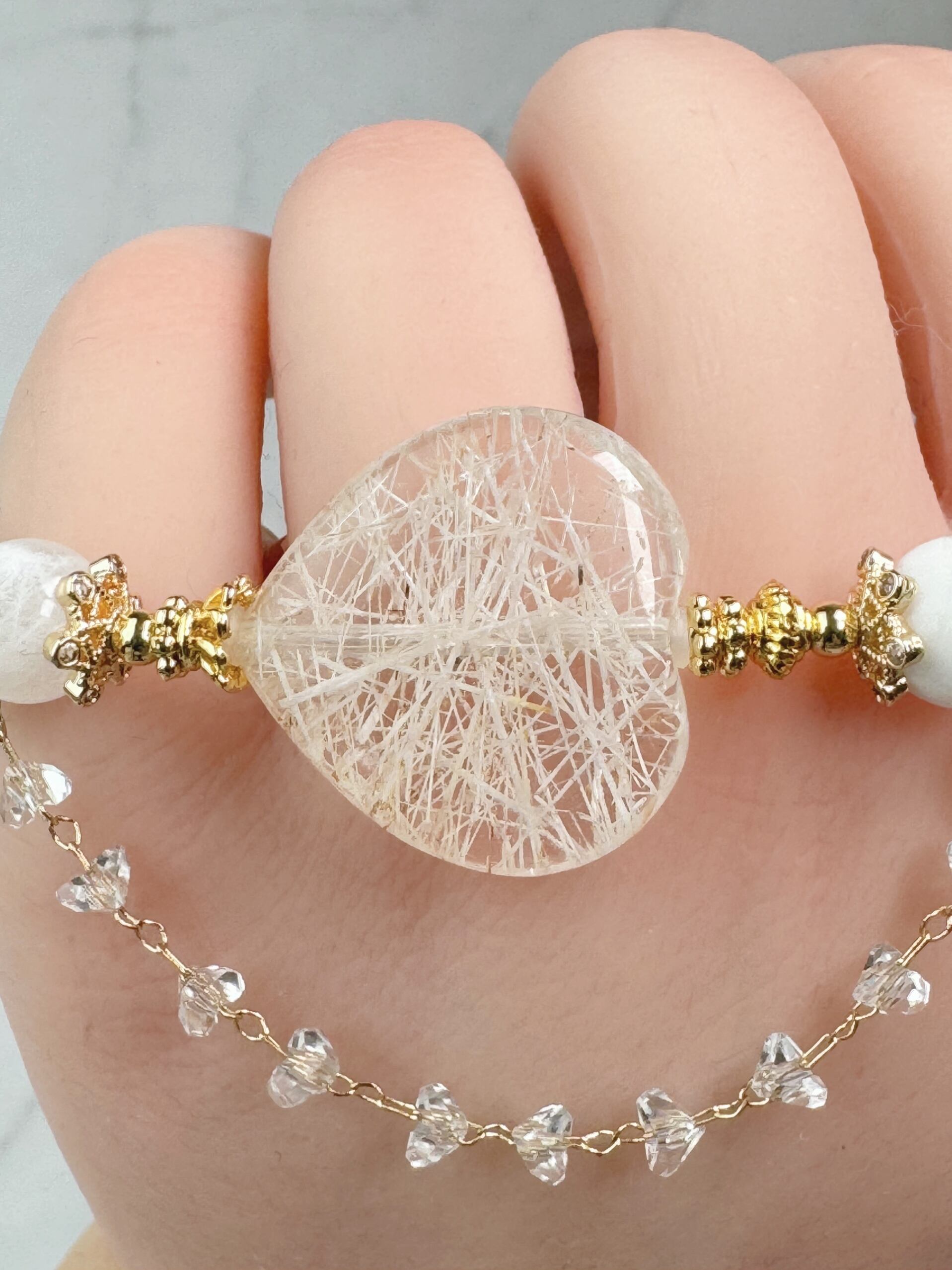 透明感高いハートのスノーホワイトルチルと、雪のようなホワイトセリサイトインクォーツの組み合わせで、可愛らしいブレスレットとなりました。