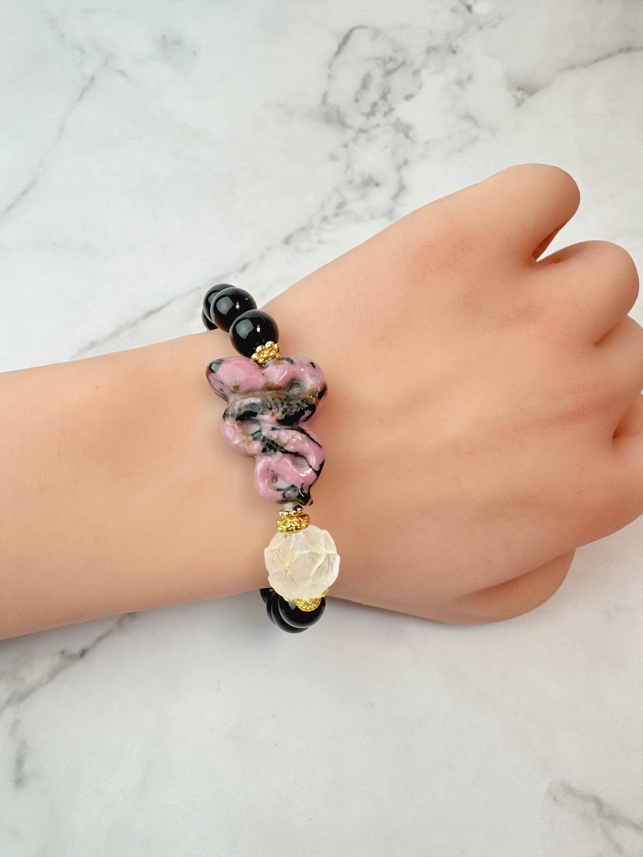 蓮は幸運を引き寄せると言われているので、悪い物を寄せ付けず、より良い人間関係を築いていけるブレスレットとなりました。ピンクでも大人っぽく仕上がっております。