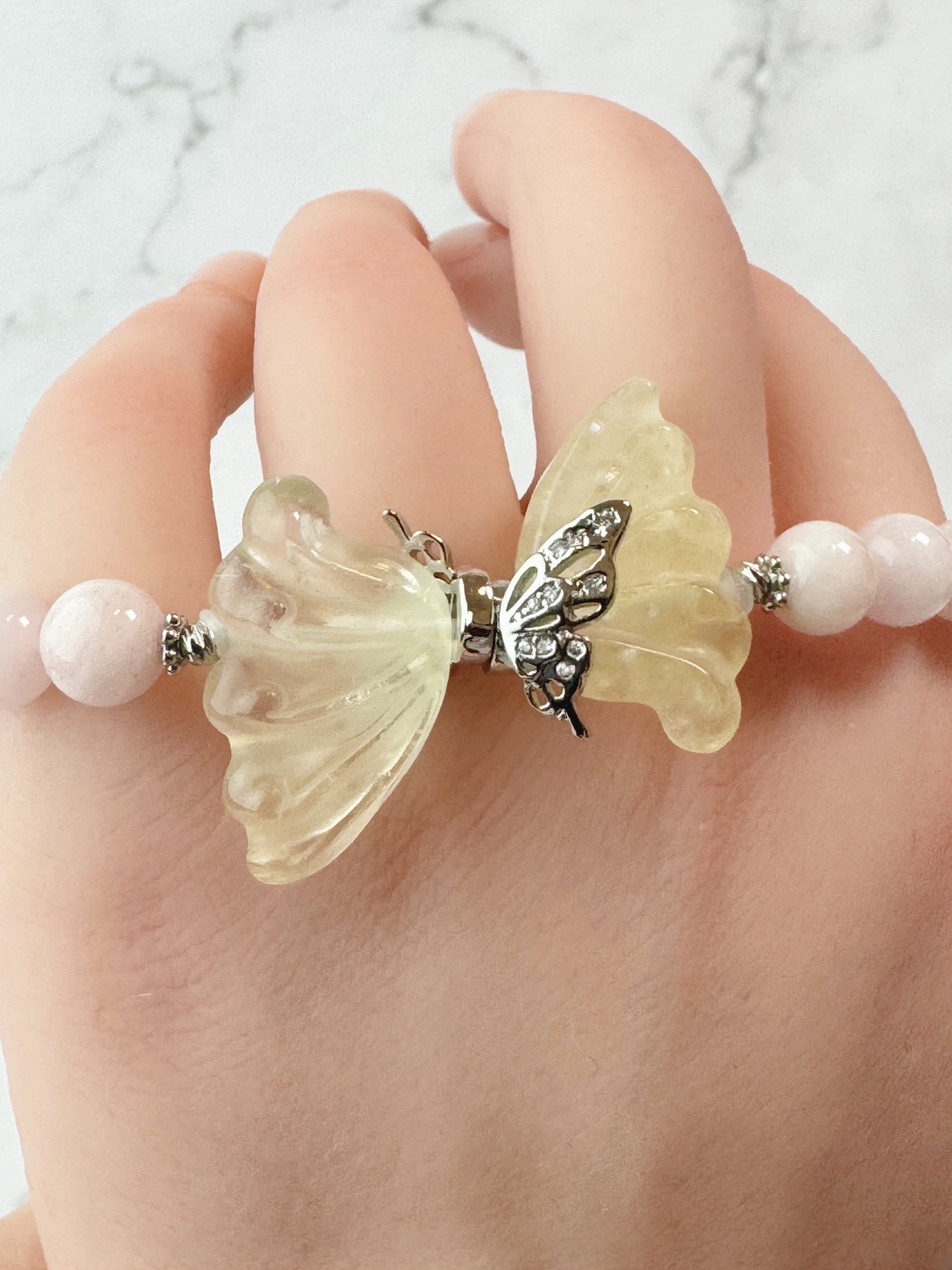 シトリン(羽)とモルガナイトのブレスレットになります。