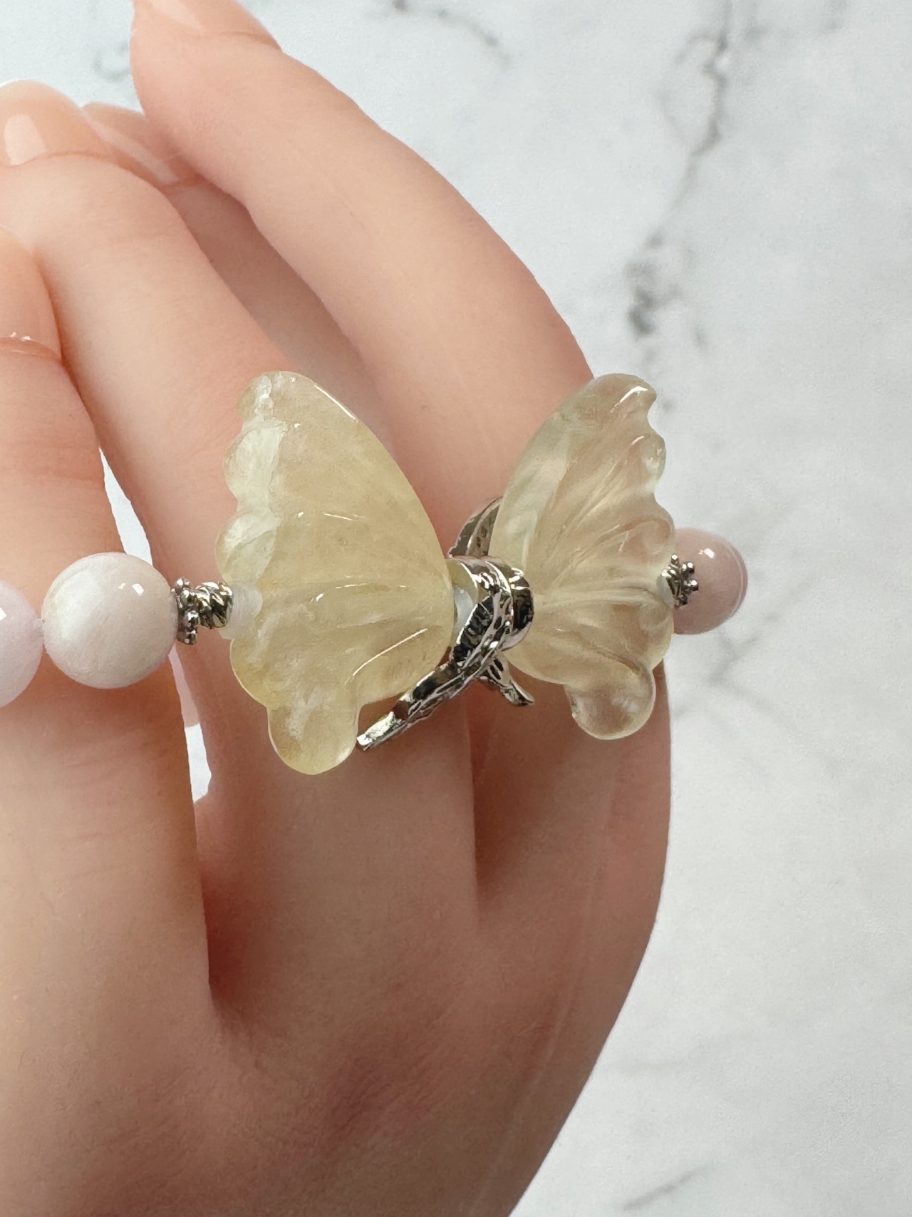 シトリンの羽は2枚合わせて使ってあるため、ブレスを外した時に、クルッと回ってしまうかもしれません。真ん中の蝶々のアクセサリーも2つを合わせているので同様です。(8枚目の写真参照)